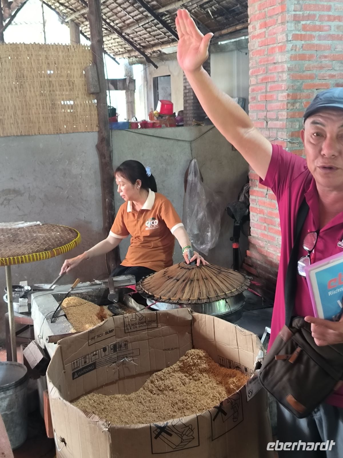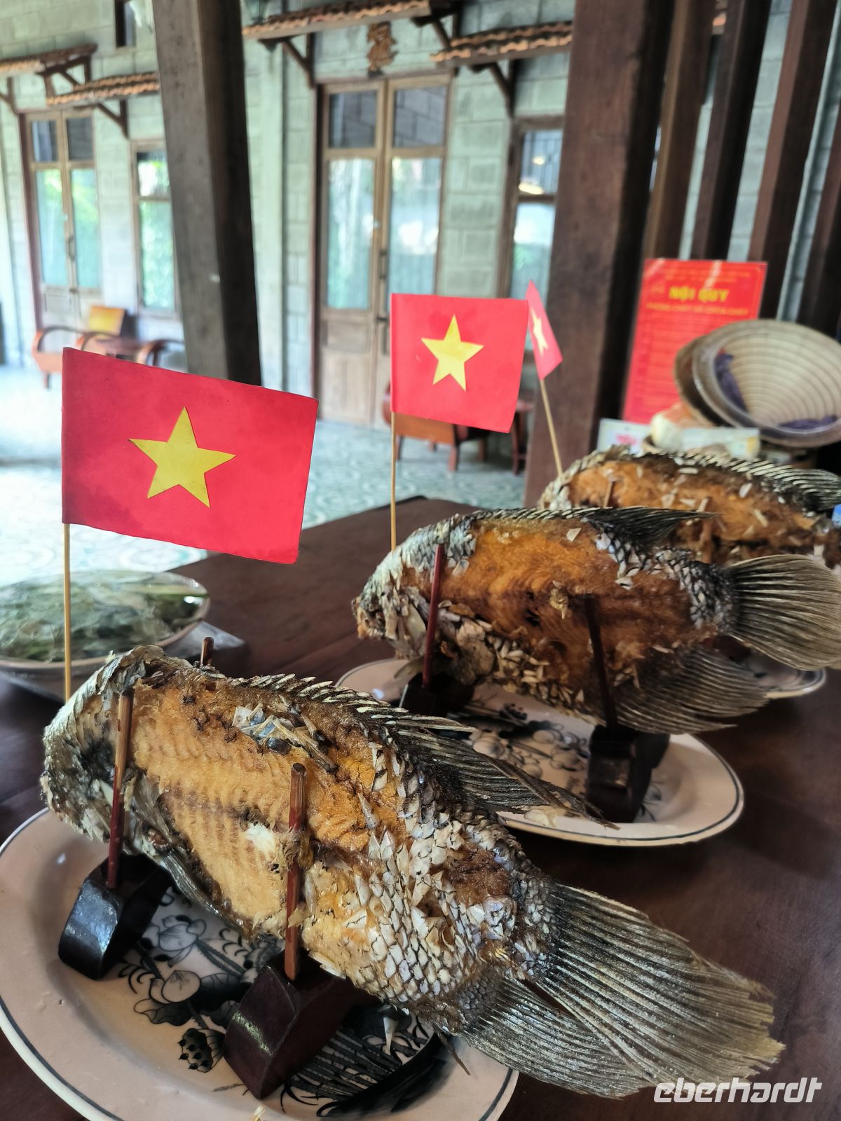 Ein kulinarischer Höhepunkt ist das gemeinsame Elefantenohr-Fischessen in einem lokalen Gartenrestaurant. Zur Verdauung gibt es von unserem Guide Binh noch einen Reisschnaps.
