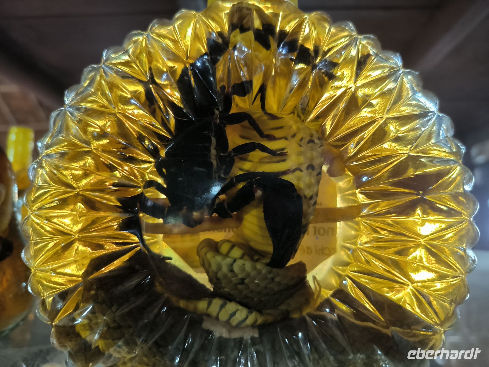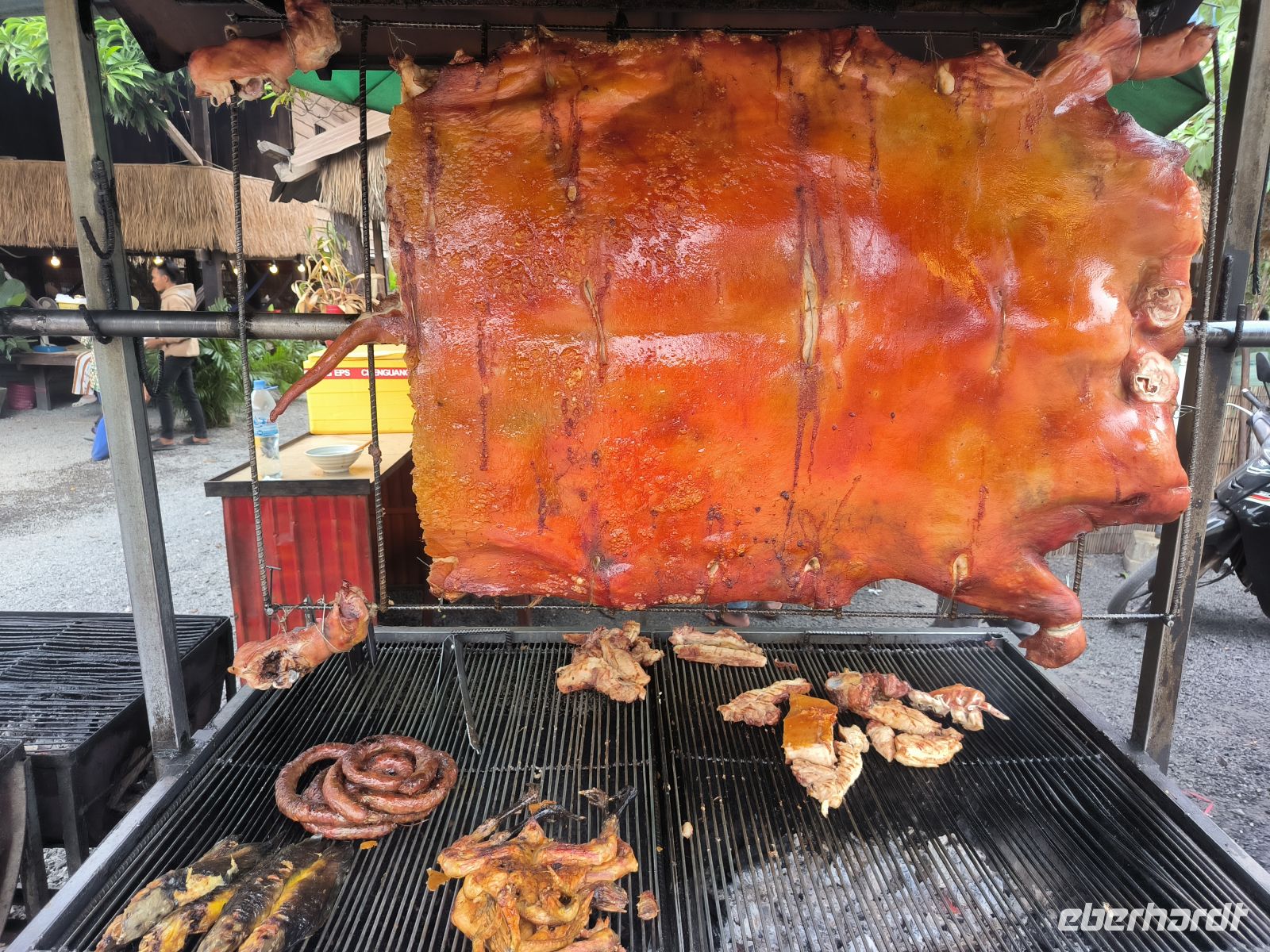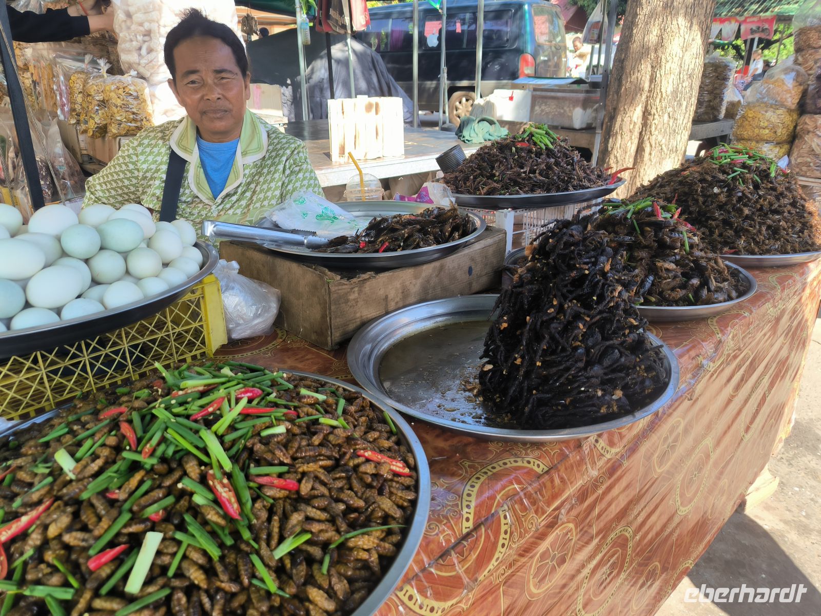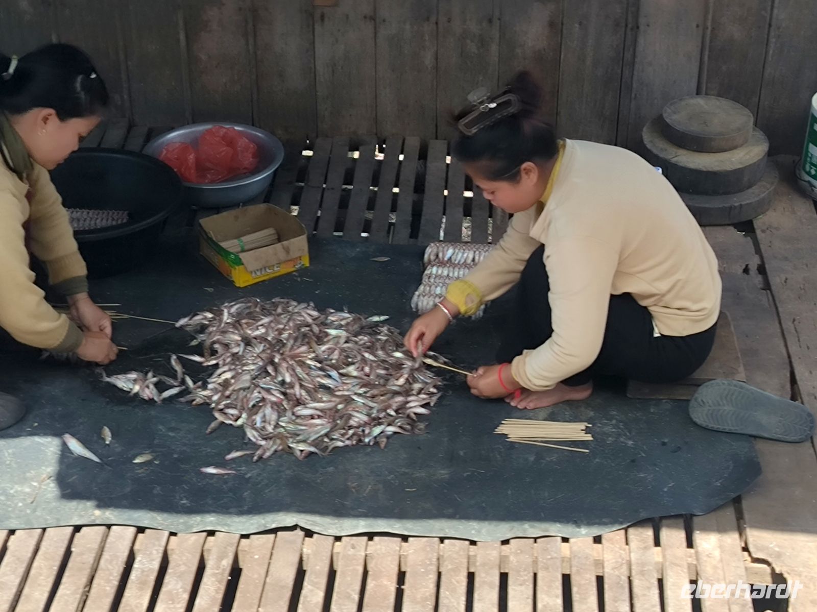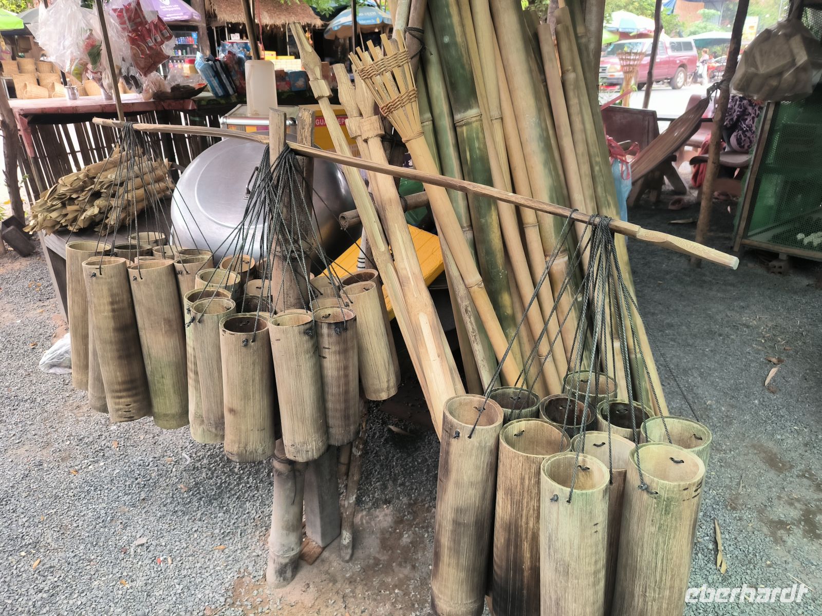 Am Berghang besuchen wir etwas skeptisch einen Markt des Thai-Volkes, wo Hühner und Ratten geschlachtet und gebraten werden, Klebreis in Bambusröhren gekocht wird und die hygienischen Bedingungen von unseren weit entfernt sind.