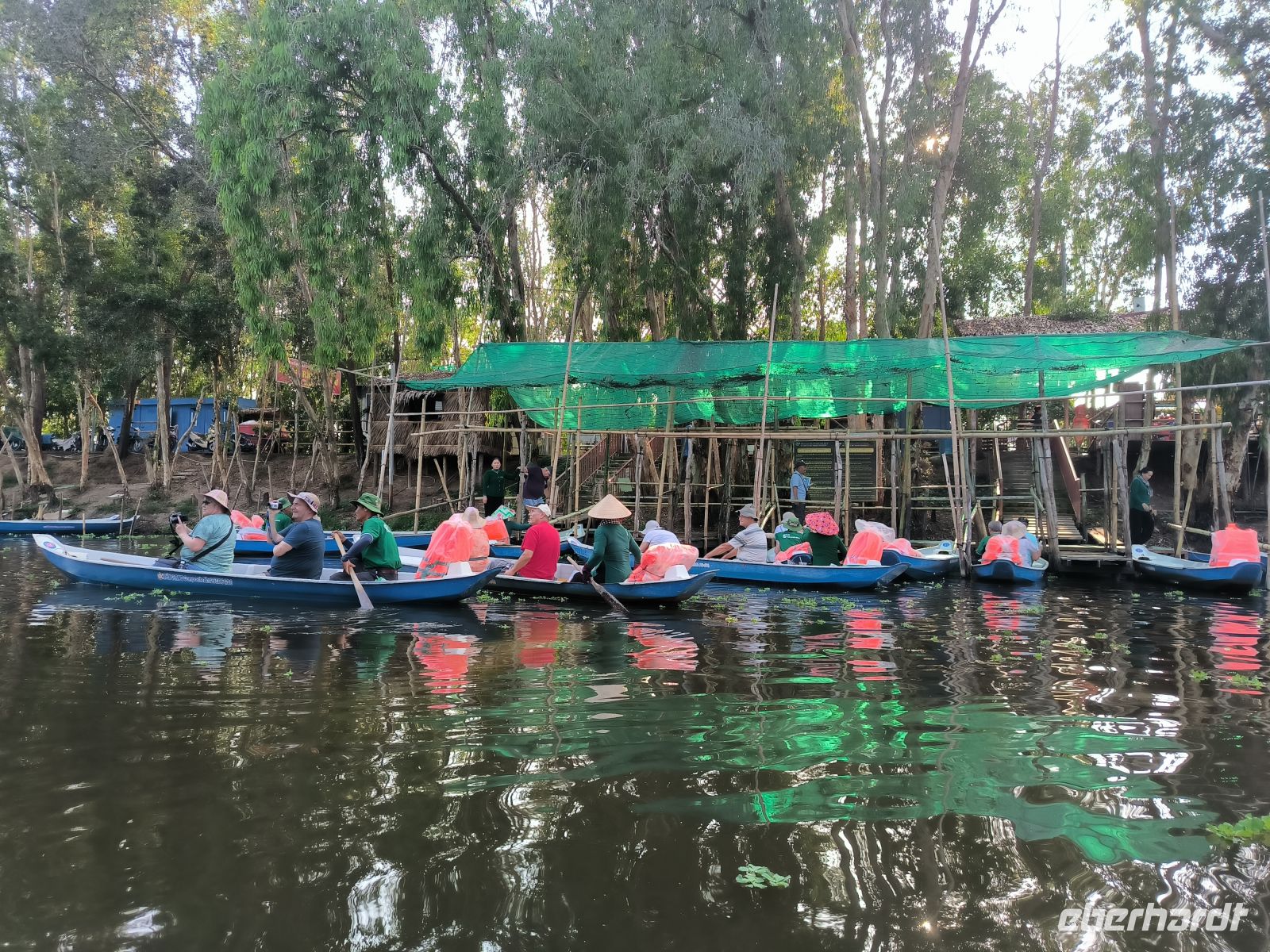 Unterwegs erkunden wir noch die Eukalyptus-Mangroven-Landschaft von Tra Su. Mit einem kleinen Holzboot gleiten wir durch eine traumhafte Naturkulisse aus Lotusfeldern, Wasserhyazinthen und dichtem Wald. In diesem geschützten Gebiet beobachten wir zahlreiche Vogelarten wie Enten, Pfauen, Kormorane und Tauben. Auch die farbenprächtige Flora in diesem Areal mit Lotusblüten, Mangroven, Orchideen und anderen Pflanzen lässt uns einen fast magischen Abschluss eines weiteren unvergesslichen Reisetages erleben. Anschließend fahren wir weiter nach Chau Doc.