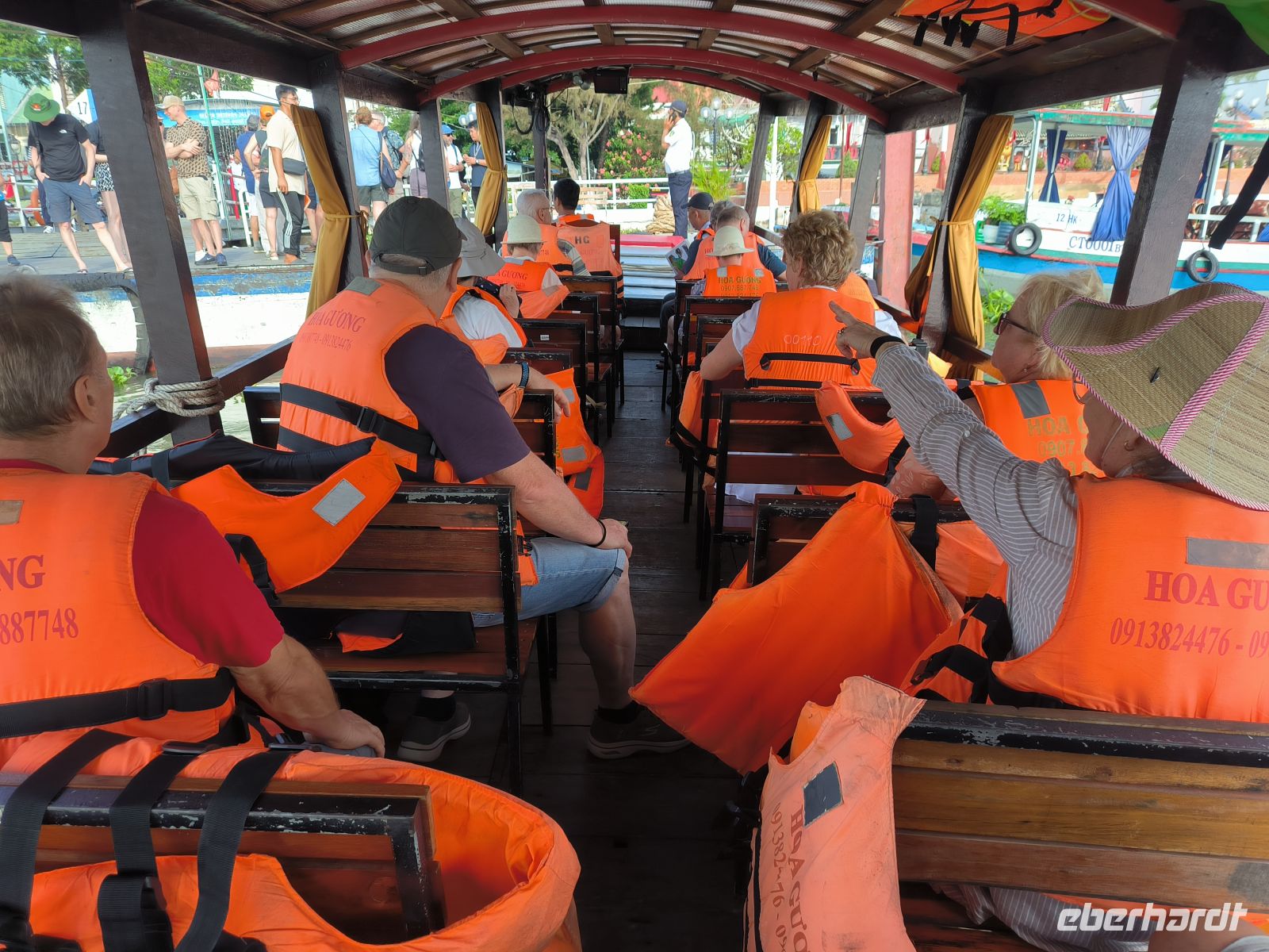 Heute erwartet uns ein ganz besonderes Natur- und Kulturerlebnis. Der Mekong ist mit ca. 4.500 km Länge die Lebensader für ca. 8 Millionen Menschen in Südostasien. Im Mekong-Delta unternehmen wir eine Bootstour durch die verzweigten Flussarme. Wir besuchen einen Obstgarten, probieren exotische Früchte wie Wasserapfel und den wundersamen Schlangenschnaps , dem Heilkräfte nachgesagt werden. Wir lauschen traditioneller Musik bei einem charmanten Theaterstück. Auf kleinen Sampans gleiten wir durch schmale, von Palmen gesäumte Kanäle. Als bei einem Boot der Motor ausfällt, machen wir uns ganz kurz Sorgen, aber alles geht gut.