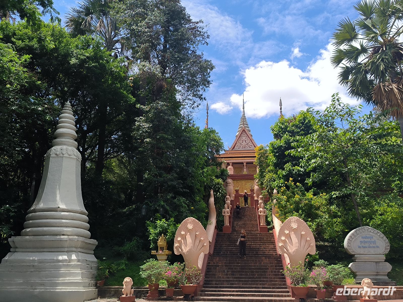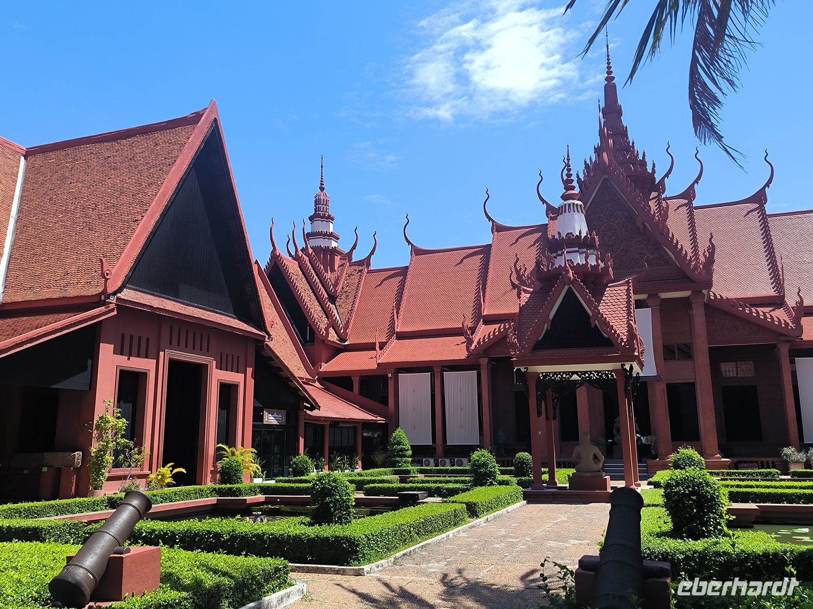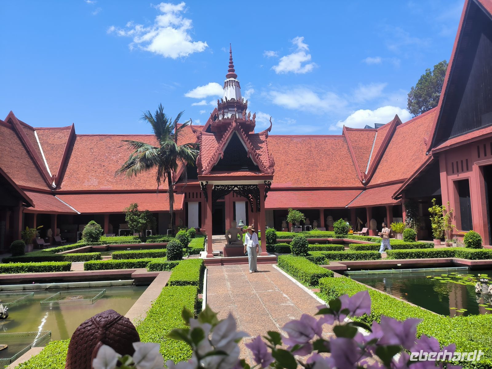 Im Nationalmuseum Kambodschas tauchen wir tief in die Welt der Khmer-Kunst ein und bewundern einzigartige Exponate aus verschiedenen Epochen, Skulpturen aus Sandstein. Dann besuchen wir in 27 Metern Höhe den Wat Phnom - Tempel, das wichtigste Heiligtum der Stadt und Namensgeber Phnom Penhs, auch Hügelpagode genannt. Hier spüren wir die spirituelle Bedeutung dieses Ortes besonders intensiv, Samnang beglückt uns mit gesegneten Geldscheinen.