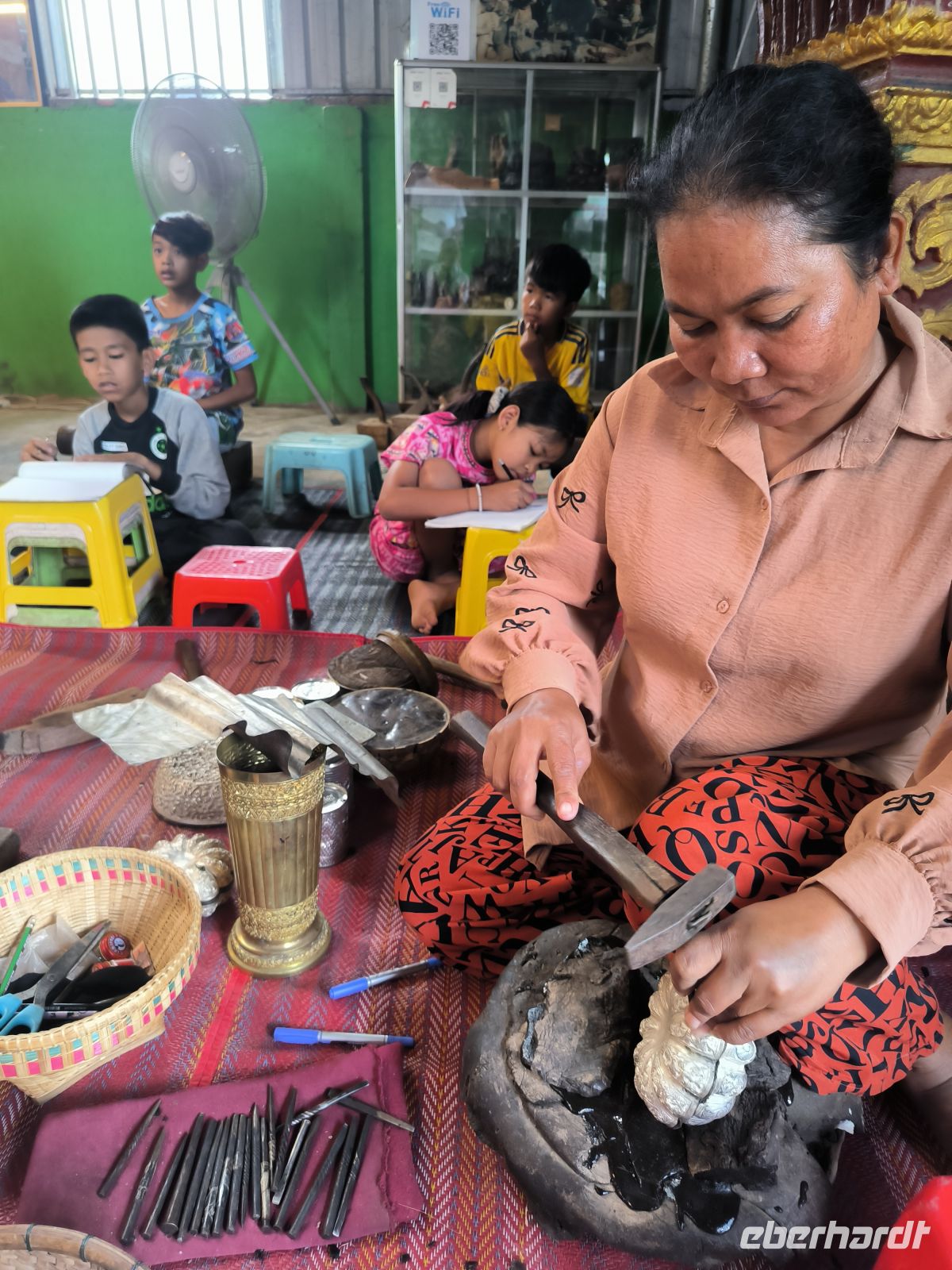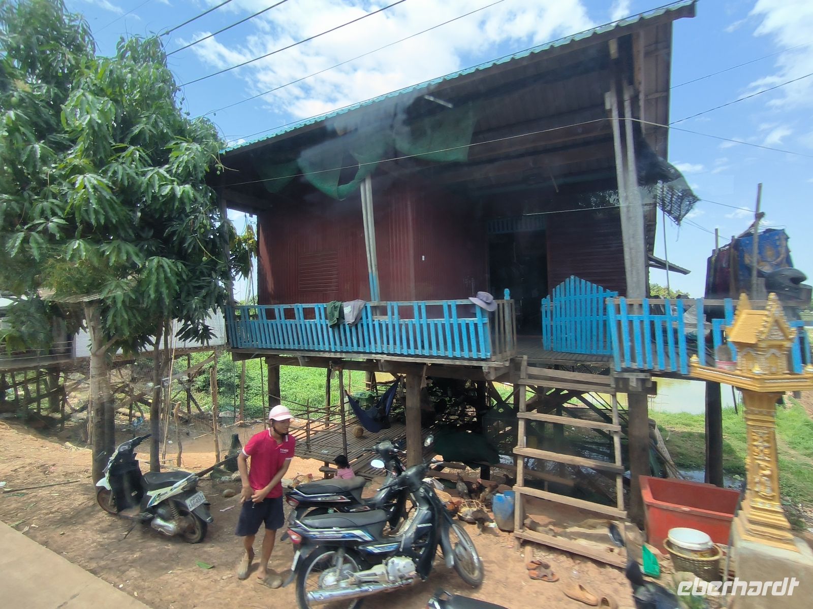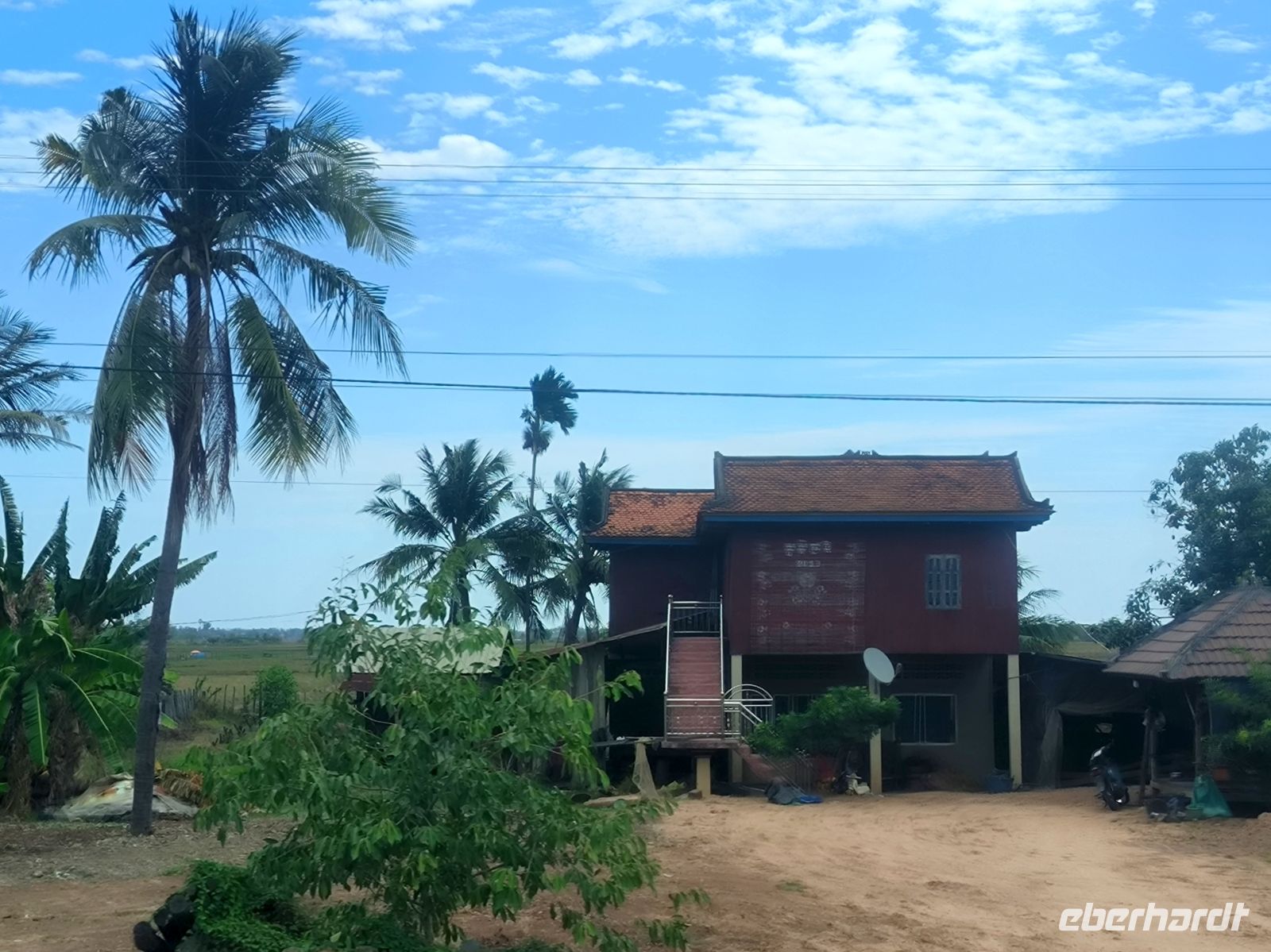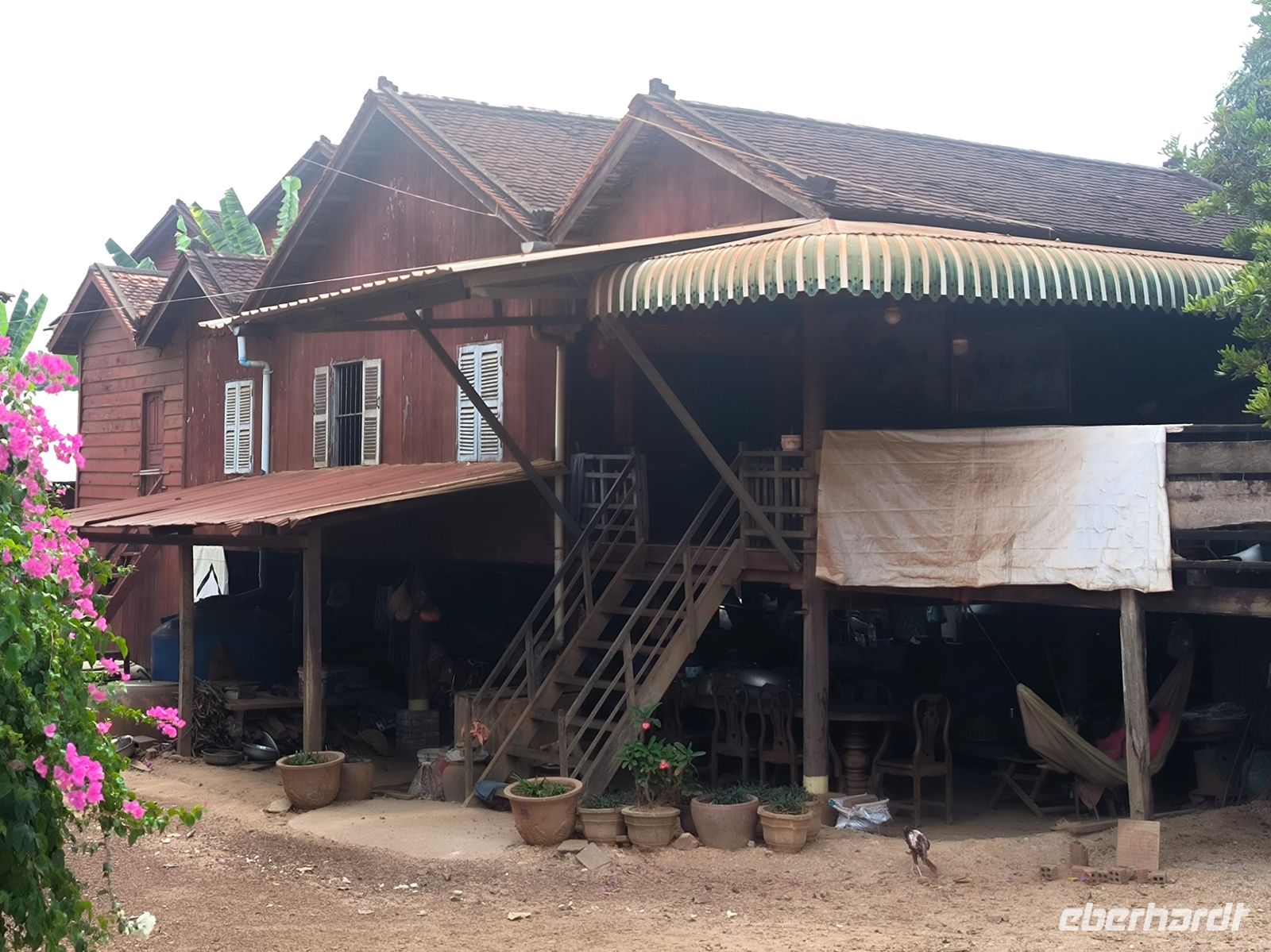 Vorbei an ländlichen Dörfern und weiten Landschaften bekommen wir authentische Einblicke in das ursprüngliche Leben der Menschen. Die typischen Häuser der Khmer stehen auf Stelzen, in unteren Bereich wird gelebt, gearbeitet und das Moped geparkt. Die Armut ist unübersehbar. Eine Familie im Silberdorf handelt mit Dingen aus Silber, während die Kinder bereits zu Hause das Handwerk erlernen. Bei einem kurzen Stopp könnten wir auch Vogelspinnen oder Kakerlaken kosten, machen wir aber nicht. Interessanter sind da schon die Früchte des Cashew-Nussbaums.