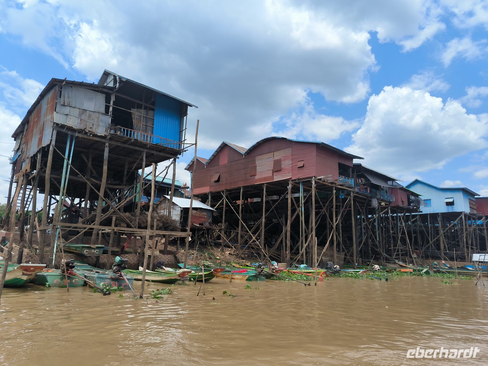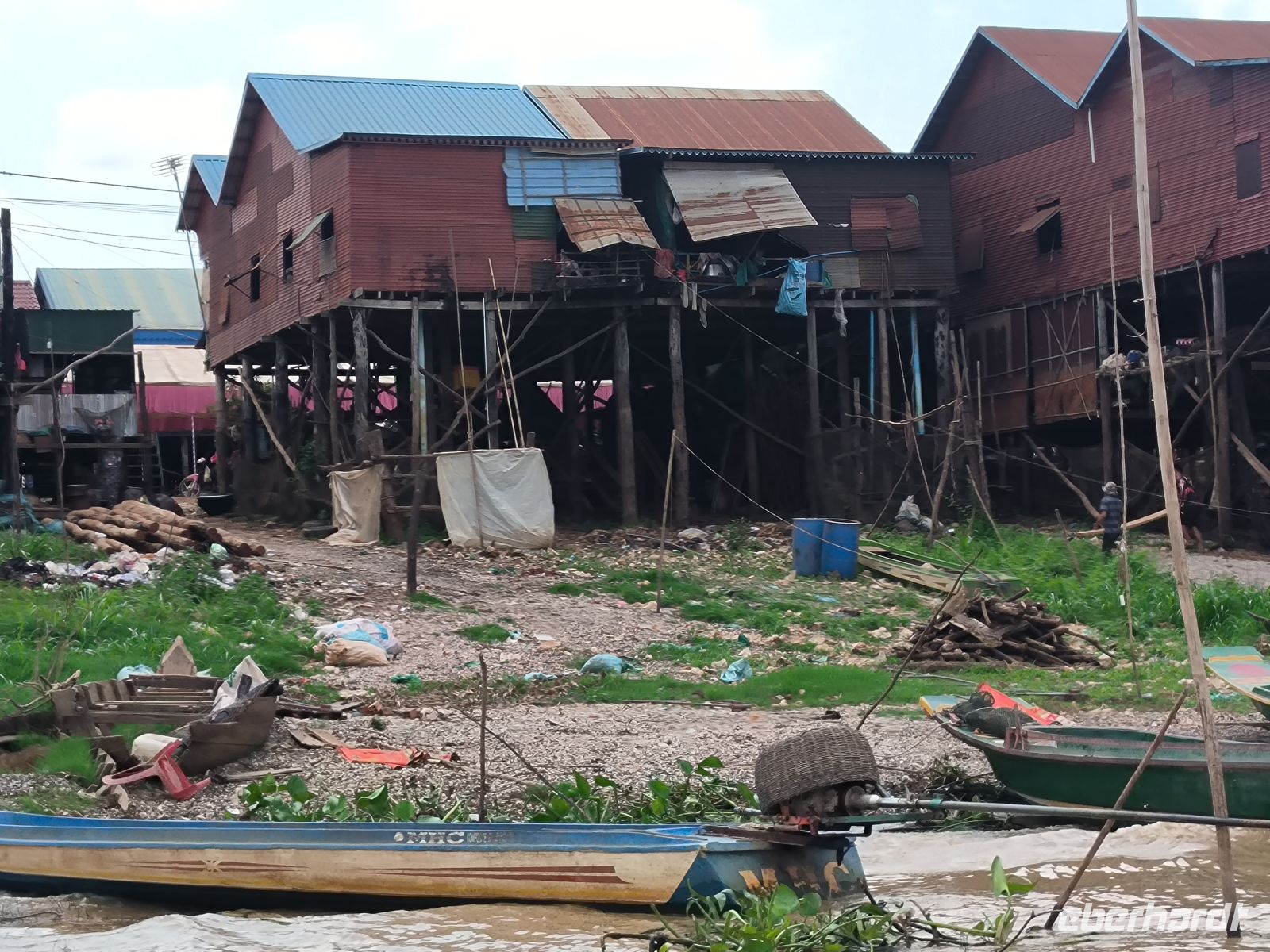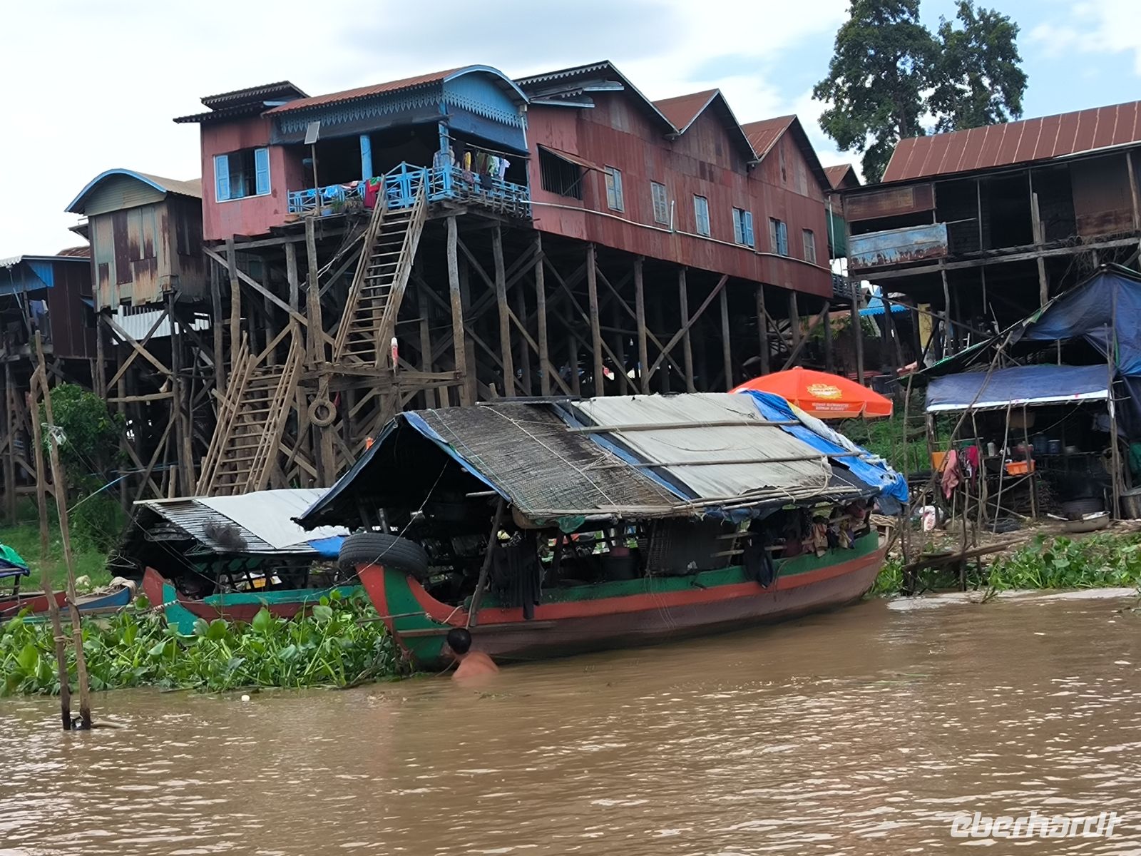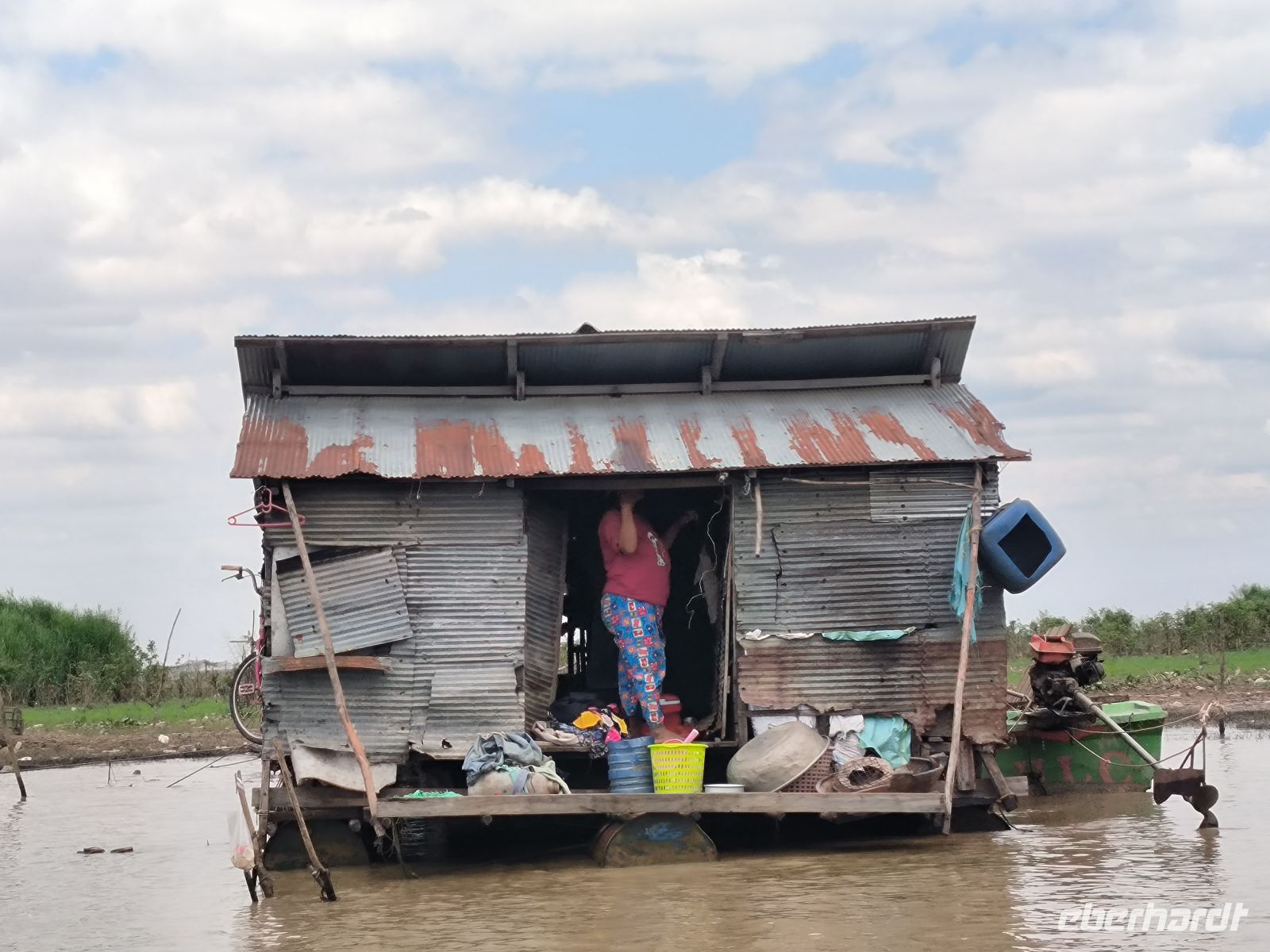 Am Vormittag fahren wir mit bereits gepackten Koffern eine Stunde zum Tonle-Sap-See, dem größten Binnensee Südostasiens. Der große Bus hat Mühe, sich durch die schmale Dorfstraße zu zwängen. Dann unternehmen wir eine letzte Bootsfahrt. Bei niedrigem Wasserstand erleben wir das Leben in den Stelzenhäusern der Khmer und den schwimmenden Dörfern hautnah: Fischer bei der Arbeit, Kinder beim Unterricht in schwimmenden Schulen und religiöse Zeremonien in schwimmenden Kirchen. Ein faszinierender, für uns aber auch verstörender, Einblick in eine Welt, die sich komplett dem Rhythmus des Wassers anpasst.