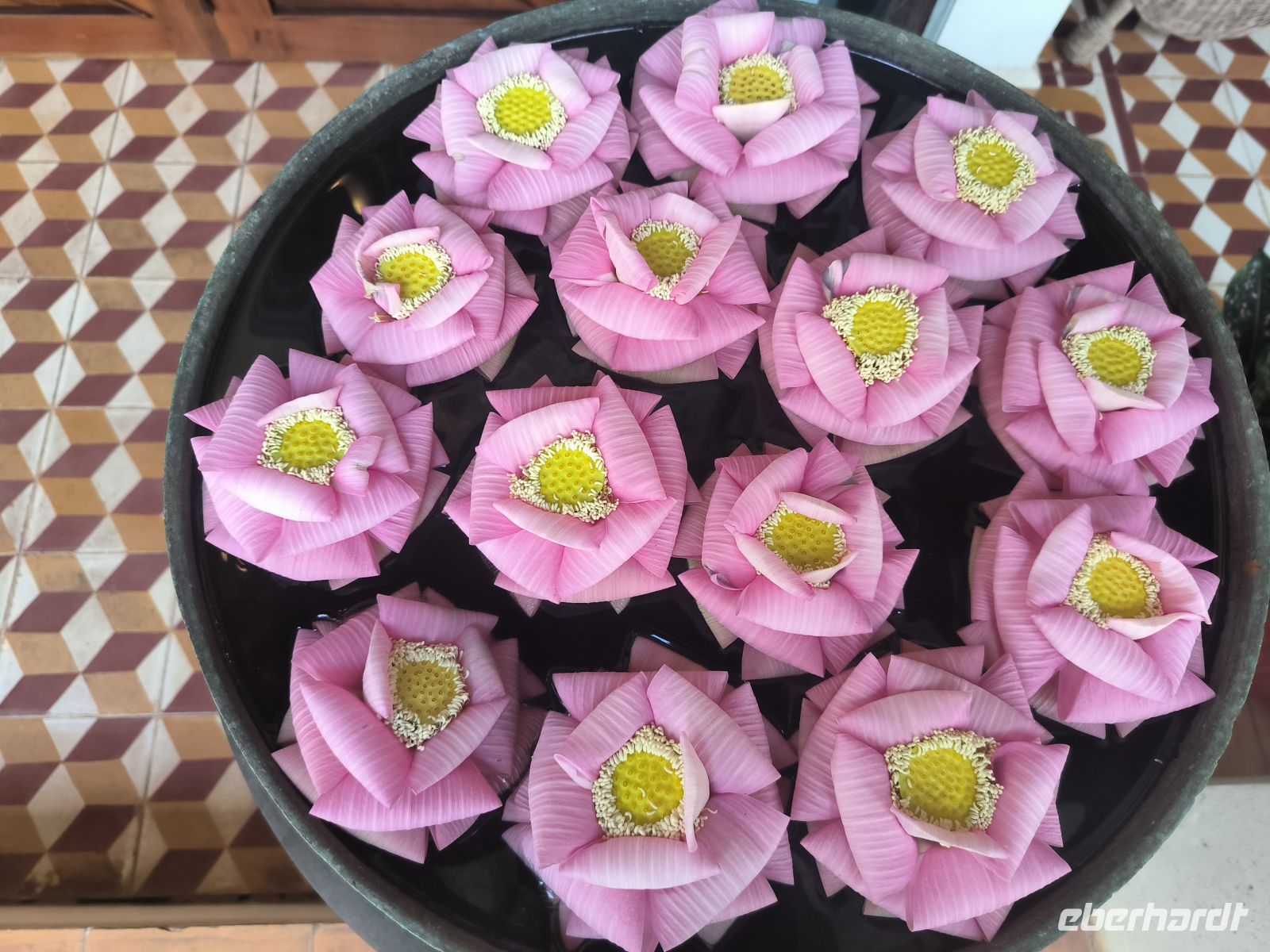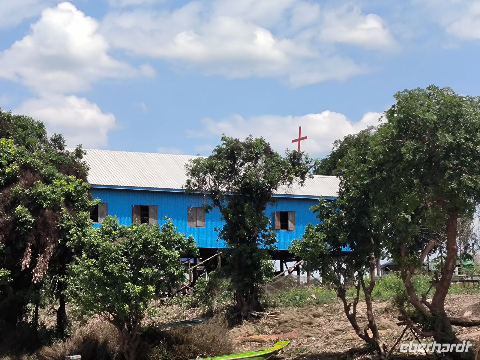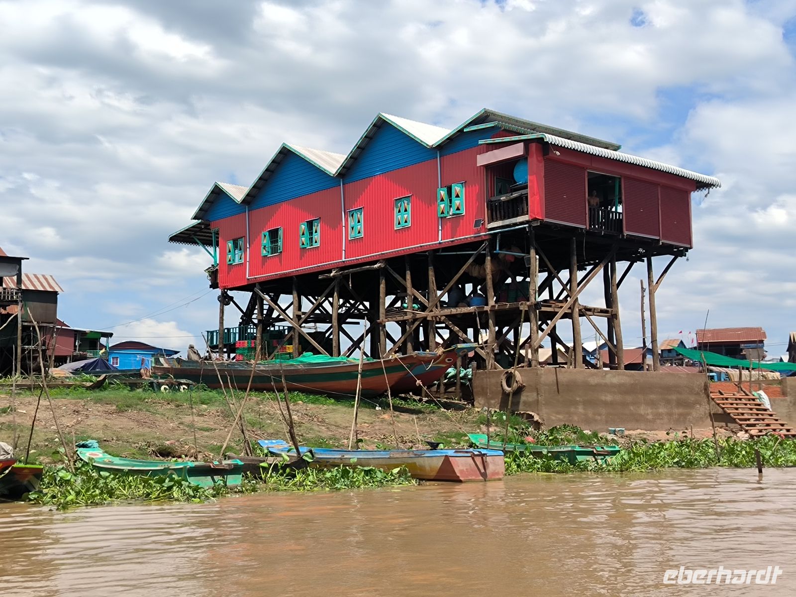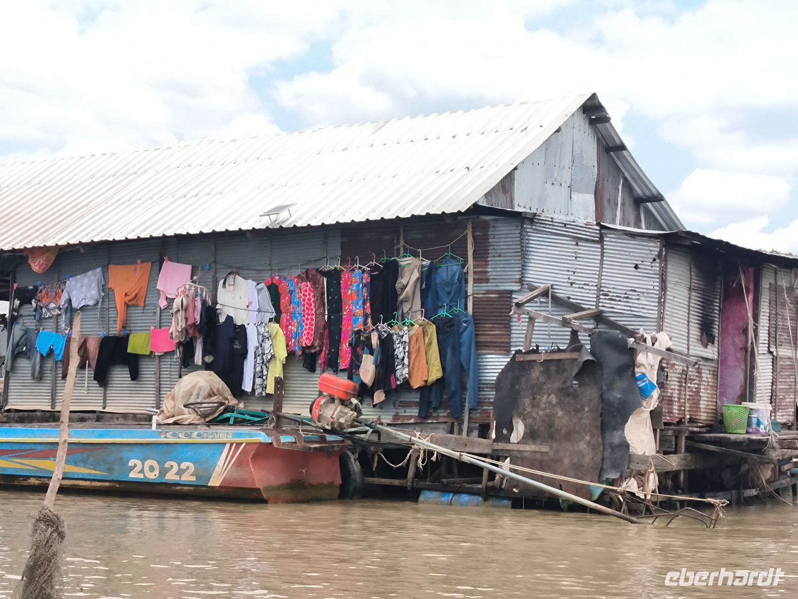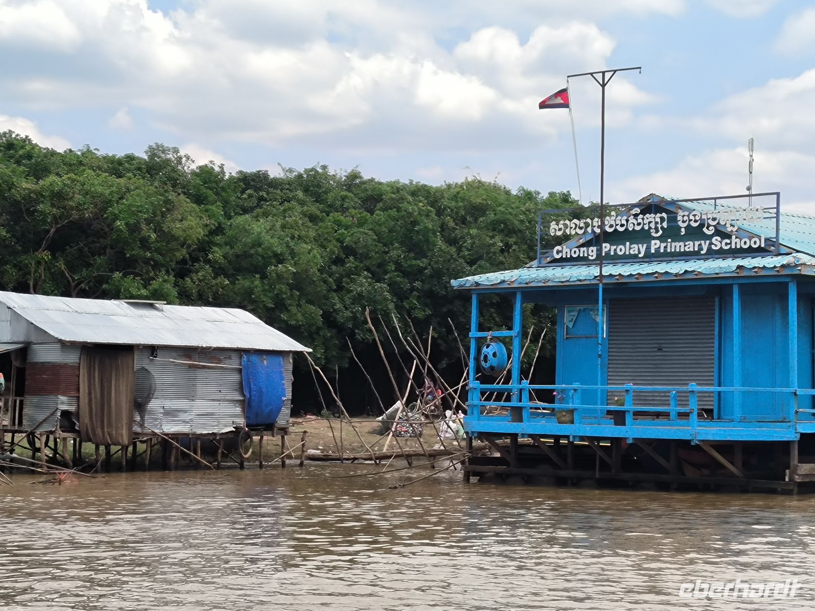 Am Vormittag fahren wir mit bereits gepackten Koffern eine Stunde zum Tonle-Sap-See, dem größten Binnensee Südostasiens. Der große Bus hat Mühe, sich durch die schmale Dorfstraße zu zwängen. Dann unternehmen wir eine letzte Bootsfahrt. Bei niedrigem Wasserstand erleben wir das Leben in den Stelzenhäusern der Khmer und den schwimmenden Dörfern hautnah: Fischer bei der Arbeit, Kinder beim Unterricht in schwimmenden Schulen und religiöse Zeremonien in schwimmenden Kirchen. Ein faszinierender, für uns aber auch verstörender, Einblick in eine Welt, die sich komplett dem Rhythmus des Wassers anpasst.