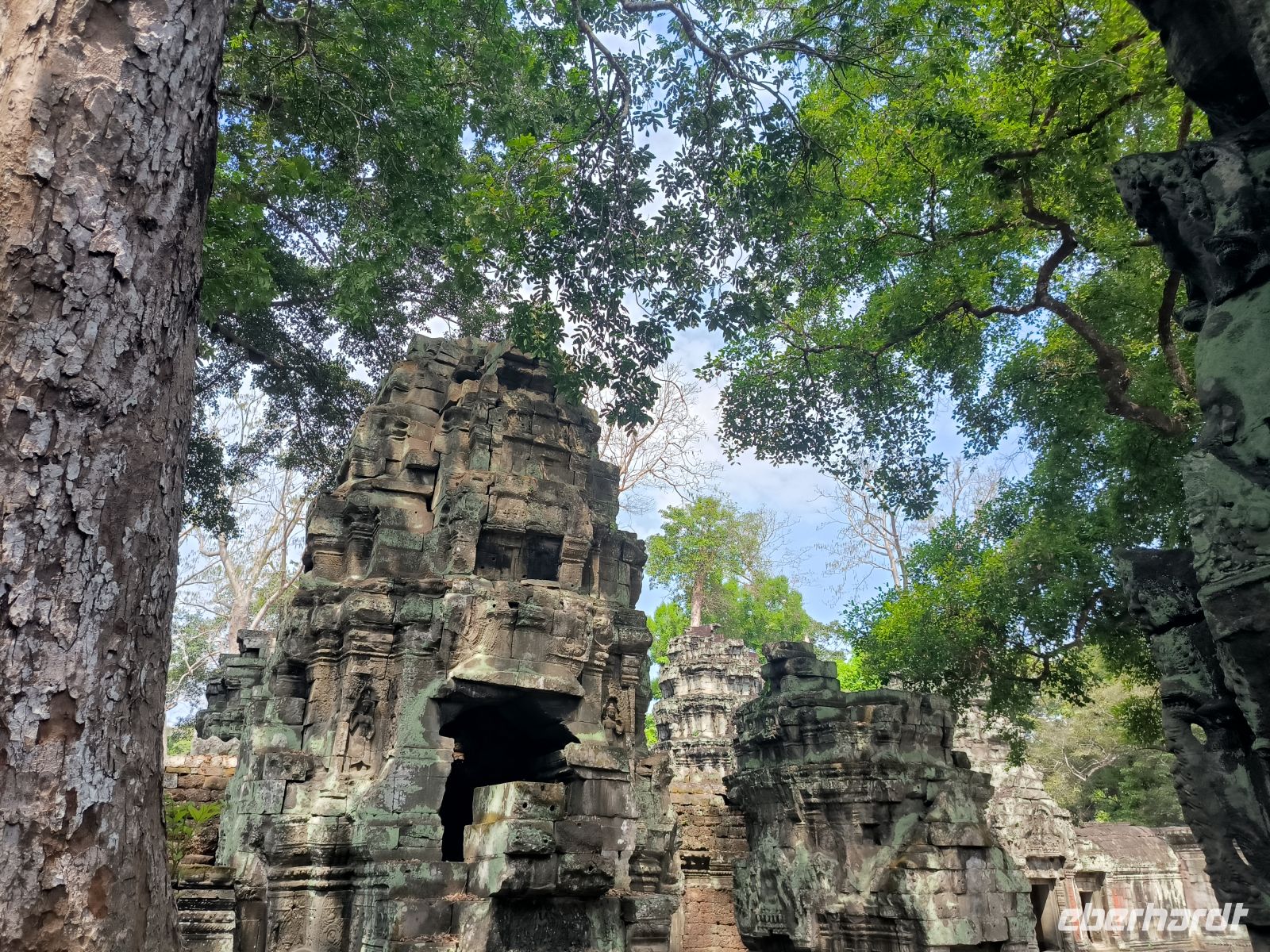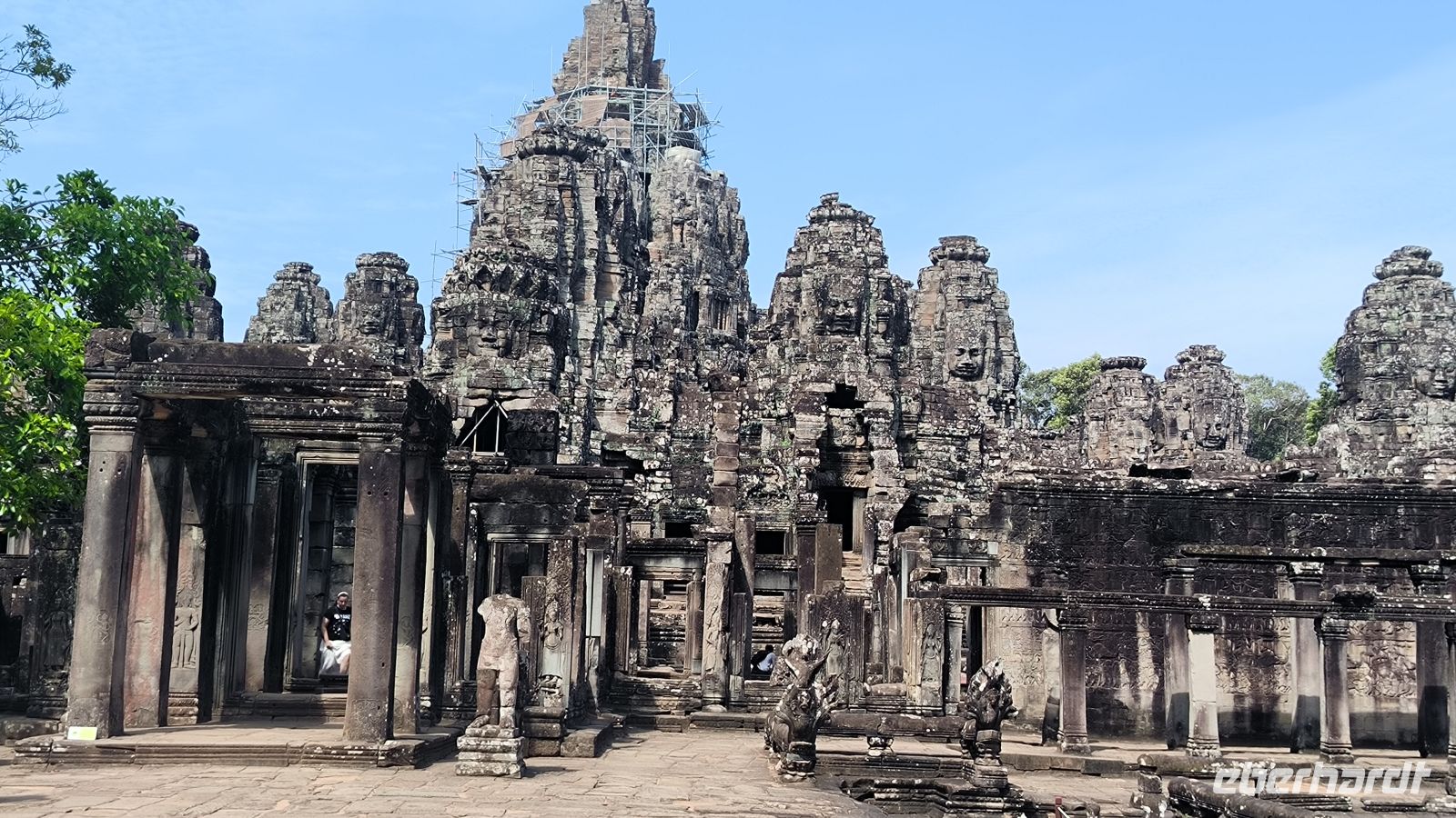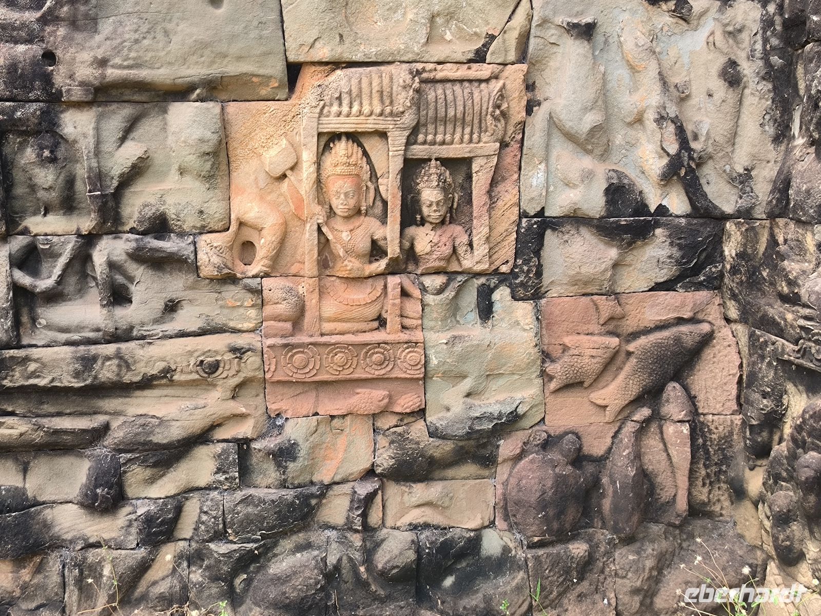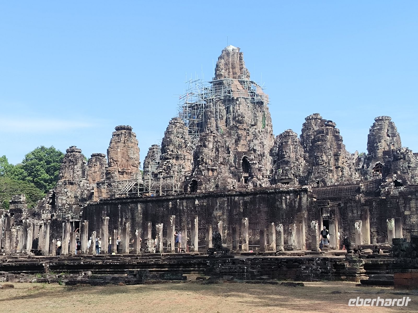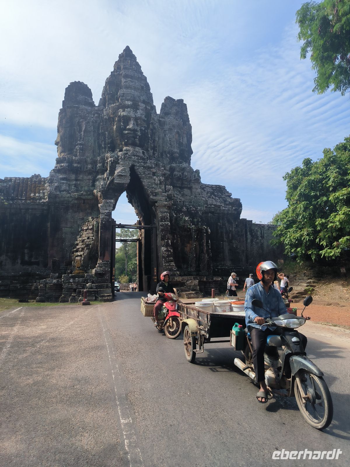 Wir lassen uns fotografieren, bekommen unsere Angkor-Pässe und schon geht es nach Angkor Thom mit der Elefantenterrasse und dem beeindruckenden Bayon-Tempel. Der Prasat Bayon ist neben dem Angkor Wat die bekannteste und eindrucksvollste Tempelanlage in Angkor – berühmt vor allem wegen seiner Türme mit meterhohen, aus Stein gemeißelten Gesichtern von Lokeshvar, die uns geheimnisvoll entgegen blicken. Wir lassen uns von den detailreichen Flachreliefs, den monumentalen Bauwerken und den steinernen Erzählungen vergangener Zeiten verzaubern