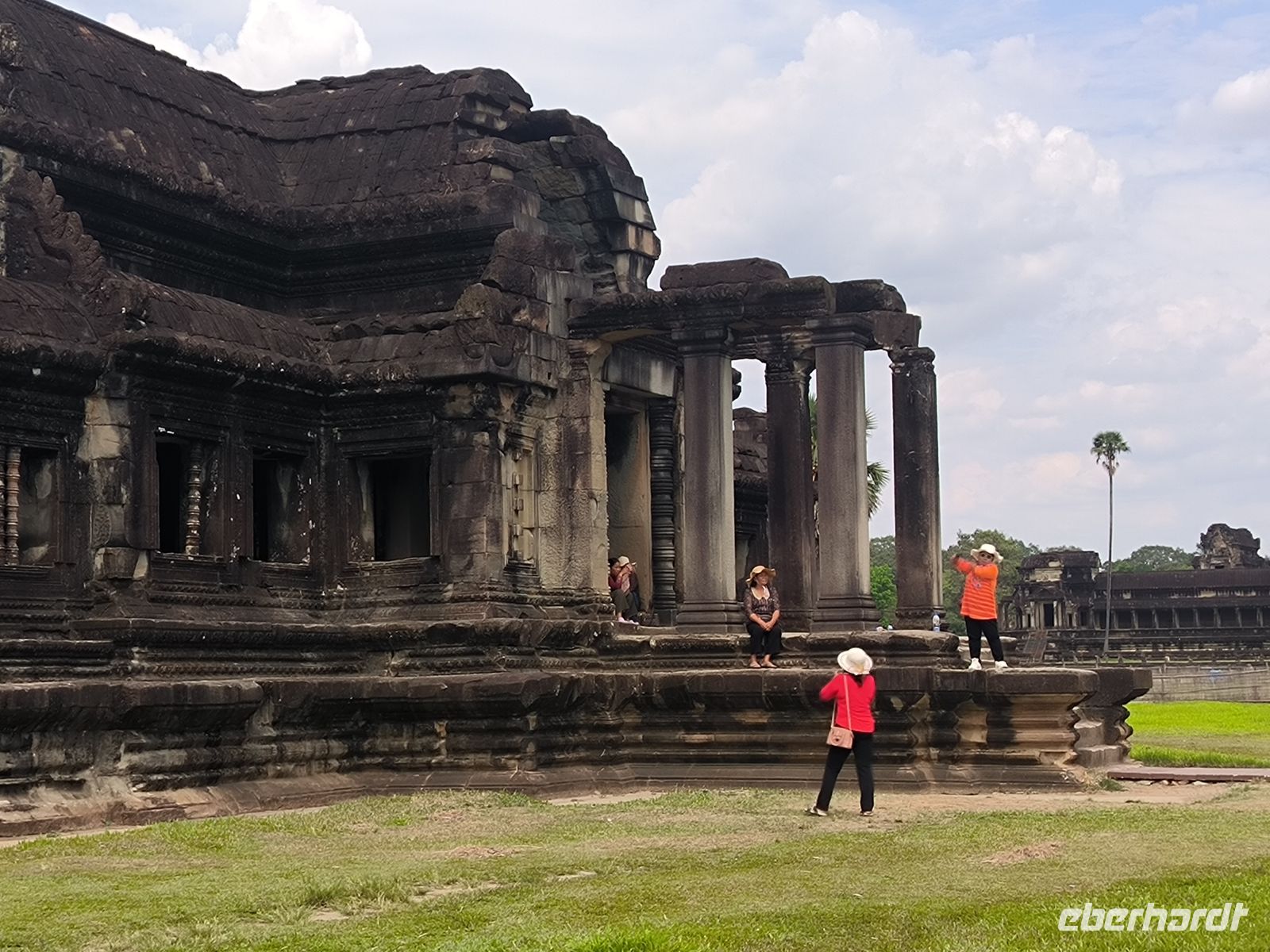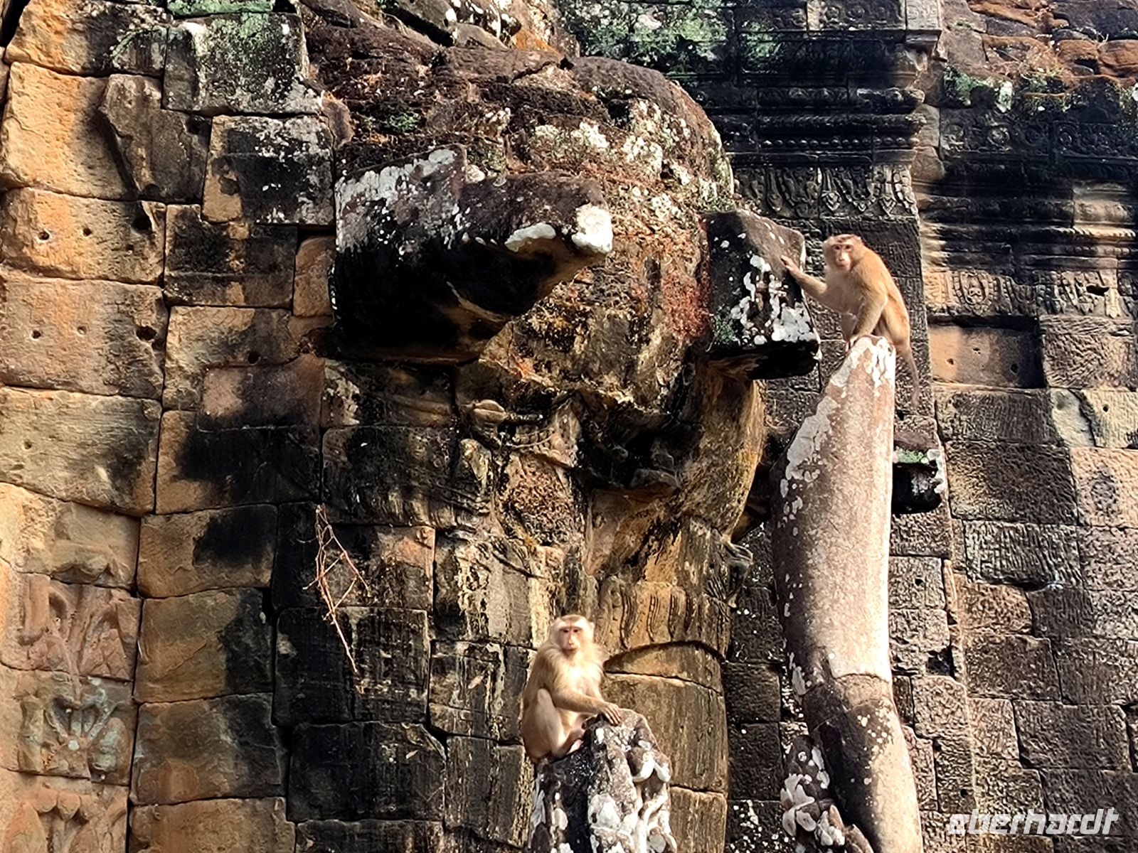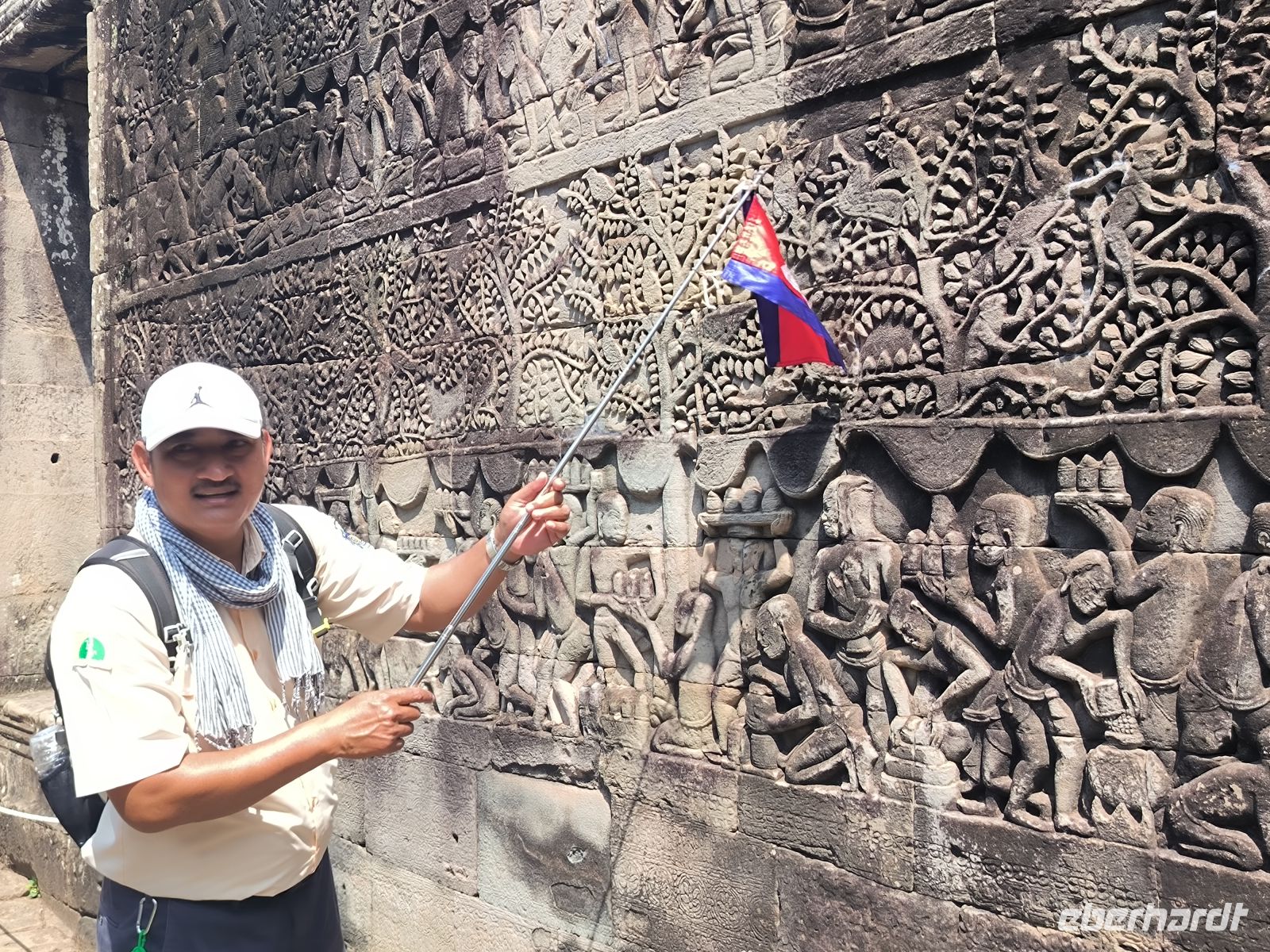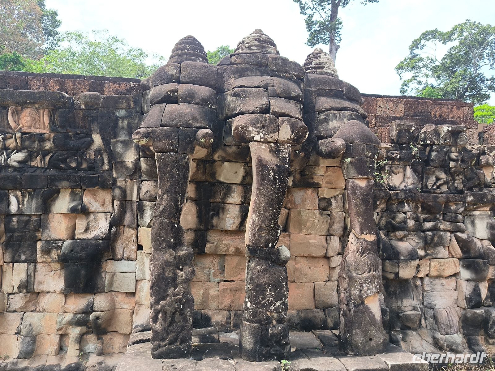 Wir lassen uns fotografieren, bekommen unsere Angkor-Pässe und schon geht es nach Angkor Thom mit der Elefantenterrasse und dem beeindruckenden Bayon-Tempel. Der Prasat Bayon ist neben dem Angkor Wat die bekannteste und eindrucksvollste Tempelanlage in Angkor – berühmt vor allem wegen seiner Türme mit meterhohen, aus Stein gemeißelten Gesichtern von Lokeshvar, die uns geheimnisvoll entgegen blicken. Wir lassen uns von den detailreichen Flachreliefs, den monumentalen Bauwerken und den steinernen Erzählungen vergangener Zeiten verzaubern