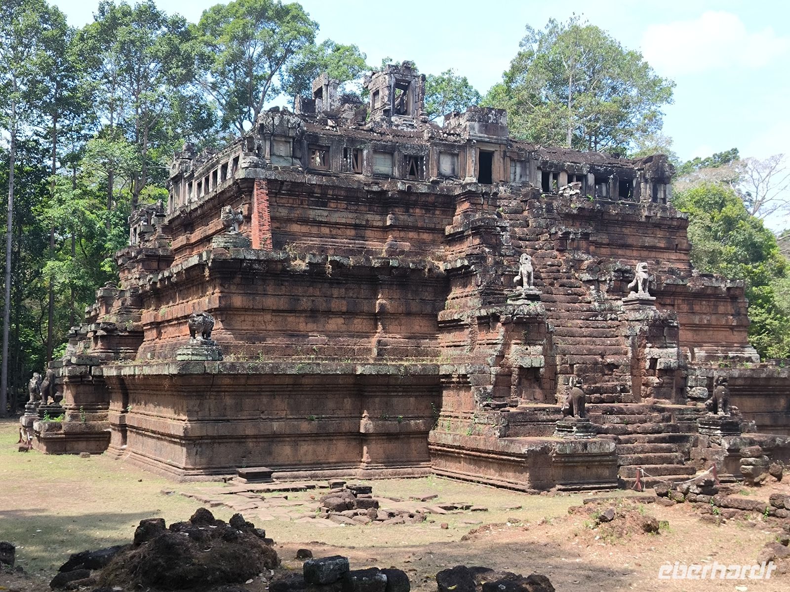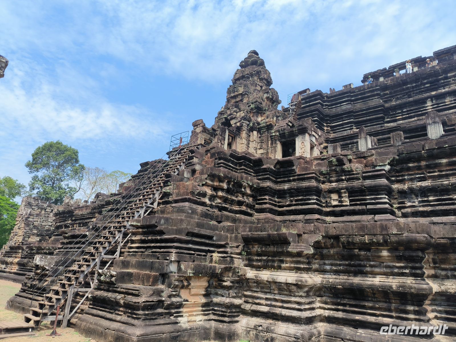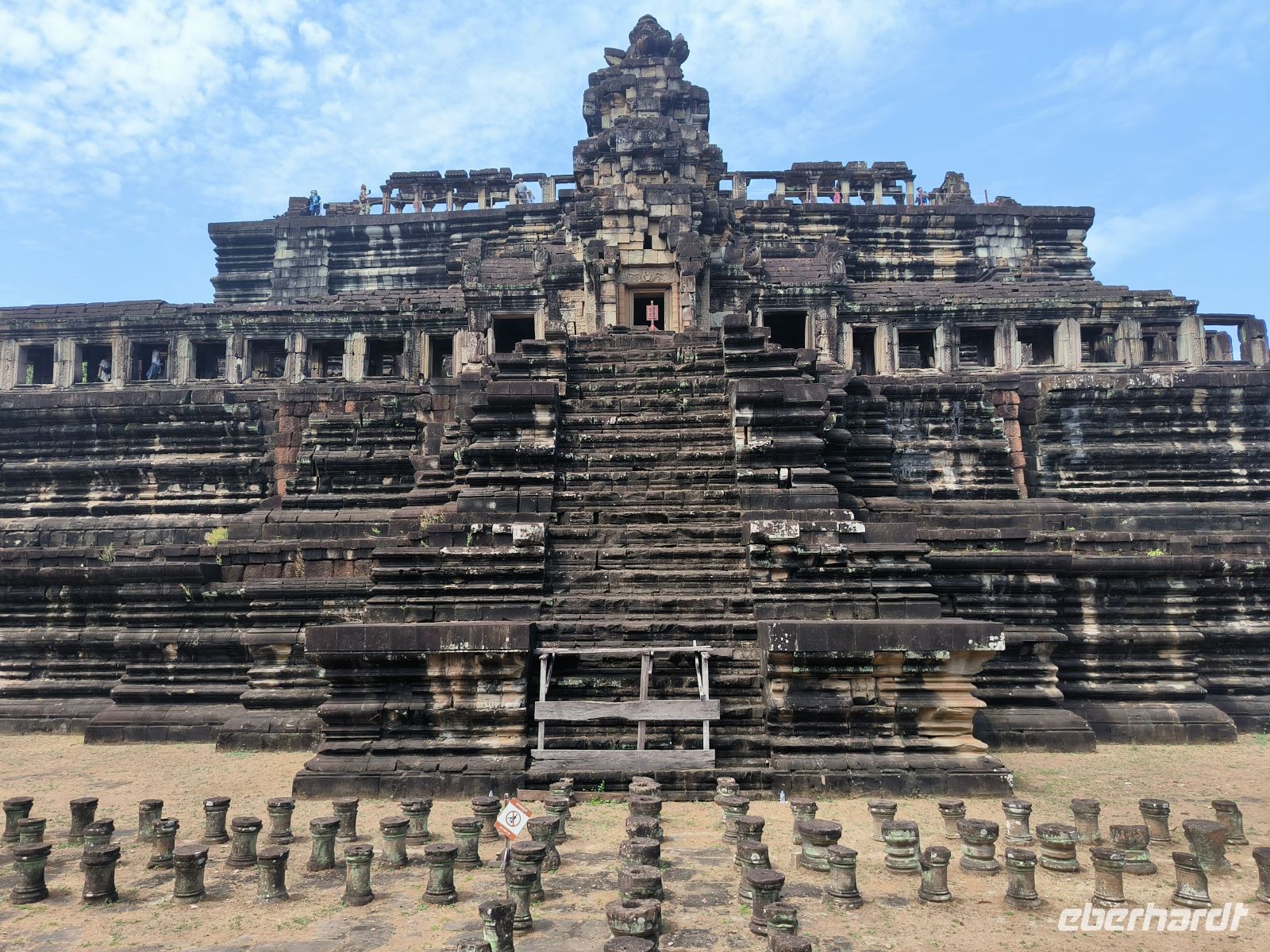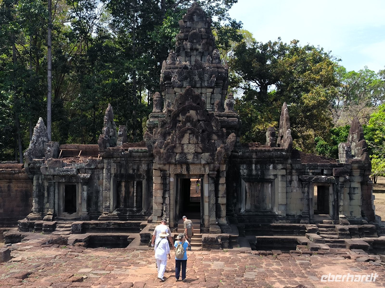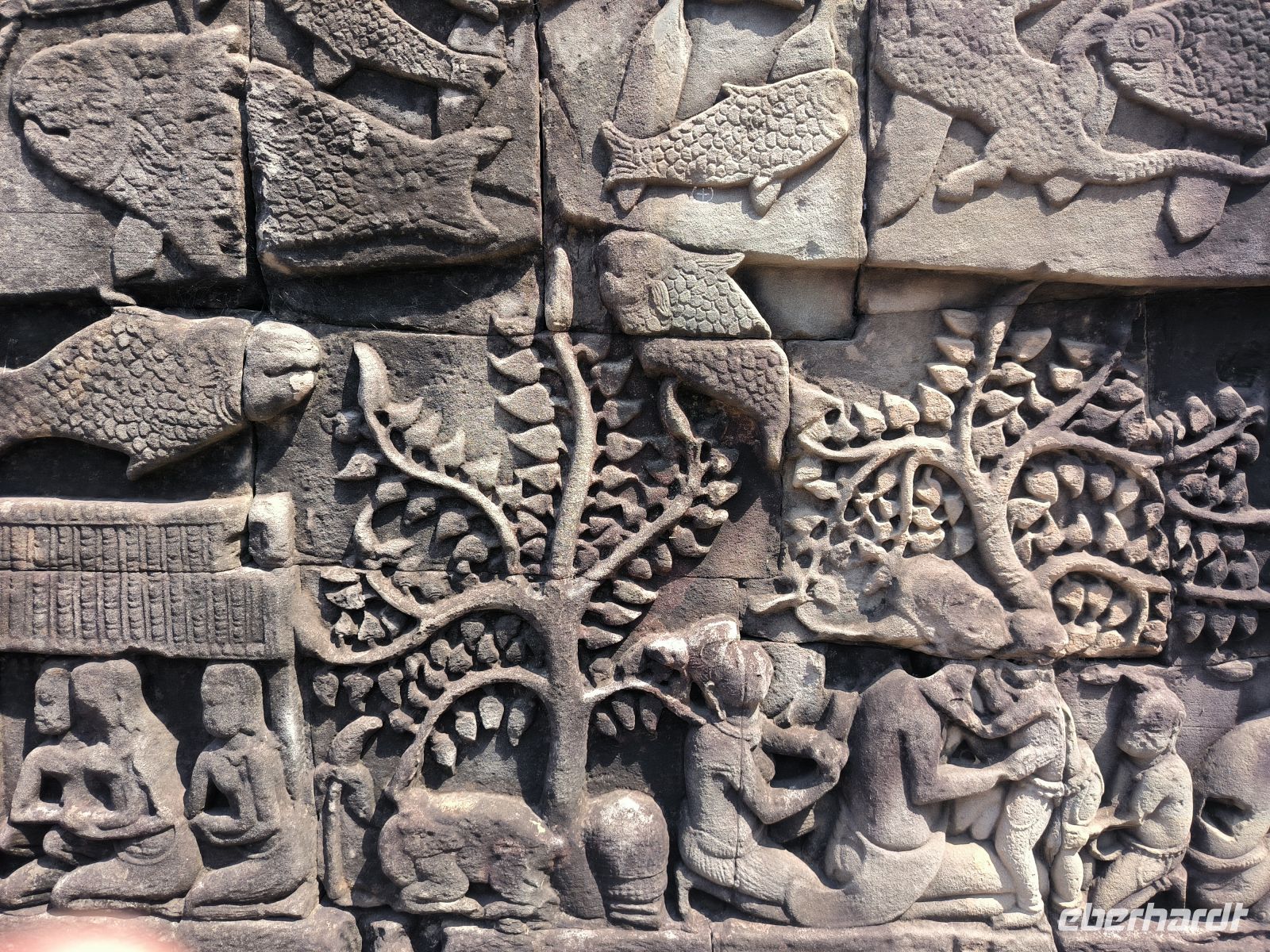 Wir lassen uns fotografieren, bekommen unsere Angkor-Pässe und schon geht es nach Angkor Thom mit der Elefantenterrasse und dem beeindruckenden Bayon-Tempel. Der Prasat Bayon ist neben dem Angkor Wat die bekannteste und eindrucksvollste Tempelanlage in Angkor – berühmt vor allem wegen seiner Türme mit meterhohen, aus Stein gemeißelten Gesichtern von Lokeshvar, die uns geheimnisvoll entgegen blicken. Wir lassen uns von den detailreichen Flachreliefs, den monumentalen Bauwerken und den steinernen Erzählungen vergangener Zeiten verzaubern