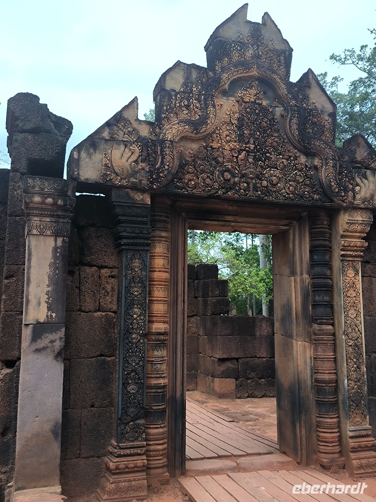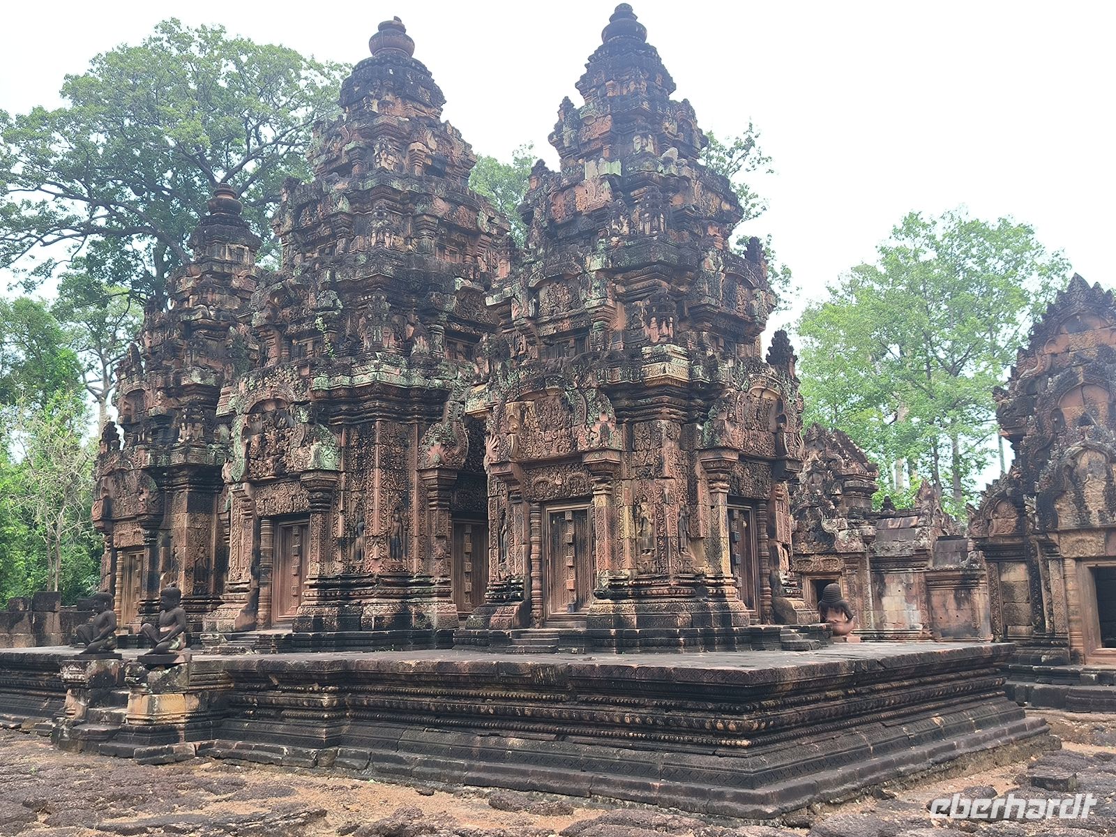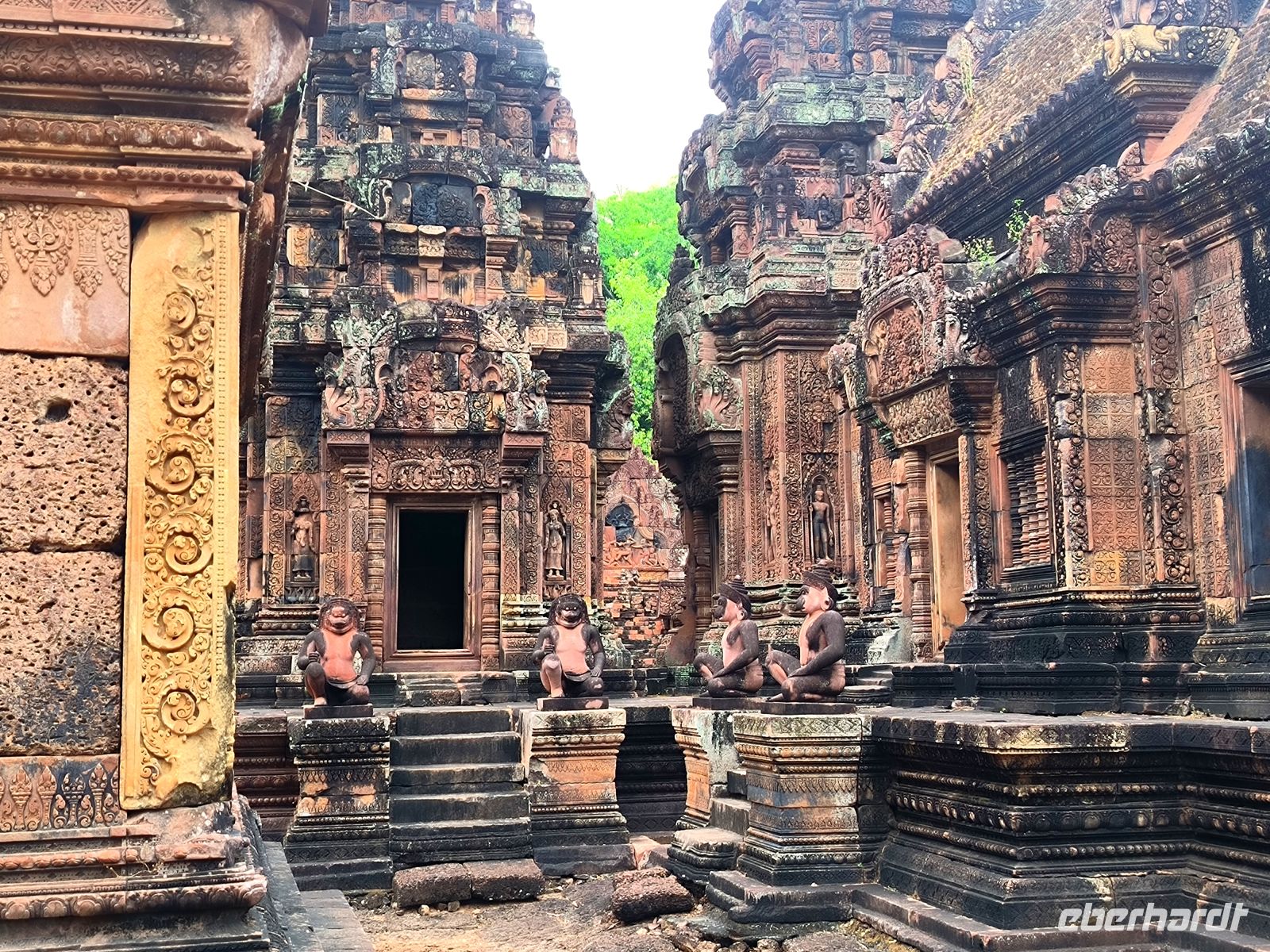 Anschließend fahren wir zum eleganten Tempel Banteay Srei, auch als „Frauentempel“ bekannt. Der rosafarbene Sandstein und die unglaublich feinen, ornamentreichen Verzierungen machen diesen Tempel zu einem wahren Juwel. Wir staunen über die Detailverliebtheit und die handwerkliche Meisterleistung dieser Anlage aus dem 10. Jahrhundert.