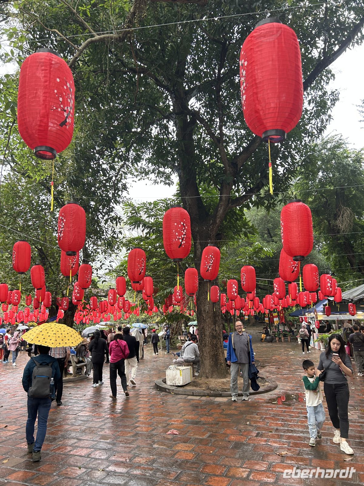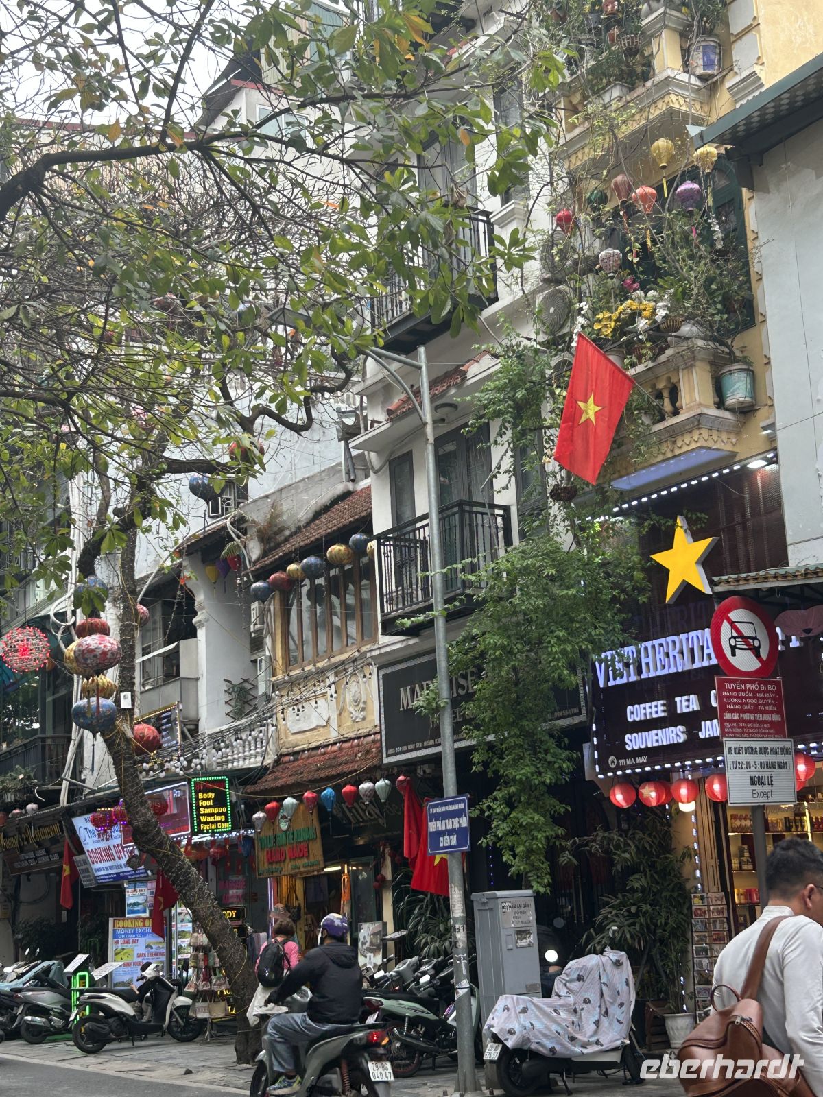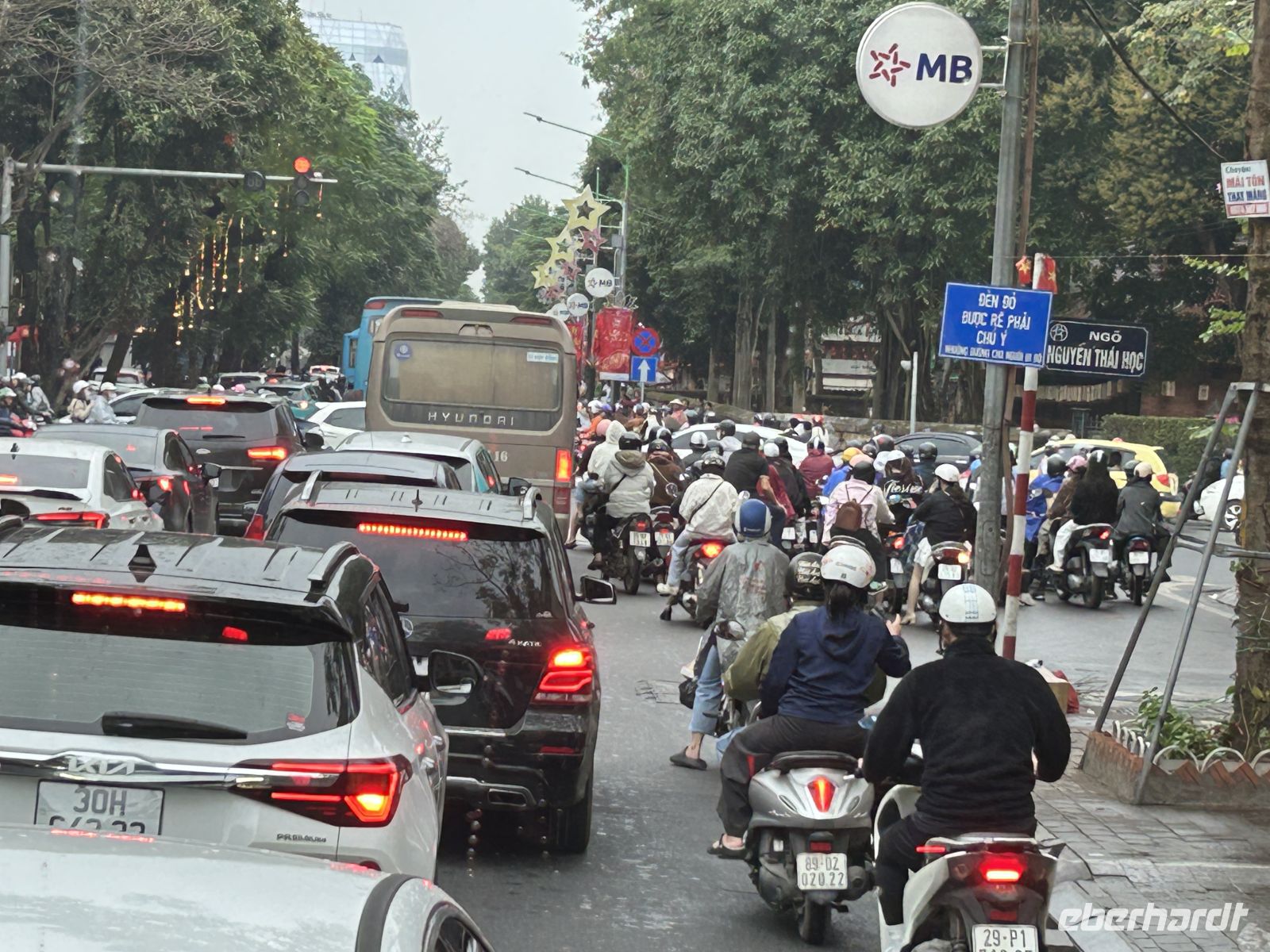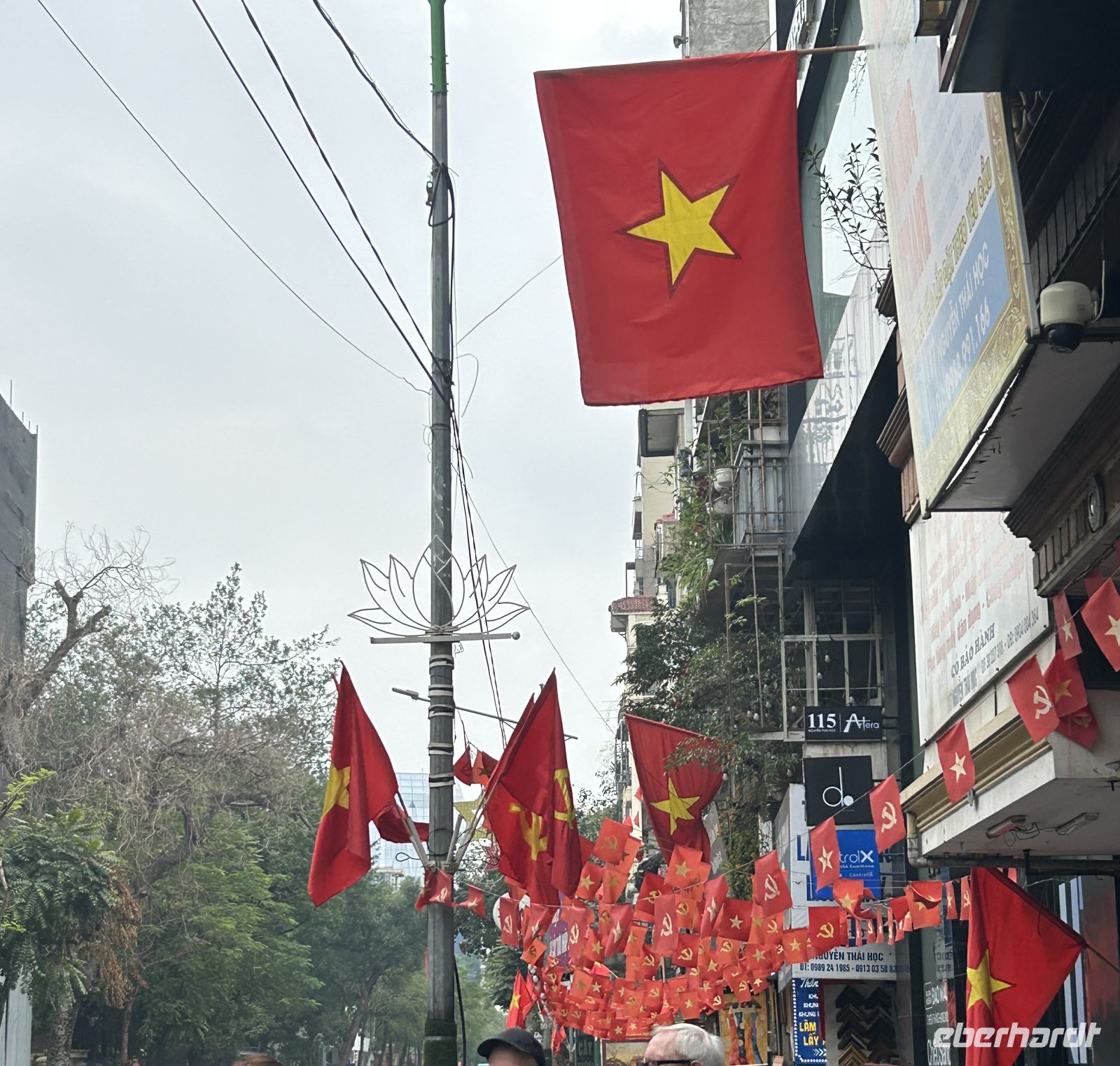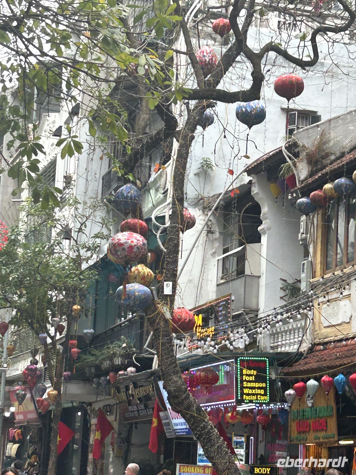 Am Nachmittag stürzen wir uns ins Leben von Hanoi – und das im wahrsten Sinne des Wortes. Heute ist das chinesische Neujahrsfest, eines der wichtigsten Feste im asiatischen Raum. Die Straßen sind überfüllt, überall herrscht geschäftiges Treiben, Farben, Geräusche und Düfte verschmelzen zu einem intensiven Erlebnis. Die Straßen sind festlich geschmückt mit roten Fähnchen und Lampions.