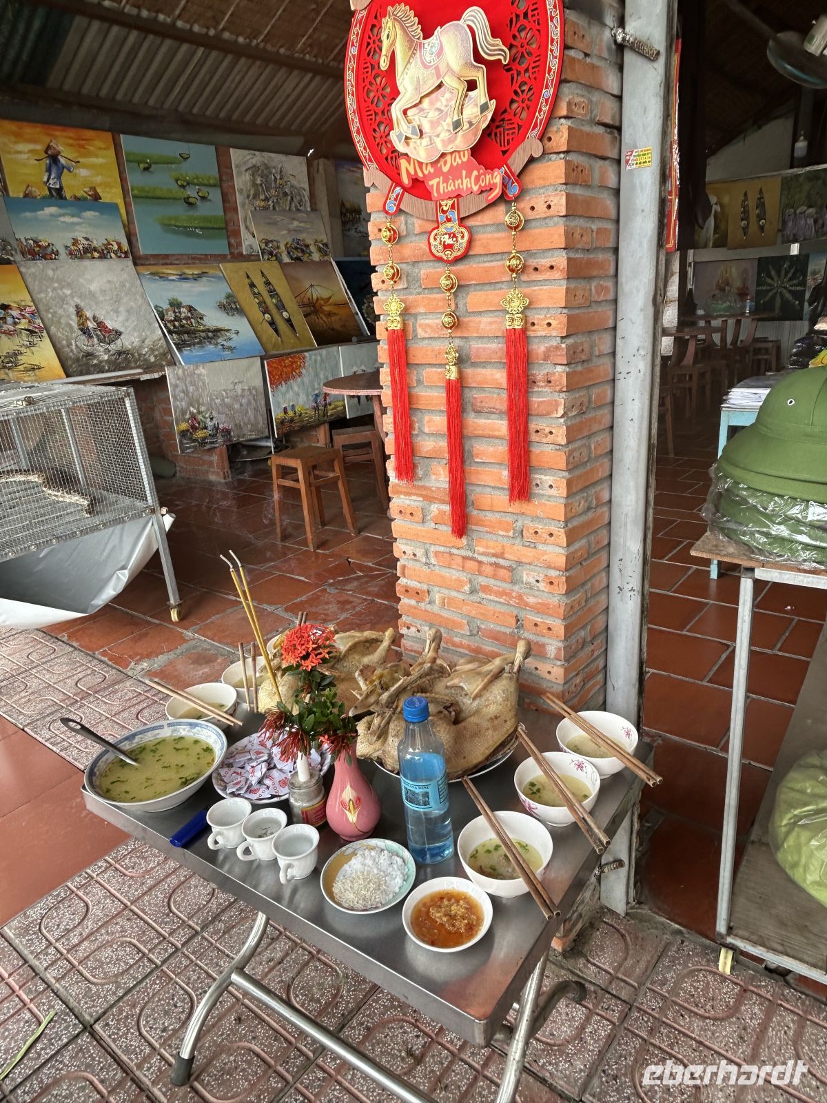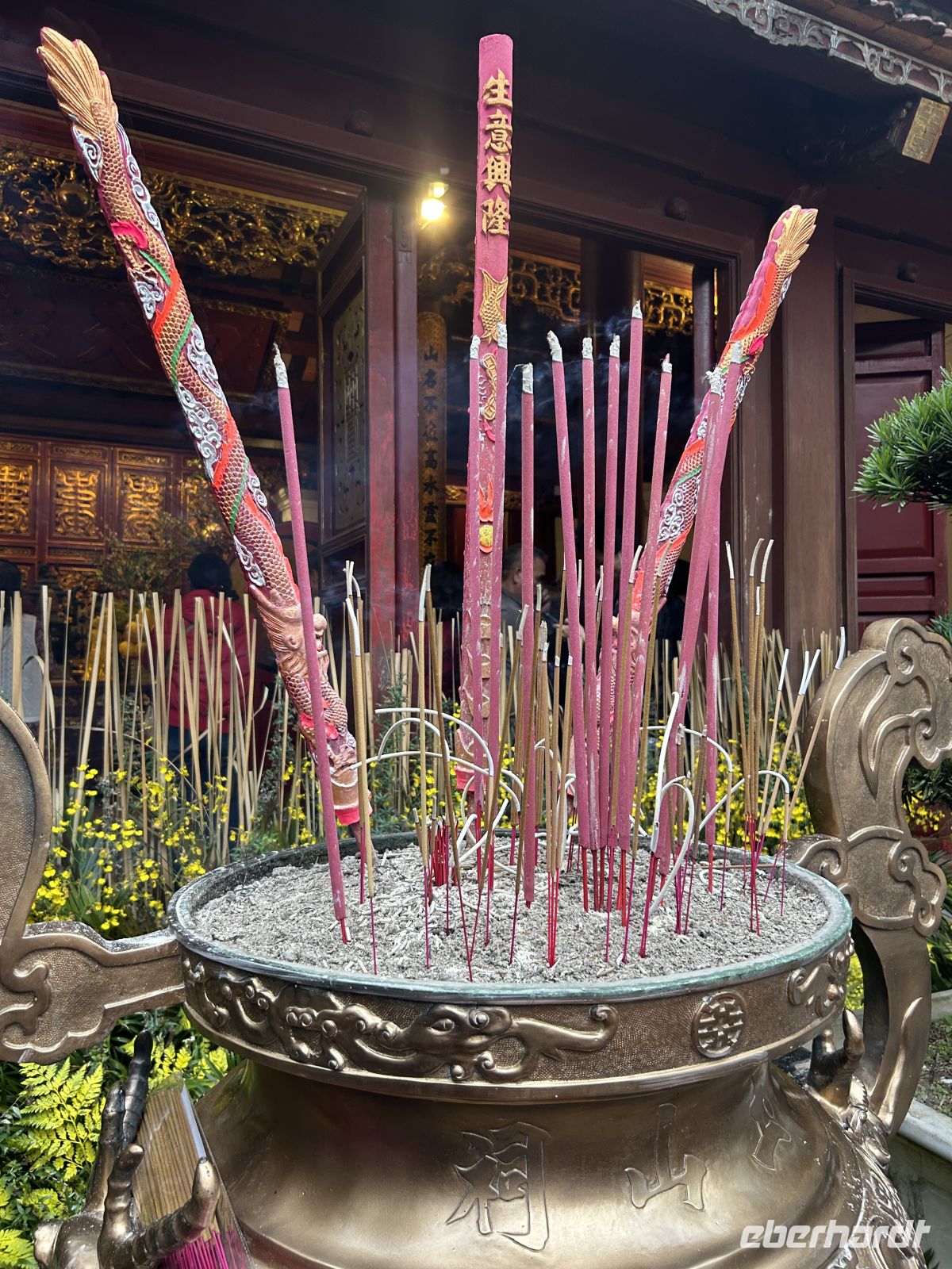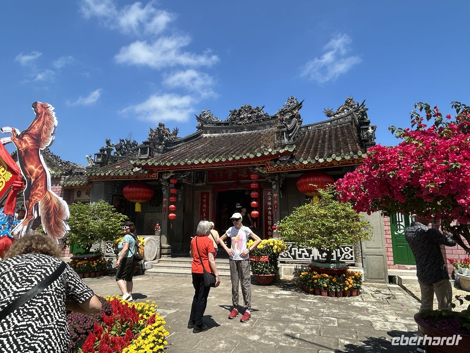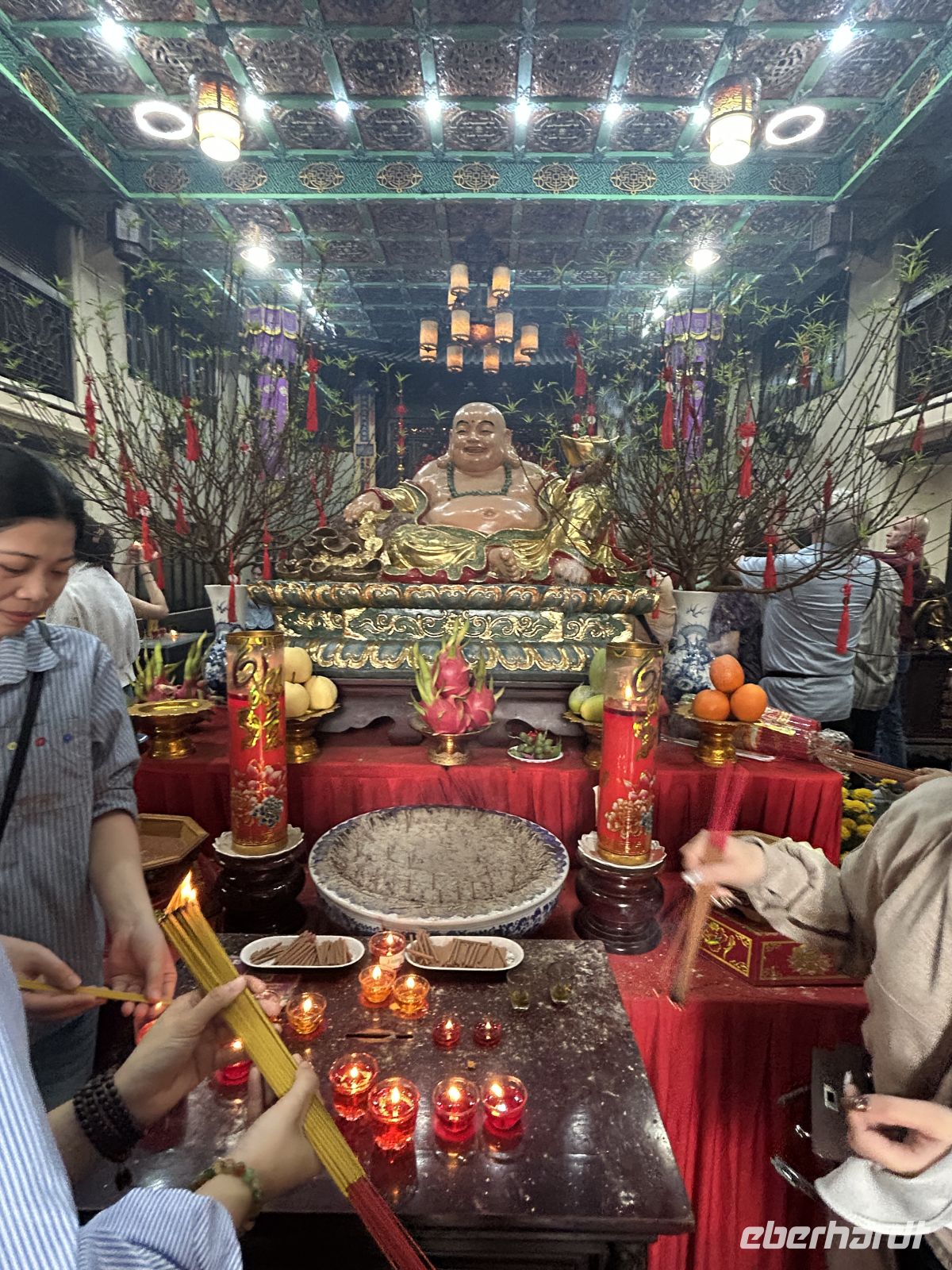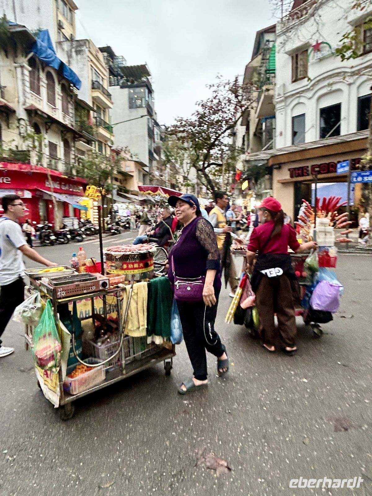 Am Nachmittag stürzen wir uns ins Leben von Hanoi – und das im wahrsten Sinne des Wortes. Heute ist das chinesische Neujahrsfest, eines der wichtigsten Feste im asiatischen Raum. Die Straßen sind überfüllt, überall herrscht geschäftiges Treiben, Farben, Geräusche und Düfte verschmelzen zu einem intensiven Erlebnis. Die Straßen sind festlich geschmückt mit roten Fähnchen und Lampions.