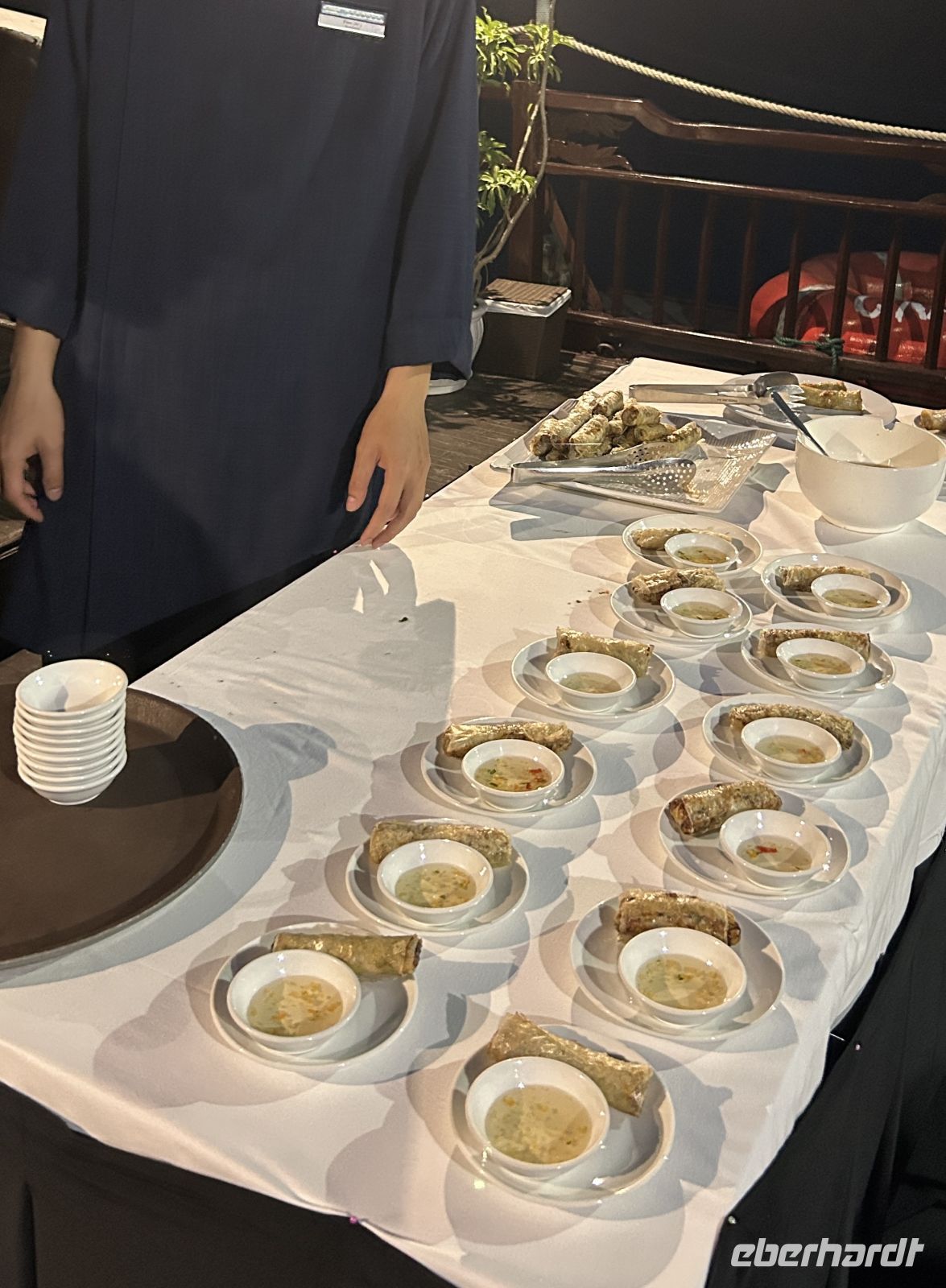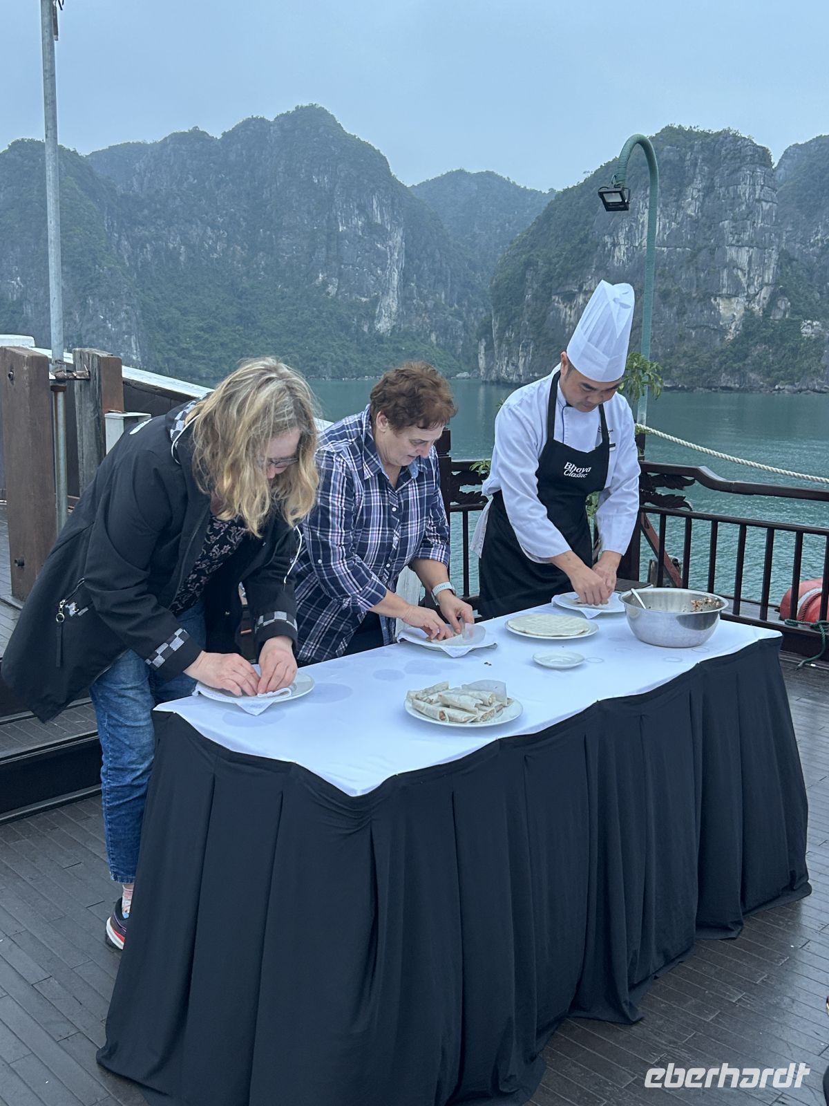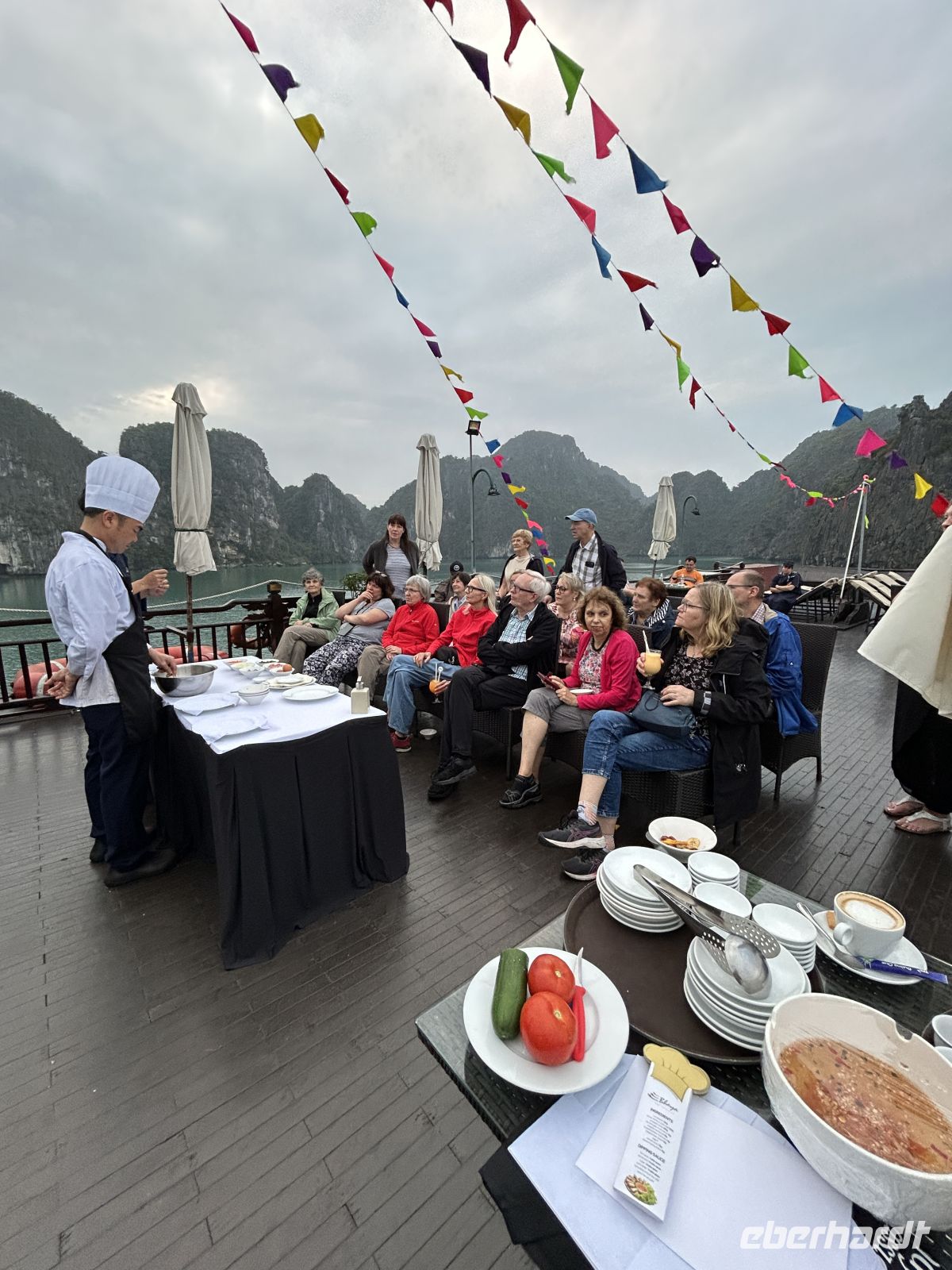 Am Abend erleben wir eine unterhaltsame Kochdemonstration an Deck. Wie macht „Mann“ wohl eine vietnamesische Frühlingsrolle mit einer Hand? Erstaunlich gut! Michael staunt selbst über seine Fingerfertigkeit!