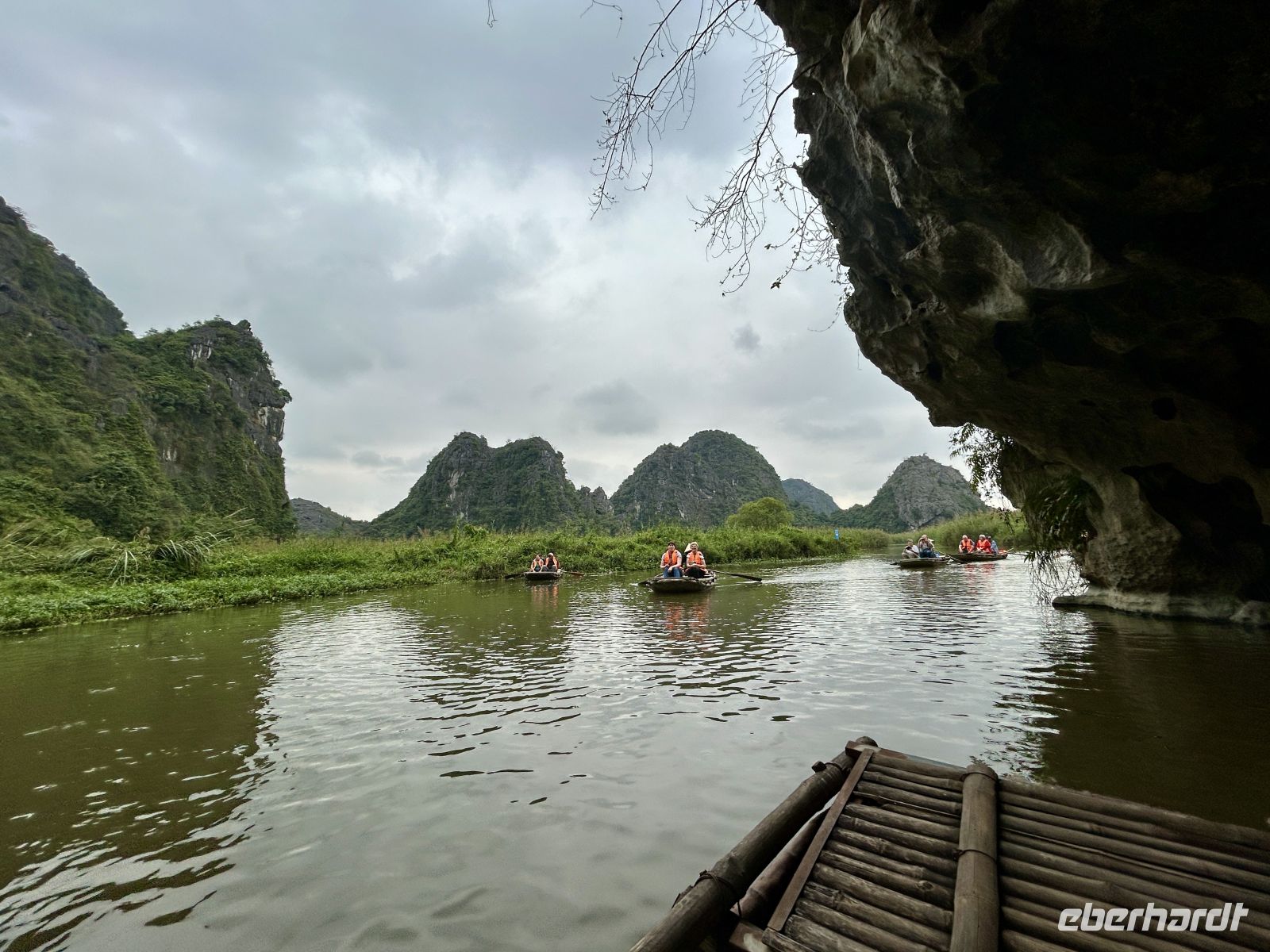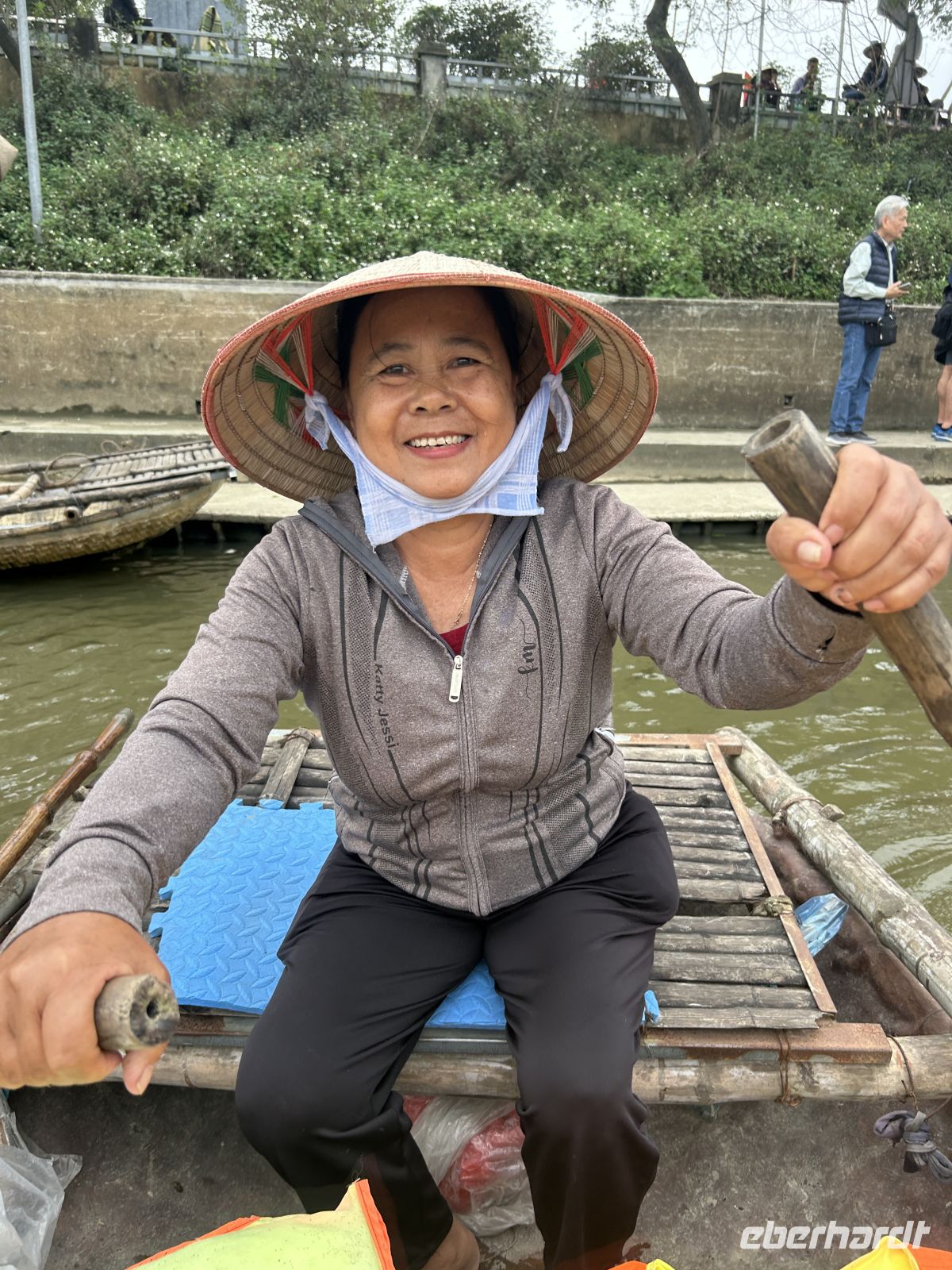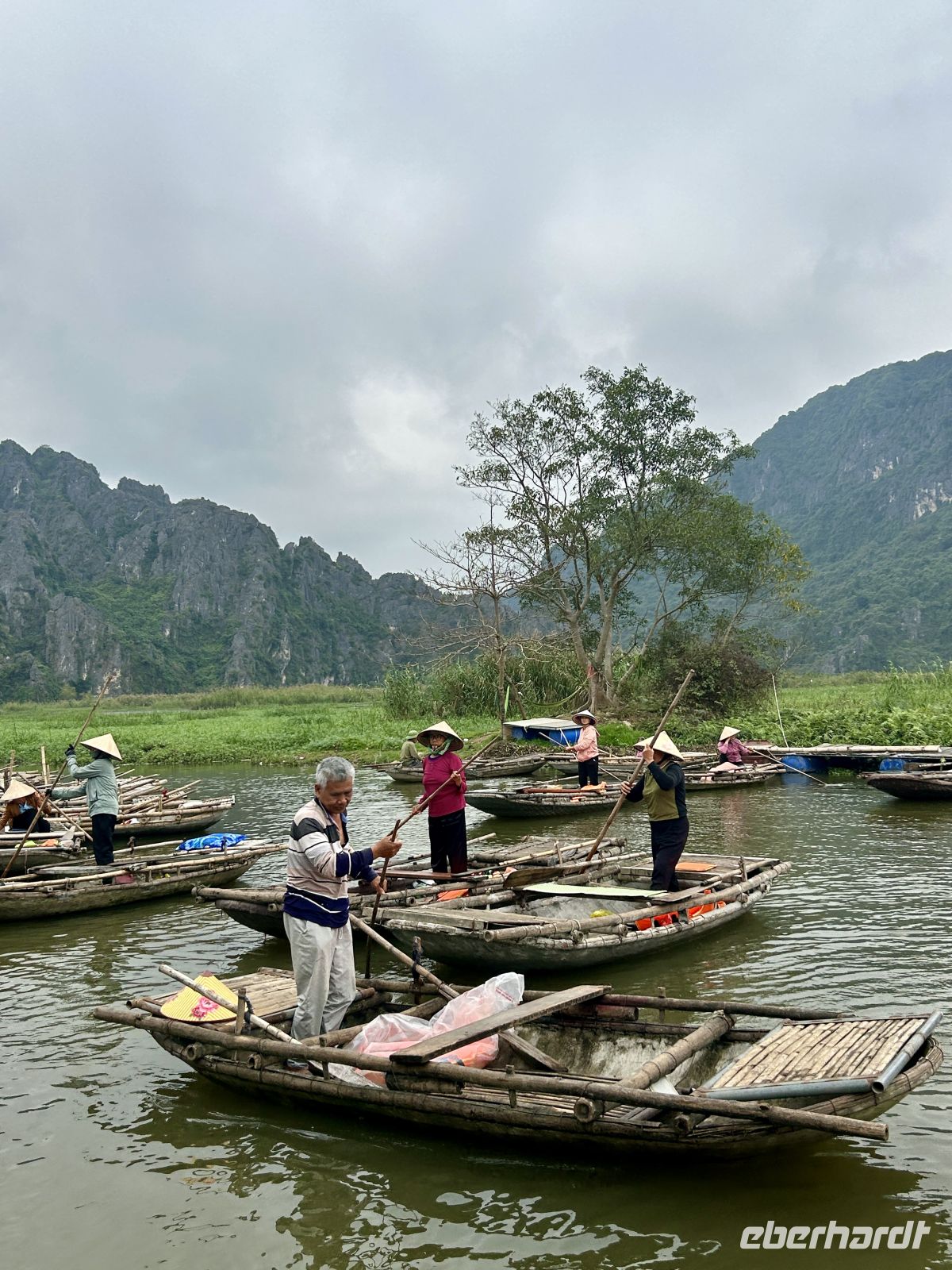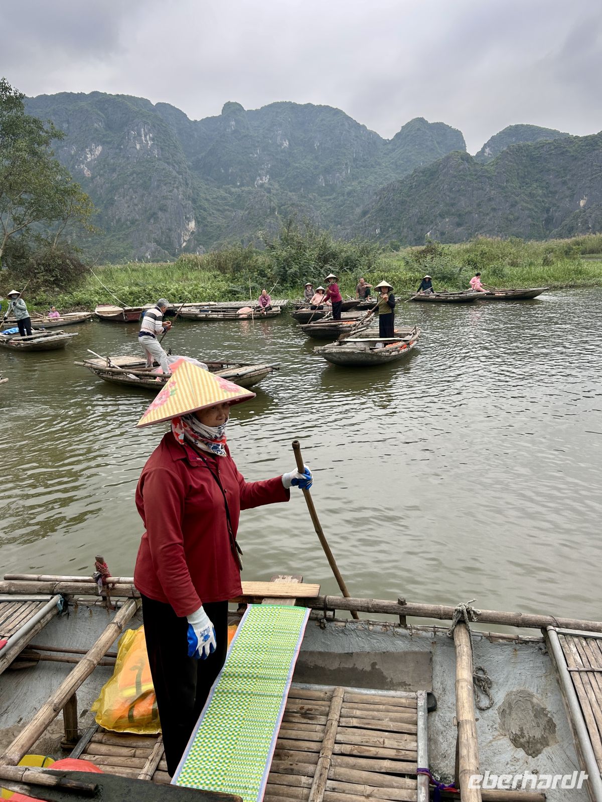 Nach der Ausschiffung treffen wir wieder auf unseren Guide und setzen unsere Reise fort. Unser Ziel: die Region Ninh Binh, oft als „trockene Halong-Bucht“ bezeichnet. Hier erwartet uns ein weiteres Highlight: eine Bootsfahrt durch eine traumhafte Karstlandschaft. In kleinen Bambusbooten gleiten wir lautlos durch Flüsse, vorbei an hoch gewachsenen Reisfeldern, sehen Affen an der Felswand turnen und erreichen niedrige Höhlen – eine Szenerie wie aus einem Gemälde. Interessant ist auch, die offenen Blicke der Ruderfrauen aufzugreifen, die Männer konzentrieren sich auf das Rudern.