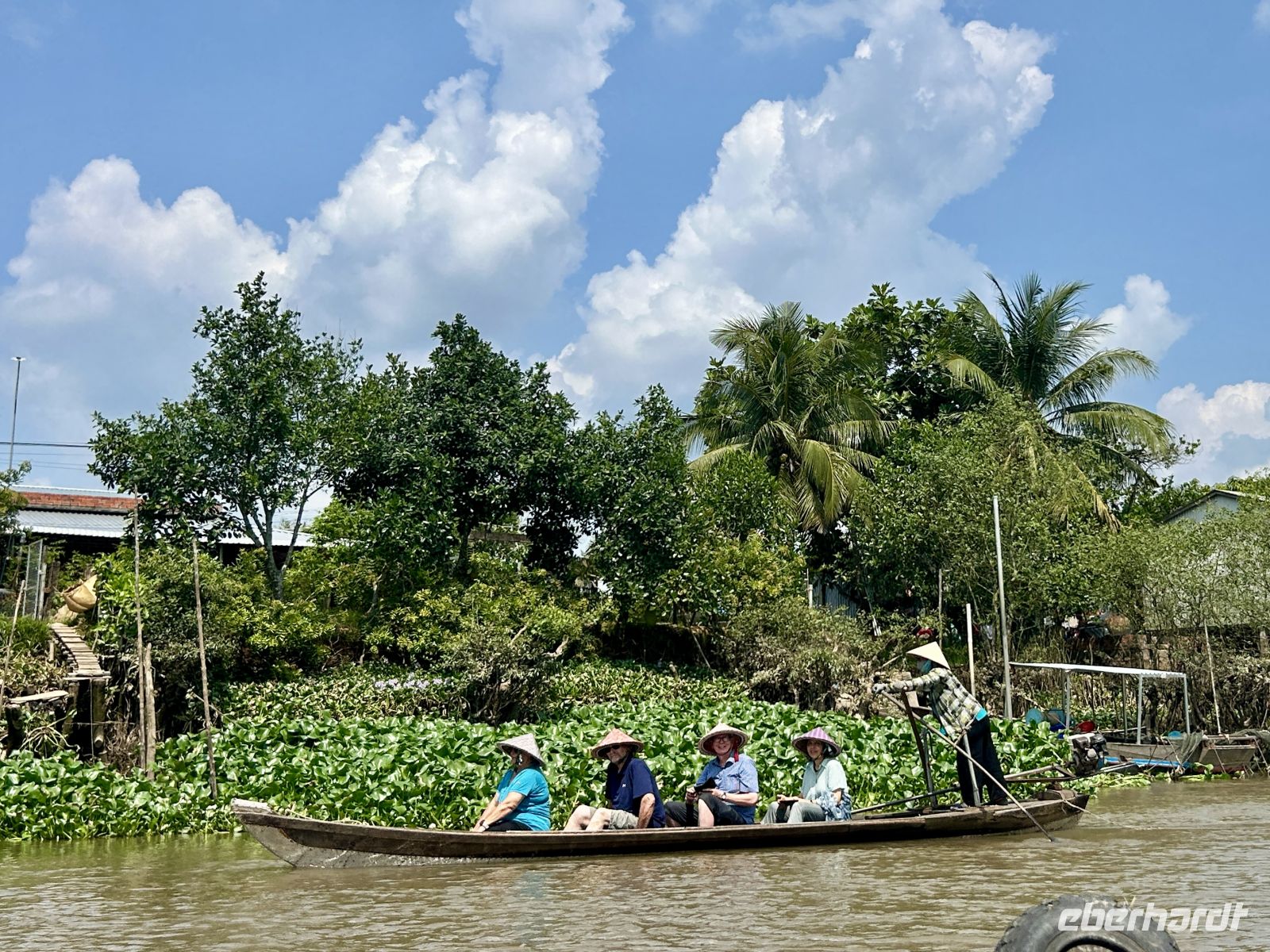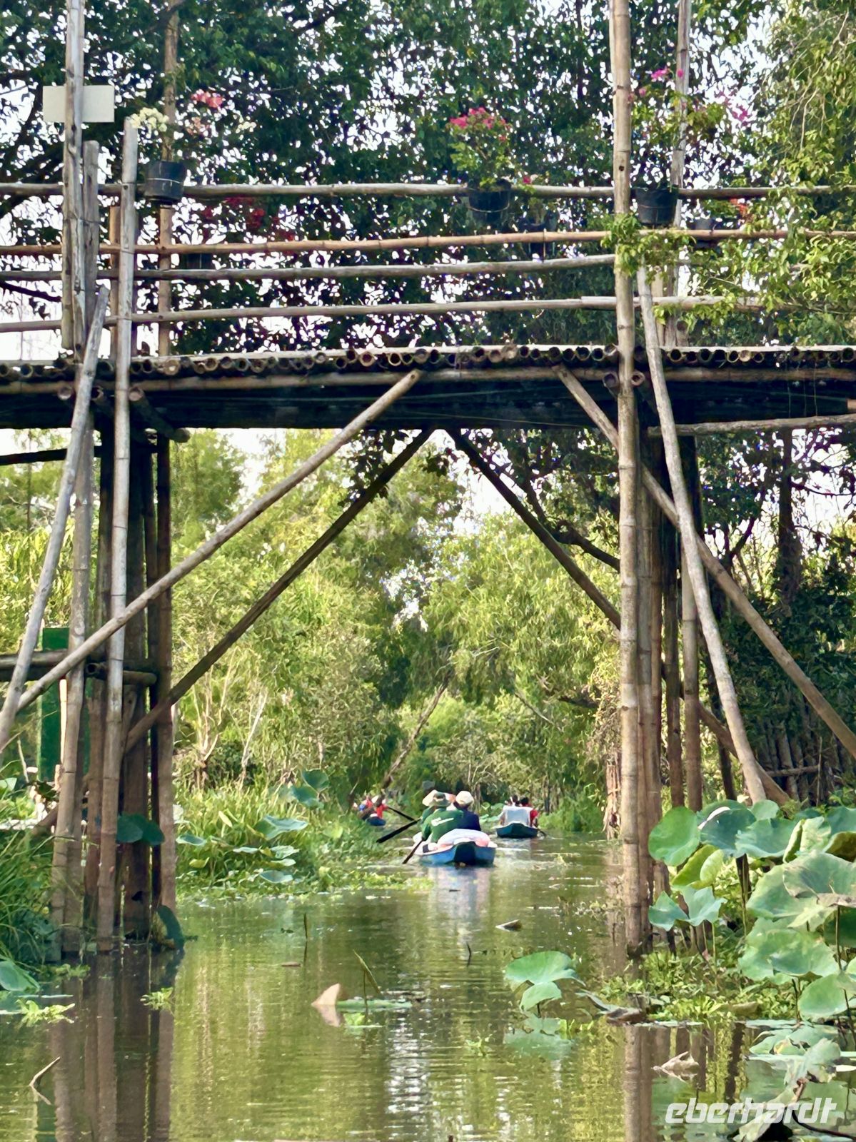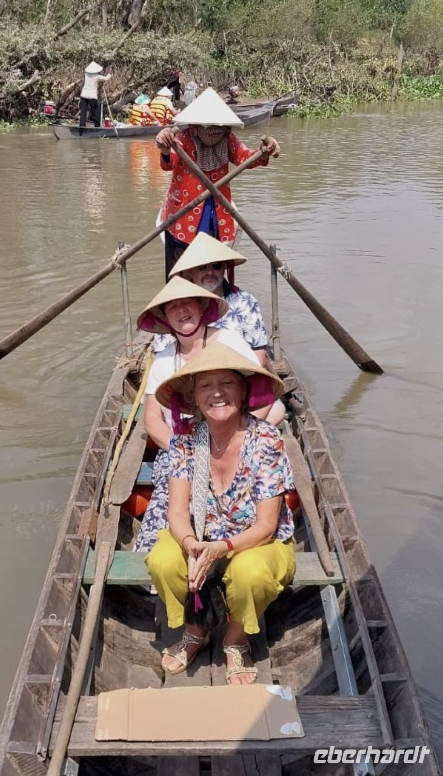 Ein weiteres Highlight ist die gemächliche Fahrt mit kleinen Ruder-Sampans durch enge Wasserwege. Umgeben von dichter Vegetation fühlen wir uns wie in einer anderen Welt.