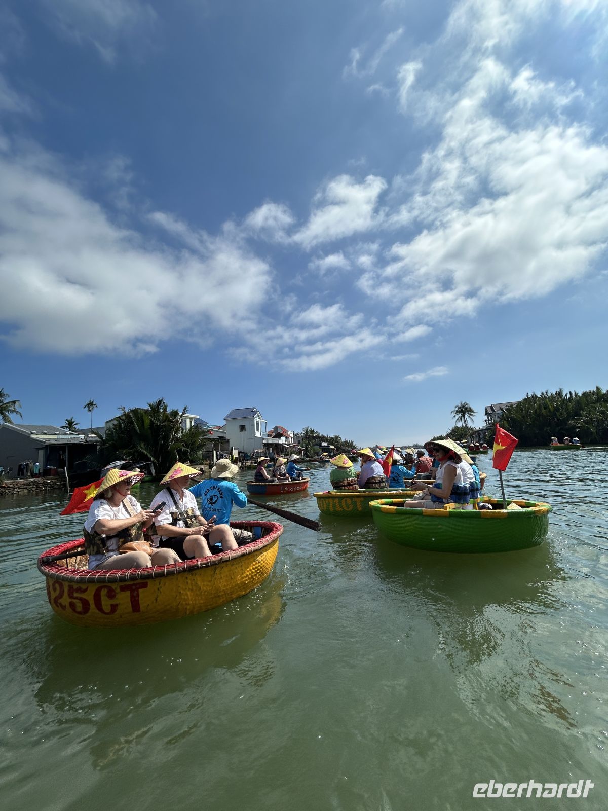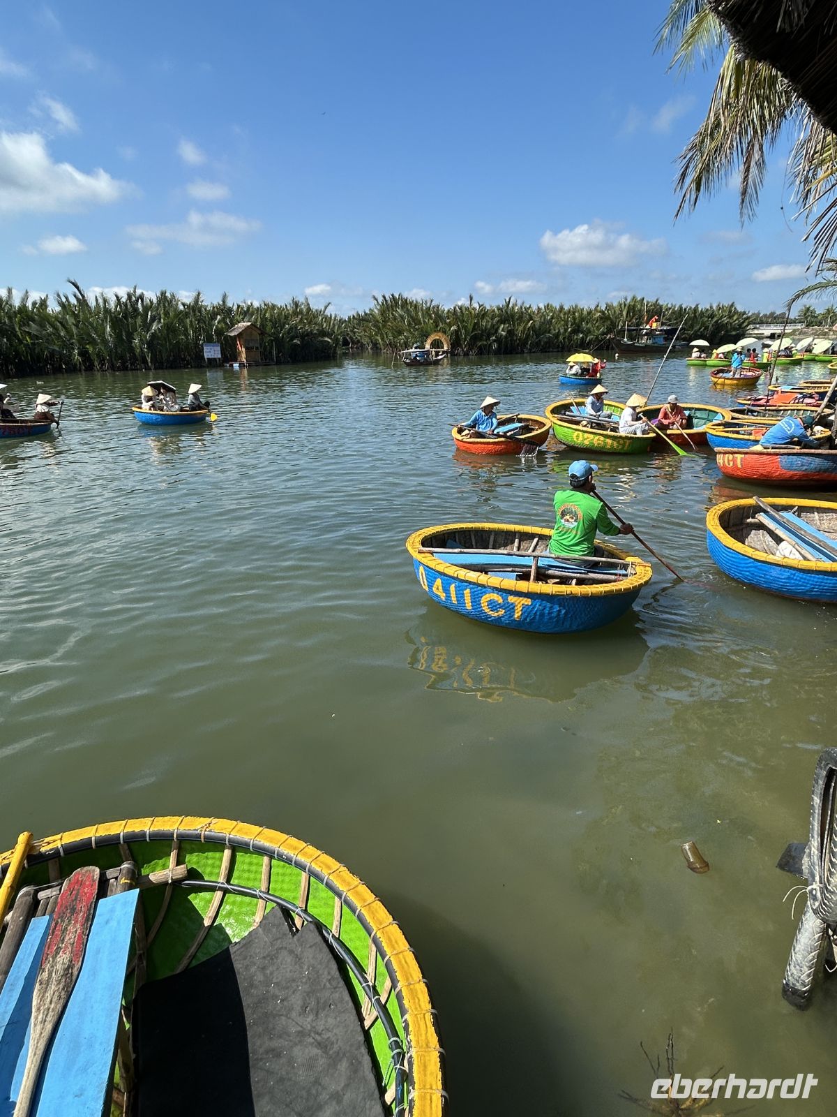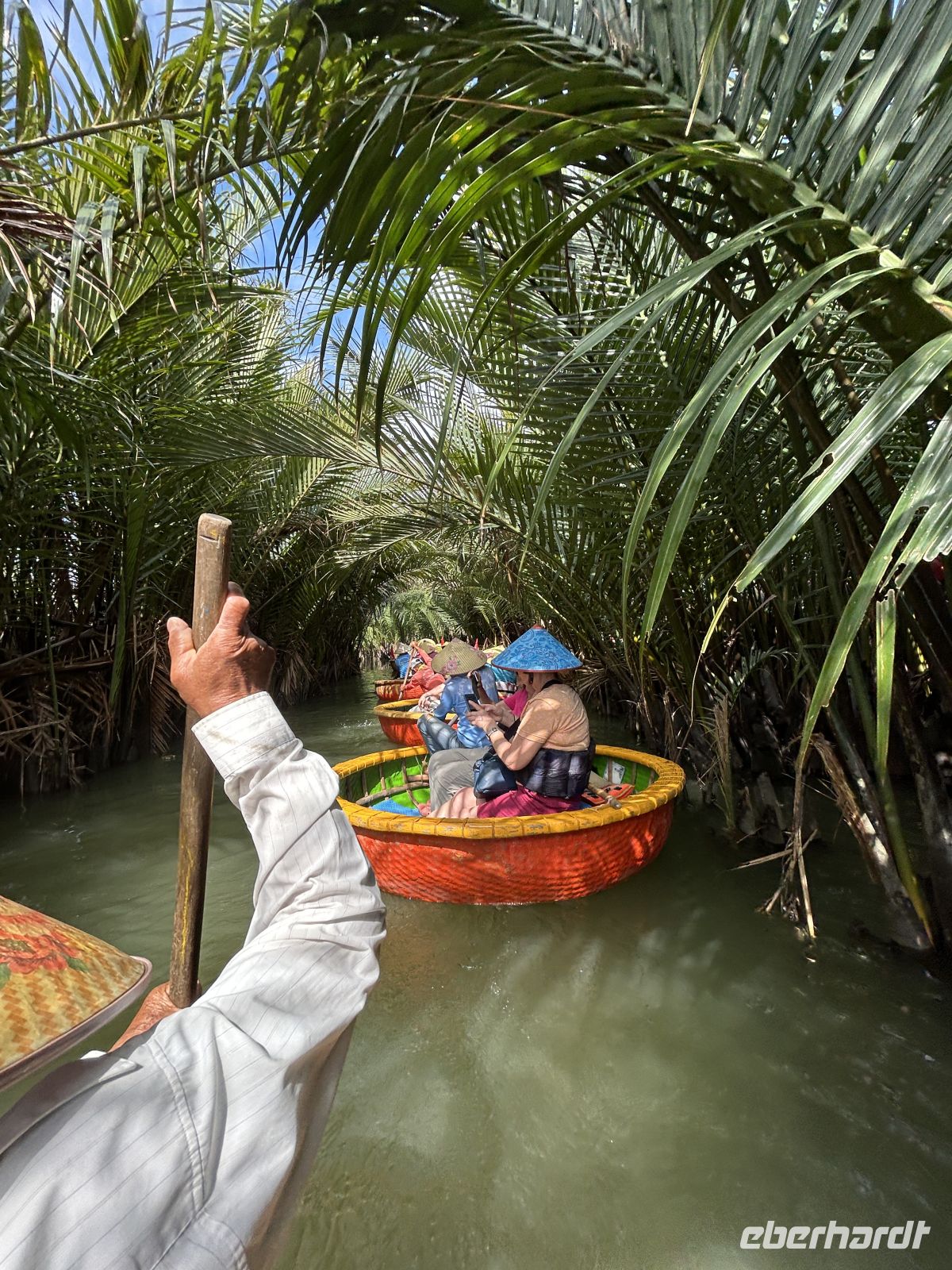 Wir starten mit einer unterhaltsamen Bootsfahrt in traditionellen Rundbooten – ein Erlebnis, das uns sofort in gute Laune bringt. Es ist einiges los auf dem Wasser, die palmengesäumten Nebenarme sind dagegen sehr beschaulich. Frische Kokosnüsse sorgen danach für die perfekte Erfrischung.