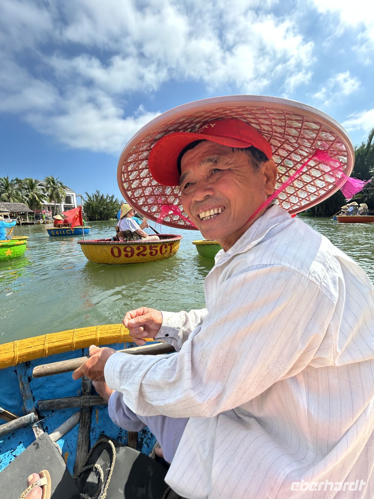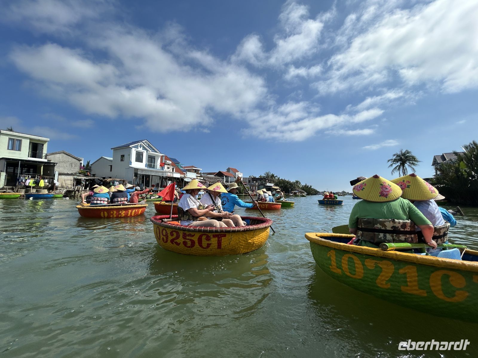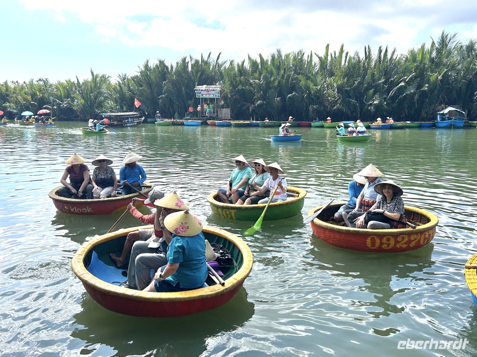 Wir starten mit einer unterhaltsamen Bootsfahrt in traditionellen Rundbooten – ein Erlebnis, das uns sofort in gute Laune bringt. Es ist einiges los auf dem Wasser, die palmengesäumten Nebenarme sind dagegen sehr beschaulich. Frische Kokosnüsse sorgen danach für die perfekte Erfrischung.
