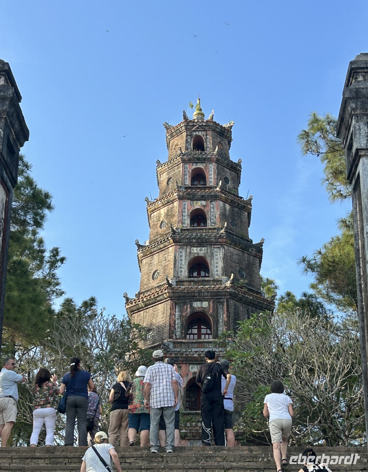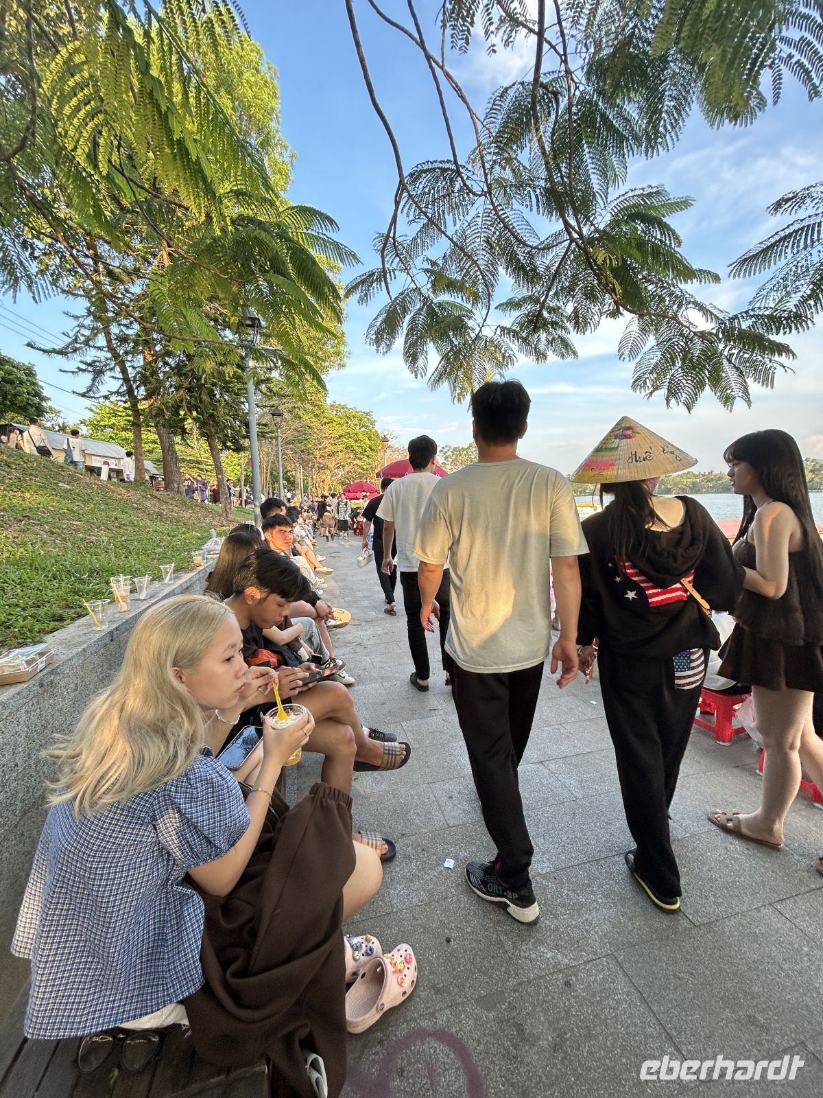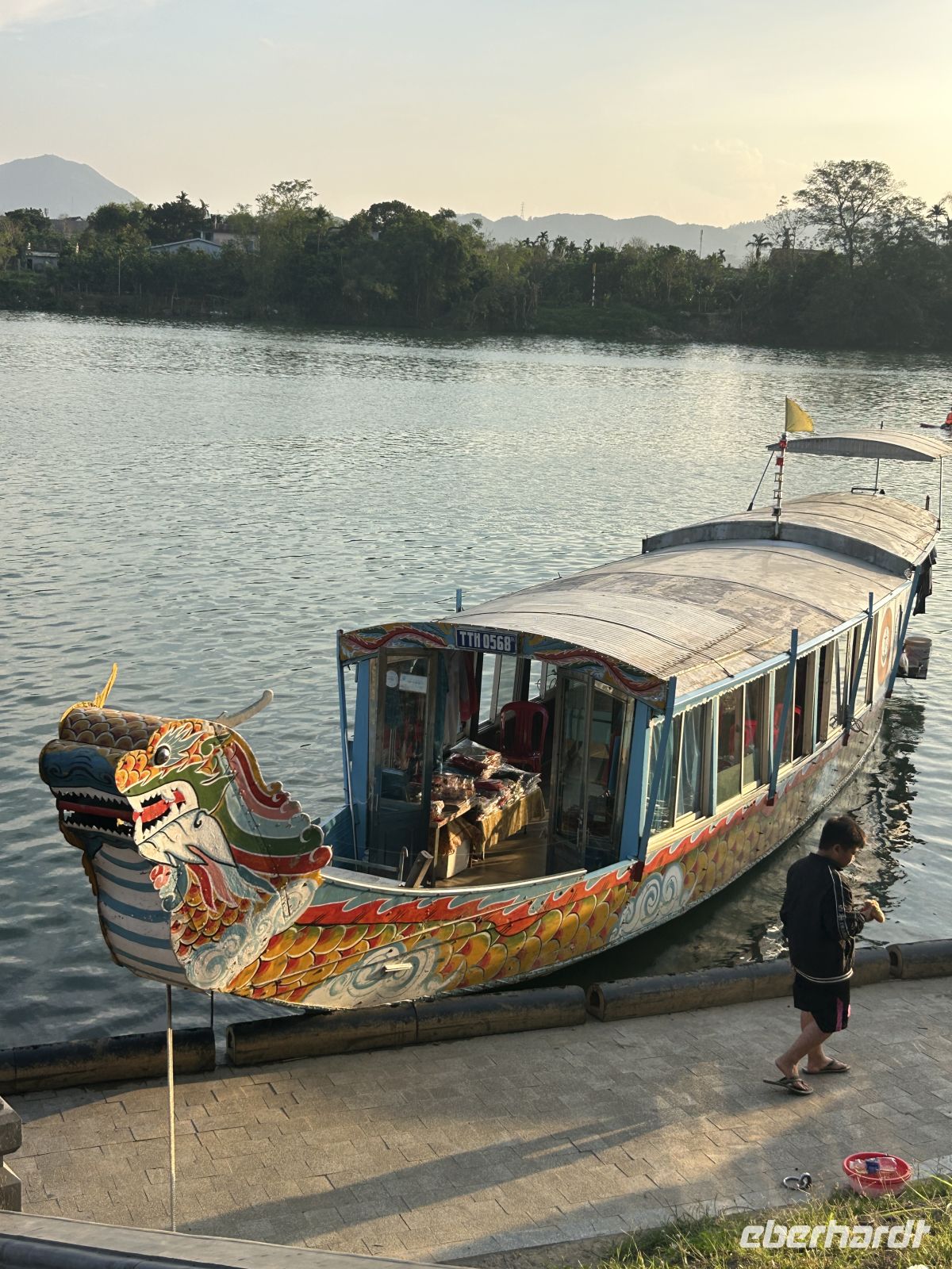 Wir besuchen die beeindruckende siebenstöckige Thien-Mu-Pagode, eines der ältesten religiösen Bauwerke des Landes. Jedes Stockwerk stellt eine Inkarnation Buddhas dar. Die Pagode wurde im Jahr 1601 erbaut und gilt als spirituelles Wahrzeichen der Region. Noch heute leben Mönche in der Anlage des weitläufigen Gartens. Wir schlendern durch die Gärten und schließlich hinunter zum Flussufer, wo Drachenboote in leichten Wellen schaukeln und die langsam versinkende Sonne ein besonderes Licht auf den Fluss wirft. Viele junge Pärchen genießen diese Idylle hier und lassen sich dabei allerlei Köstlichkeiten schmecken.