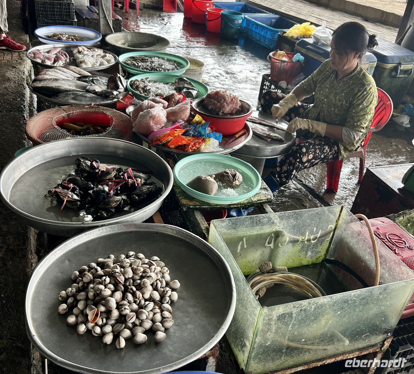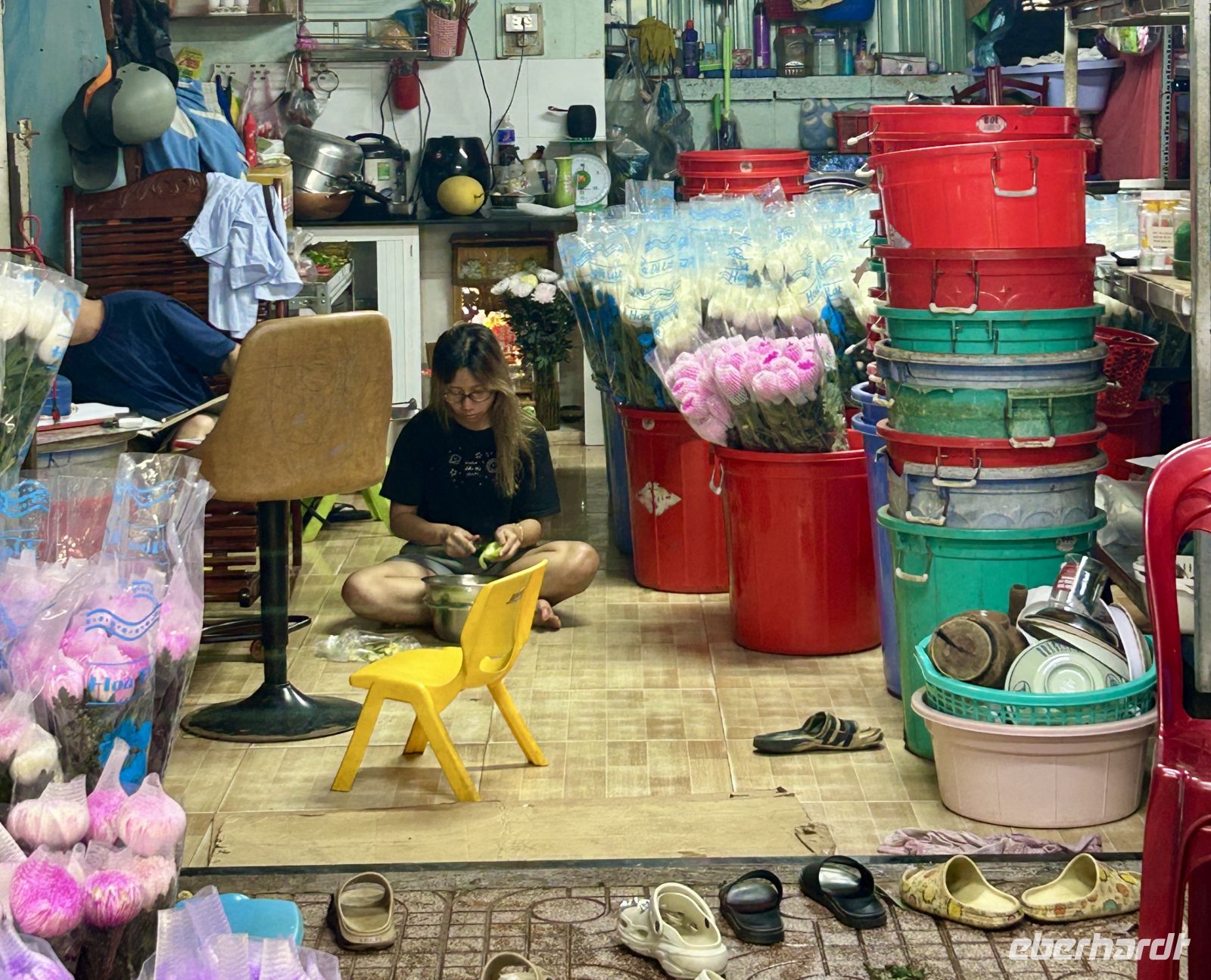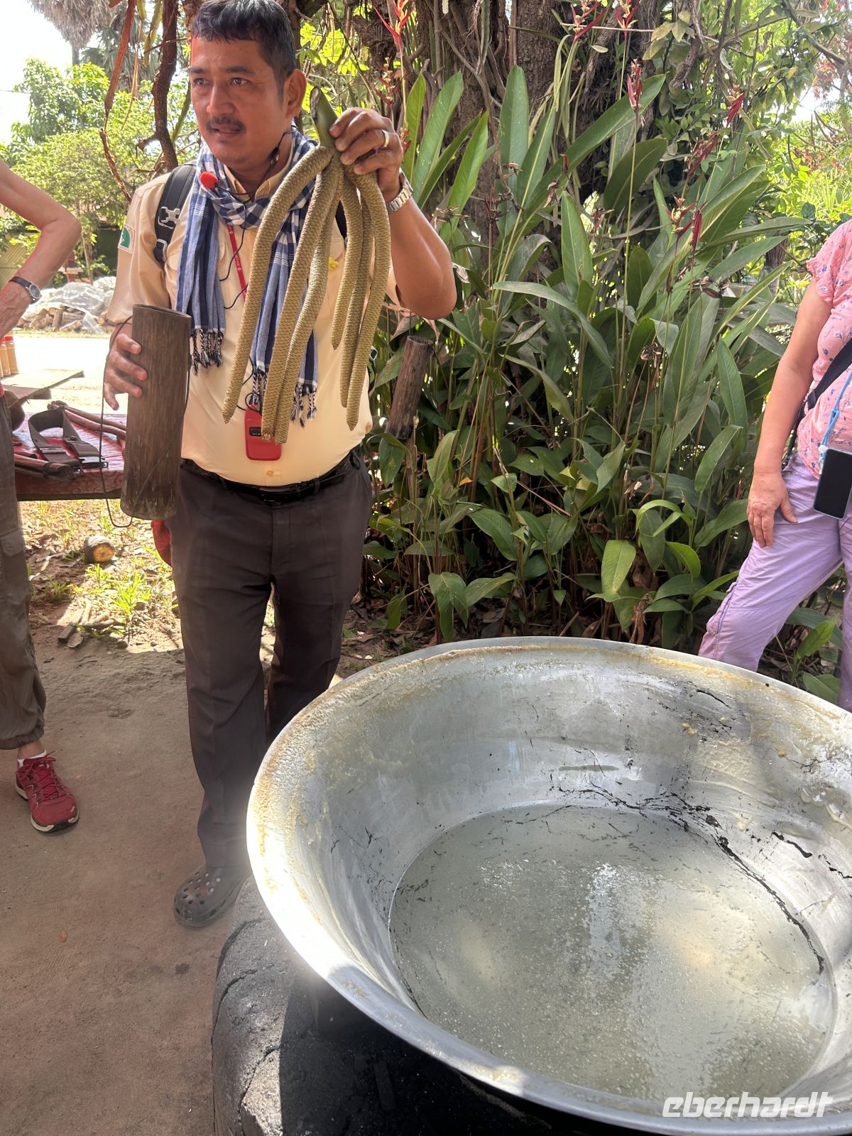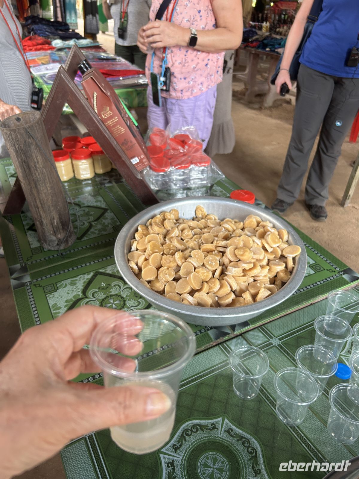 Mit unserem Boot gleiten wir durch diese Wasserwelt. Wir besuchen eine Manufaktur, in der Kokosnüsse zu verschiedensten Produkten verarbeitet werden – von Süßigkeiten bis hin zu Fladenbrot.
