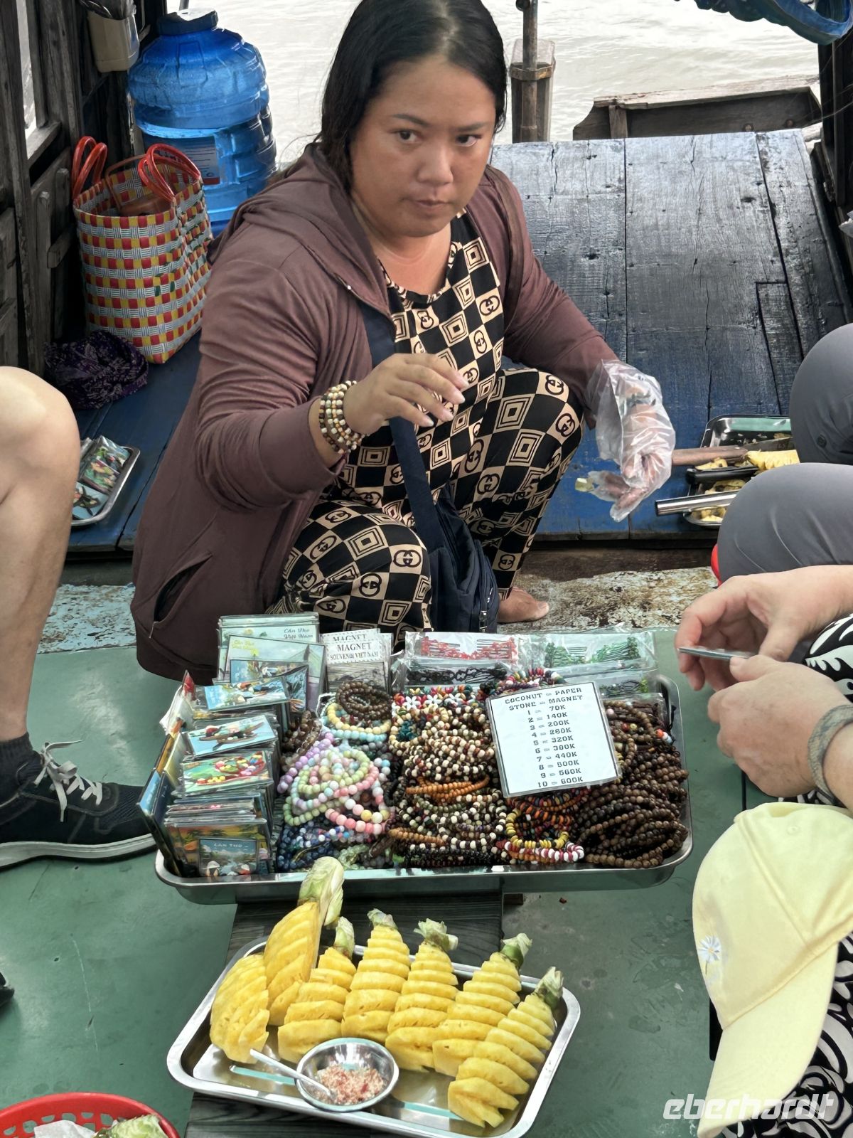 Früchte werden uns direkt vom Boot aus gereicht – frischer geht es kaum und natürlich kosten wir die leckere, süße Ananas. Kein Vergleich zu dem, was bei uns manchmal als Ananas verkauft wird.