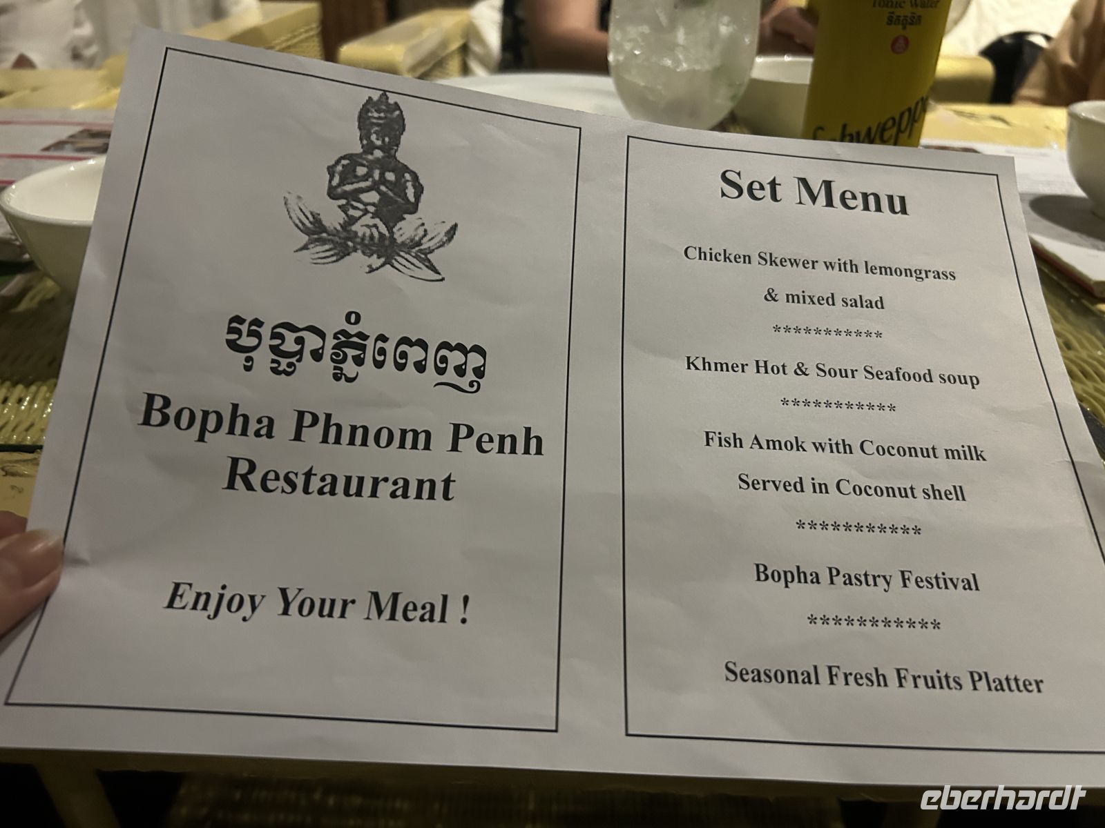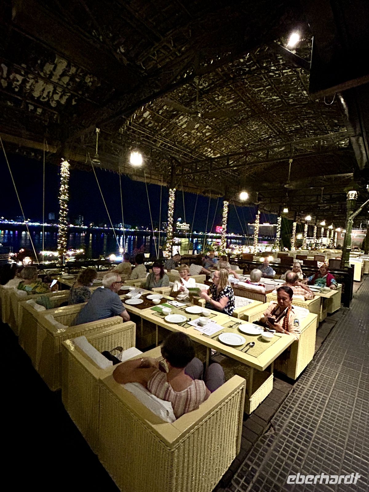 Am Abend genießen wir unser Essen im wunderschön gelegenen Restaurant Bopha Phnom Penh Titanic direkt am Fluss – ein stimmungsvoller Ausklang dieses ereignisreichen Tages.