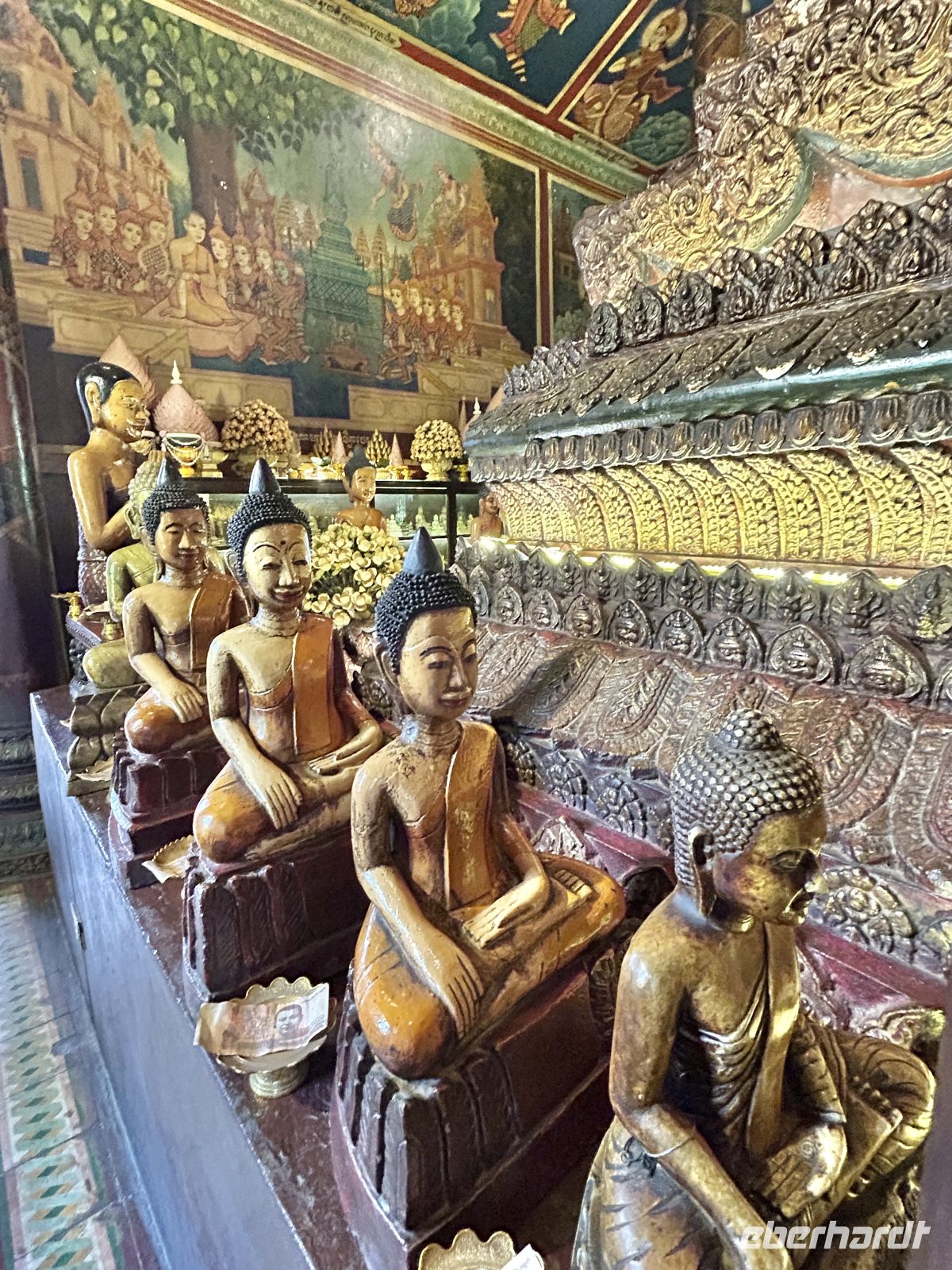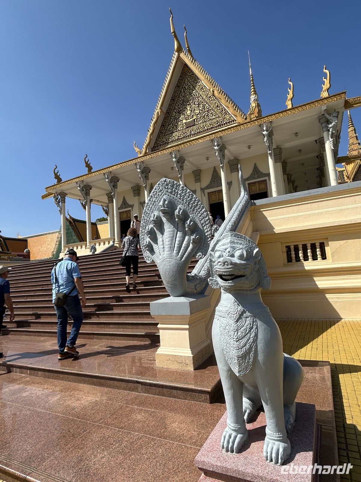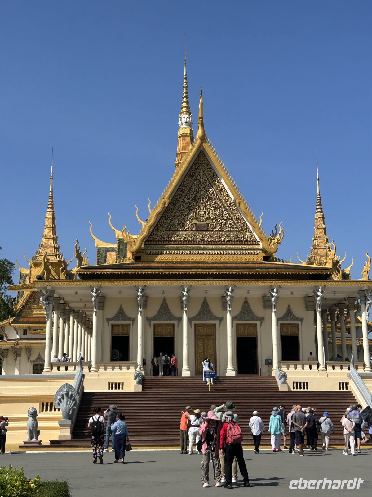 Wir erkunden die Hauptstadt Kambodschas. Der prachtvolle Königspalast mit der Thronhalle im Zentrum und den von Nagaschlangen gesäumten Treppenaufgängen sowie die angrenzende Silberpagode zeigen den Glanz der Monarchie. Im Nationalmuseum finden sich zahlreiche Schätze der Khmer-Kunst, hinduistische und buddhistische Götterstatuen, die in Angkor nicht mehr zu sehen sind. Am Wat Phnom erfahren wir schließlich die Legende von „Mama Penh“, nach der die Stadt benannt ist. Einen Geldschein mit dem Lippenstift von Mama Penh schenkt uns unsere Reiseleiterin Samnang, ganz in dem Glauben, dass uns dies finanzielle Fülle bescheren möge.