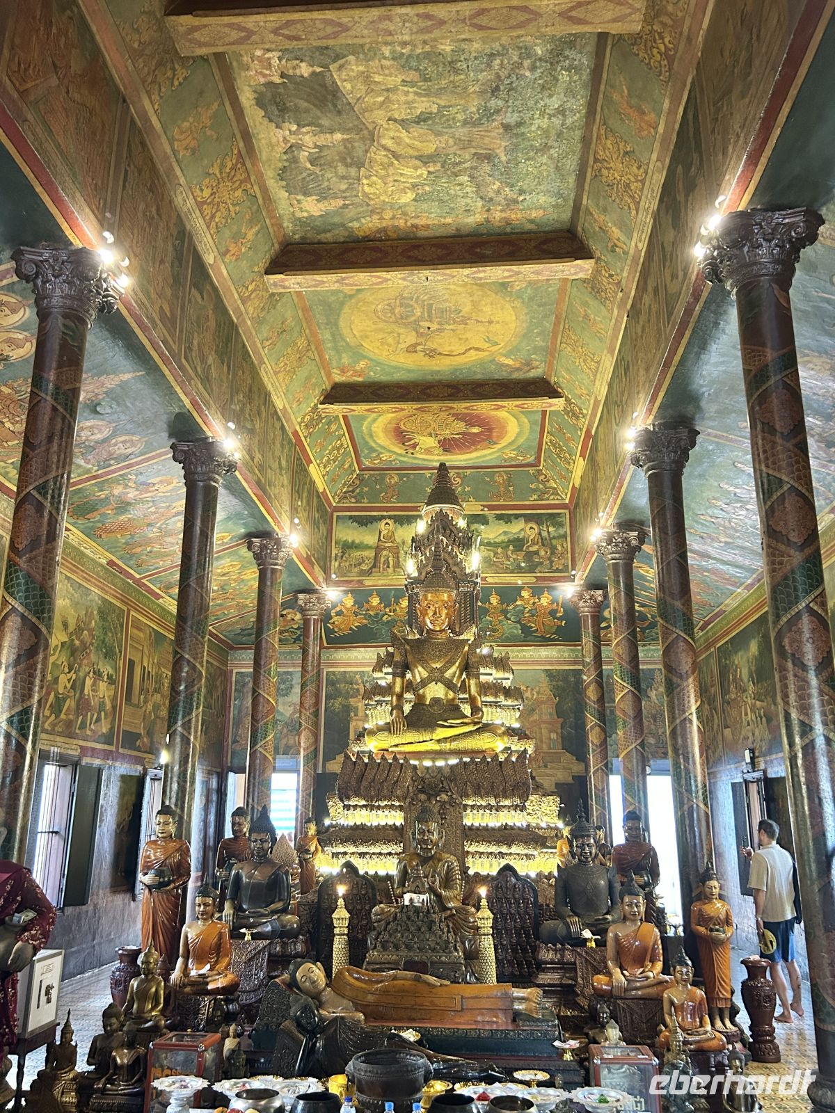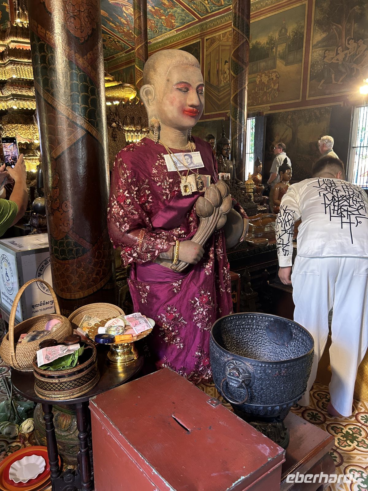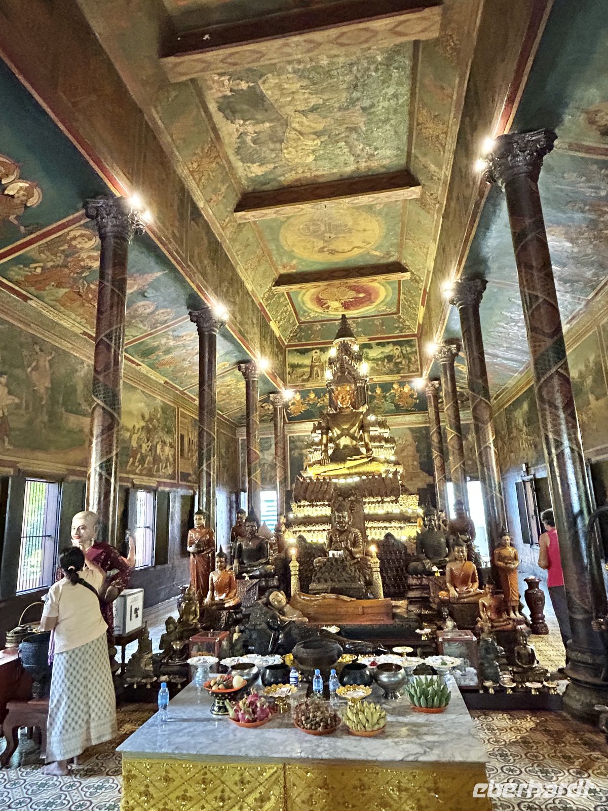 Wir erkunden die Hauptstadt Kambodschas. Der prachtvolle Königspalast mit der Thronhalle im Zentrum und den von Nagaschlangen gesäumten Treppenaufgängen sowie die angrenzende Silberpagode zeigen den Glanz der Monarchie. Im Nationalmuseum finden sich zahlreiche Schätze der Khmer-Kunst, hinduistische und buddhistische Götterstatuen, die in Angkor nicht mehr zu sehen sind. Am Wat Phnom erfahren wir schließlich die Legende von „Mama Penh“, nach der die Stadt benannt ist. Einen Geldschein mit dem Lippenstift von Mama Penh schenkt uns unsere Reiseleiterin Samnang, ganz in dem Glauben, dass uns dies finanzielle Fülle bescheren möge.