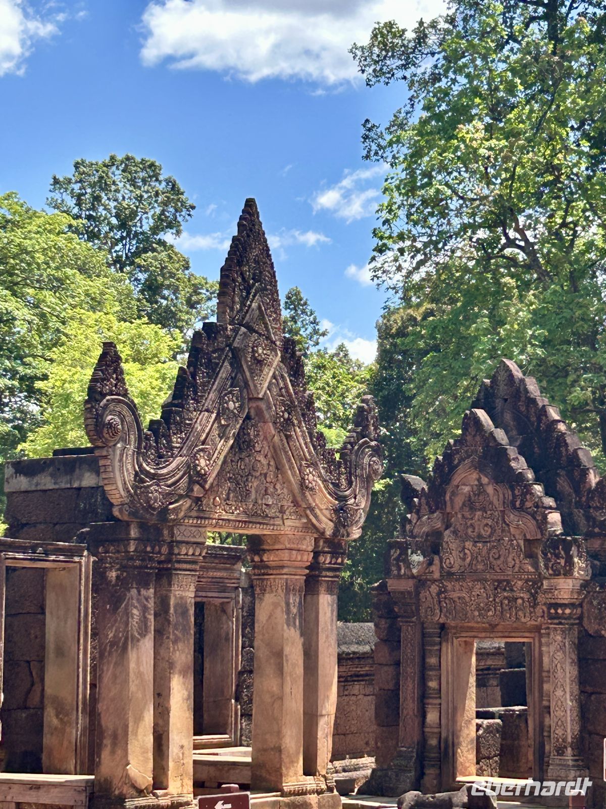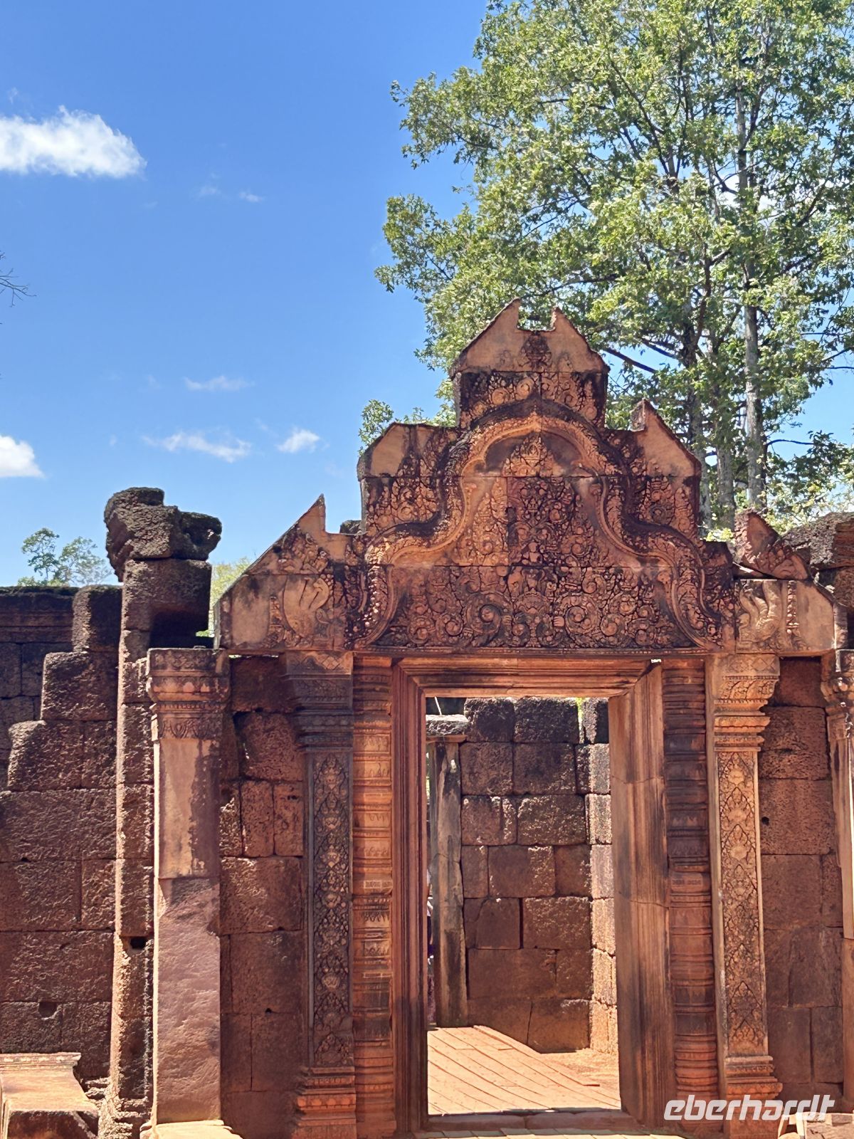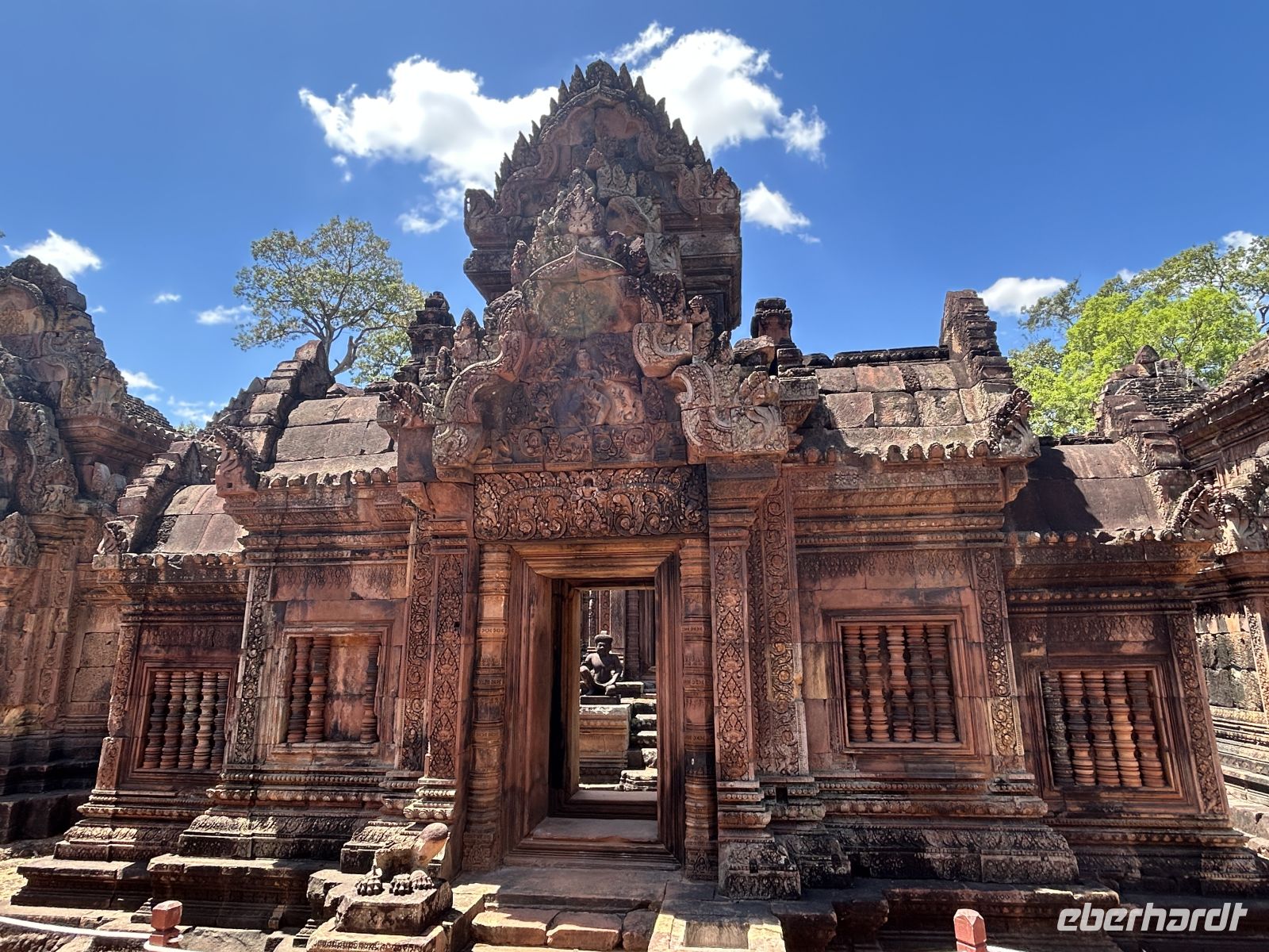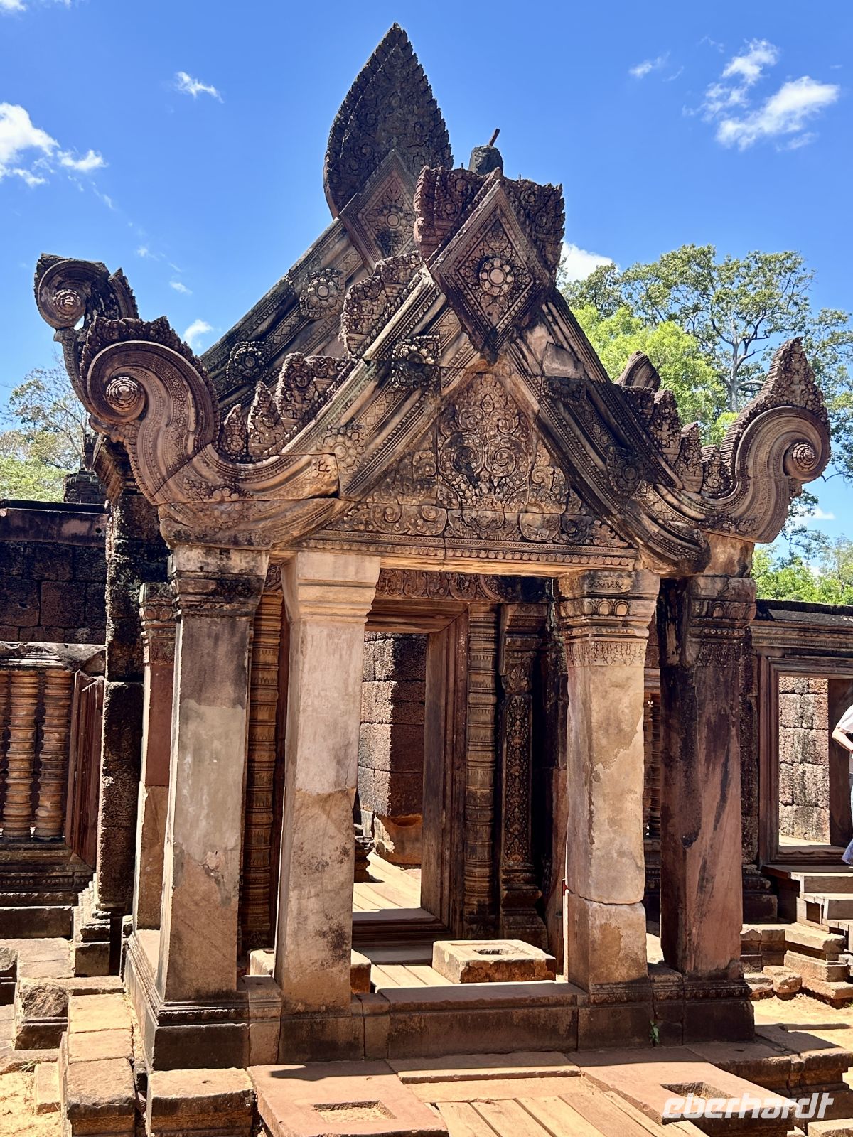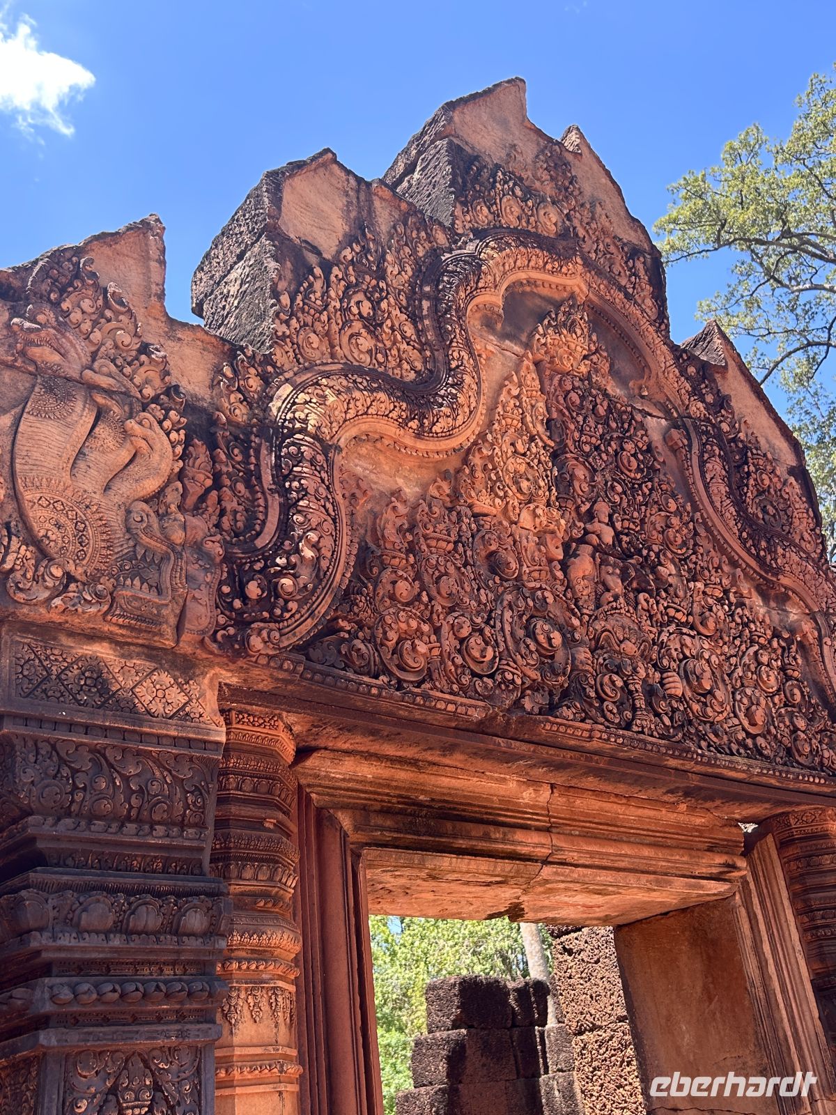 Weiter geht es zum kunstvoll verzierten Tempel Banteay Srei, bekannt für seine filigranen Reliefs aus rosafarbenem Sandstein. Hier ist alles etwas kleiner, dafür um so kunstvoller und ausdrucksstark erhalten. Auf dem Rückweg erfahren wir Interessantes über die Herstellung von Palmzucker und wissen endlich wie Cashewnüsse wachsen.