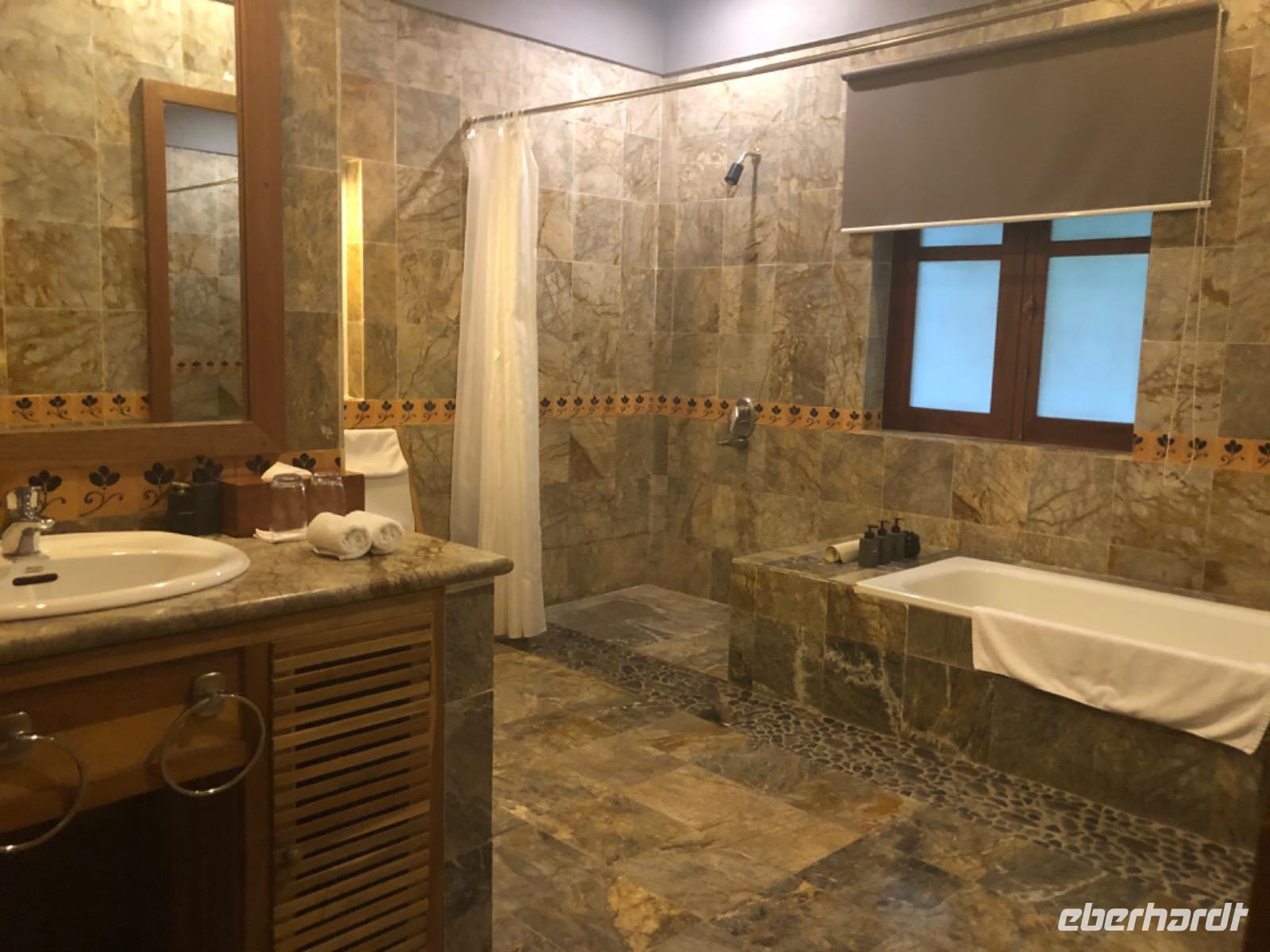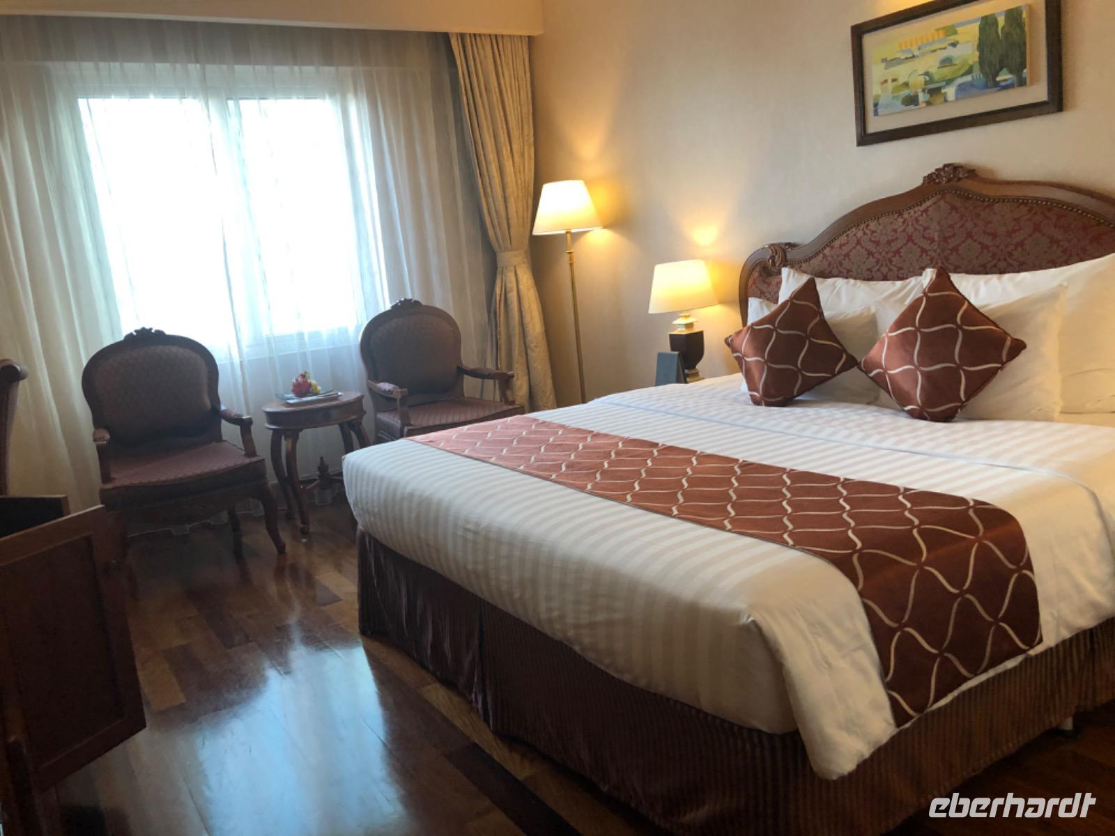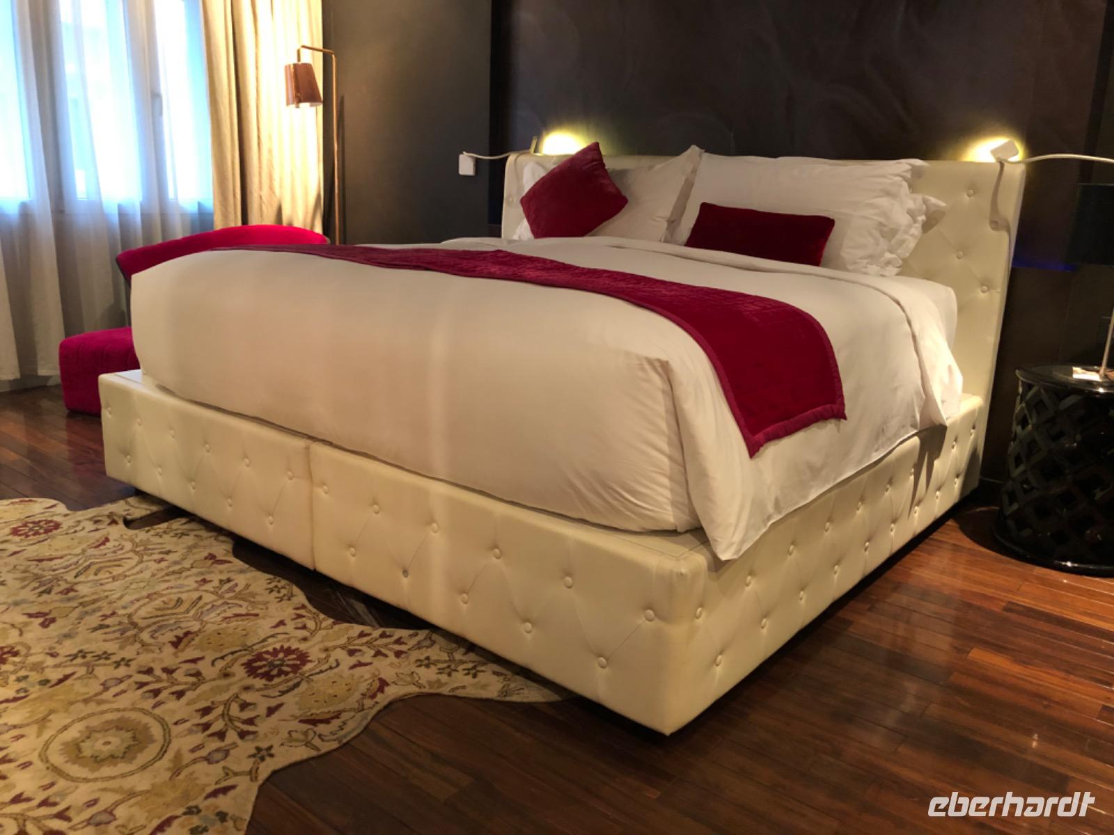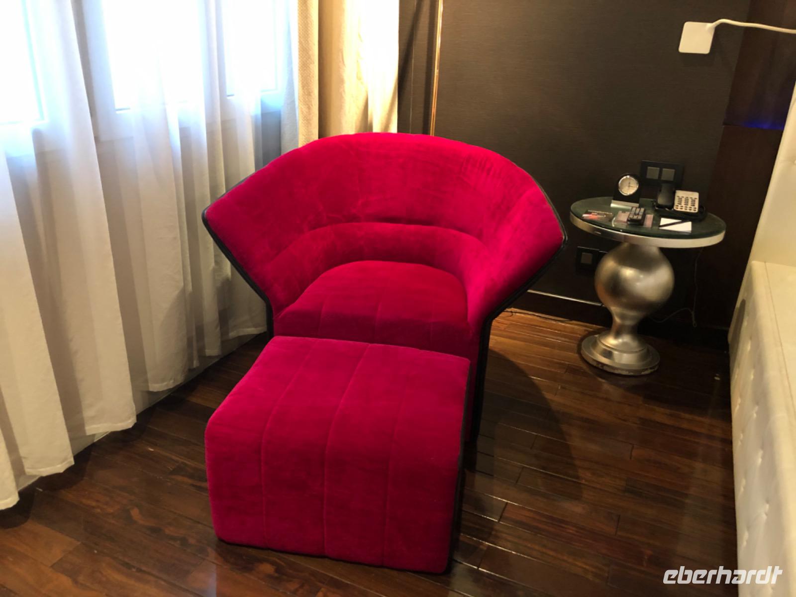 Als wir dann die Zimmer beziehen, entpuppen sich diese als wahre Luxuszimmer. Große Betten, vor allem eine bestimmt dreißig Zentimeter hohe Matratze, ein samtroter Diwan und der Fernseher hat einen silbernen Rahmen. Es gibt einen Schreibtisch, einen großen Schrank, eine gut gefüllte Minibar, Bademäntel und Hausschuhe. Das Bad ist bestückt mit Hygieneartikeln, Toilette und Dusche sind separat abgeteilte Räume im Bad.