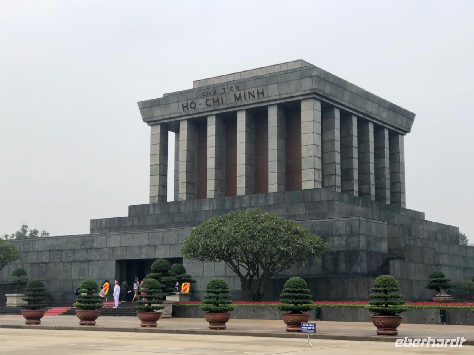 Wir fahren zunächst zum Mausoleum von Ho Chi Minh. Die Straßen sind voll mit Motorrädern, aber Diep meint, dass es nicht so voll ist wie normal, denn es sind keine Familien unterwegs. Kindergärten und Schulen sind wegen dem Corona Virus geschlossen und die Kinder müssen zu Hause bleiben. Auch die Schlange vor dem Mausoleum hält sich in Grenzen, wir kommen zügig hinein. Überall stehen junge Männer in weißen Uniformen und achten darauf, dass alles seine Ordnung hat. Bis zum Mausoleum führt ein überdachter Weg, dann geht es eine Treppe hinauf und dort hält Onkel Ho seine ewige Ruhe.