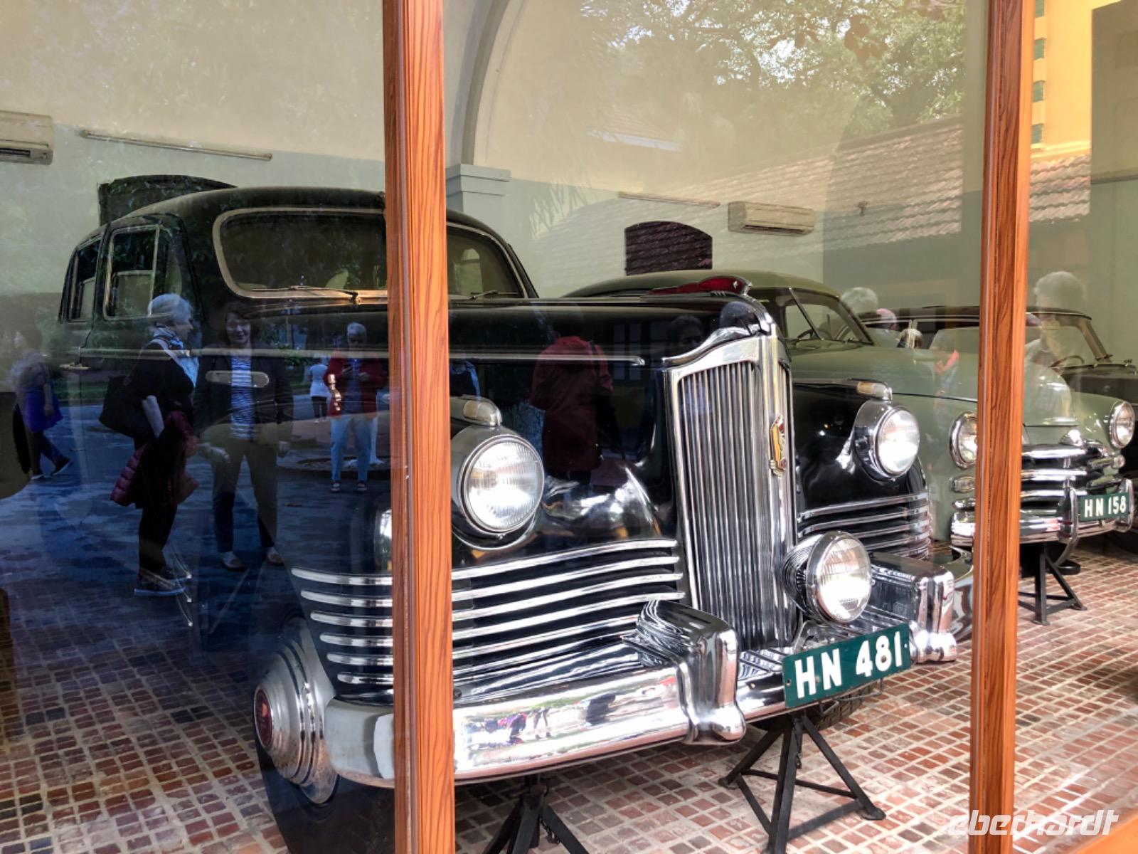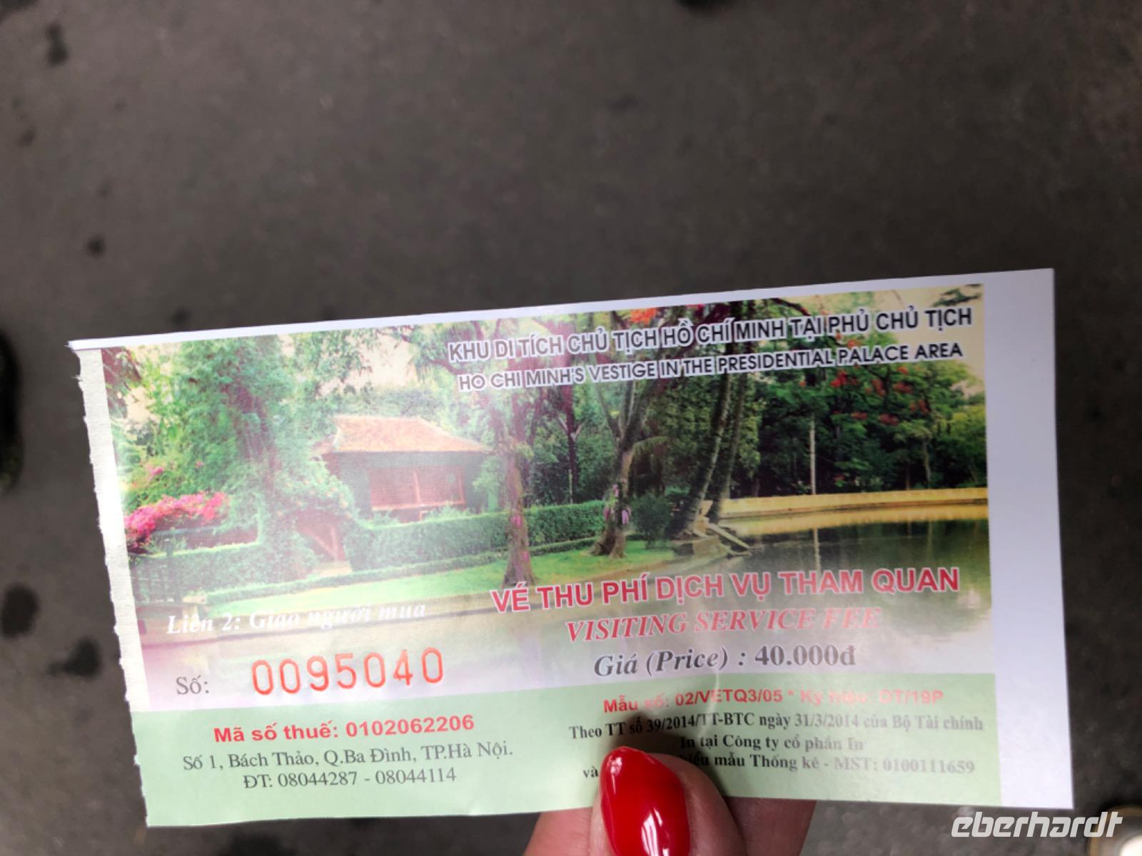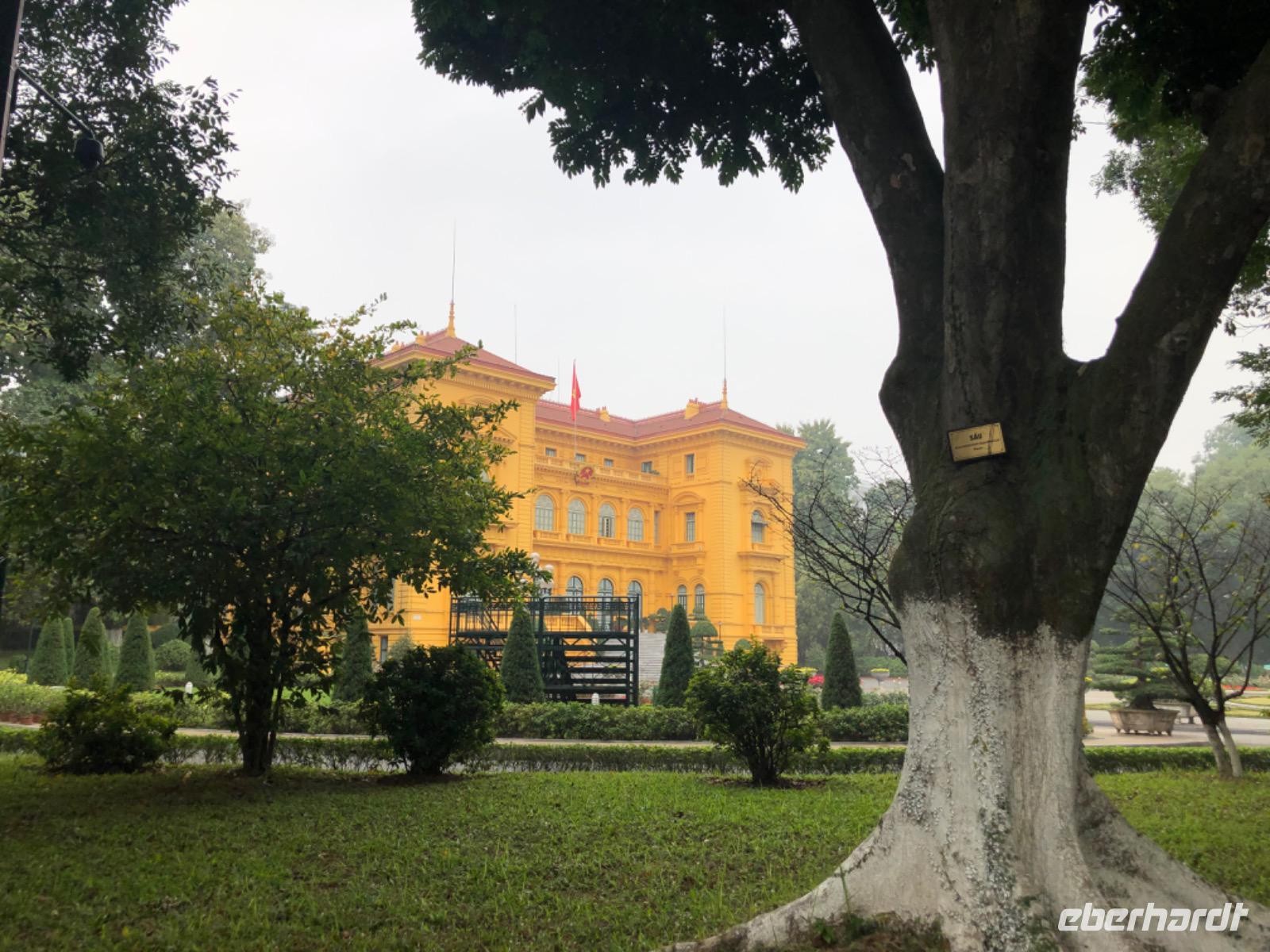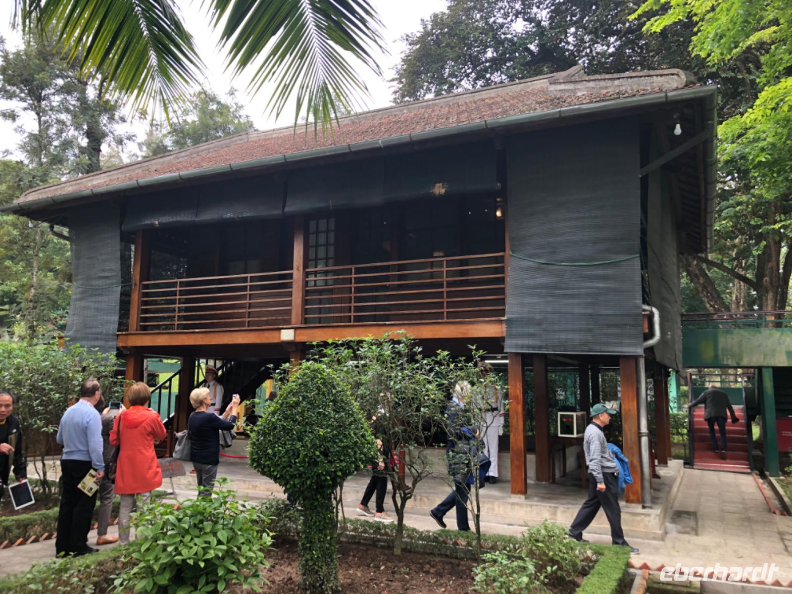 Nun besuchen wir das Gelände, wo sich der Präsidentenpalast befindet, in dem Ho Chi Minh nie gewohnt hat, weil er der Meinung war, das Gebäude sei zu groß für einen einzelnen Bewohner. So blieb der Palast hochrangigen Gästen vorbehalten. Das Wohnhaus von Ho Chi Minh ist dagegen bescheiden, zwei einfache Zimmer mit Bett und Schreibtisch. Auch das etwas exklusiver erscheinende Stelzenhaus, in dem Ho Chi Minh seine letzten Lebensjahre verbrachte, ist einfacher als der Präsidentenpalast. Zu besichtigen sind außerdem drei Autos, die Hoh Chi Minh während seiner Amtszeit zur Verfügung standen.