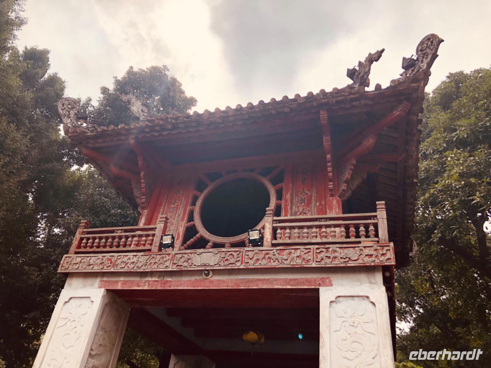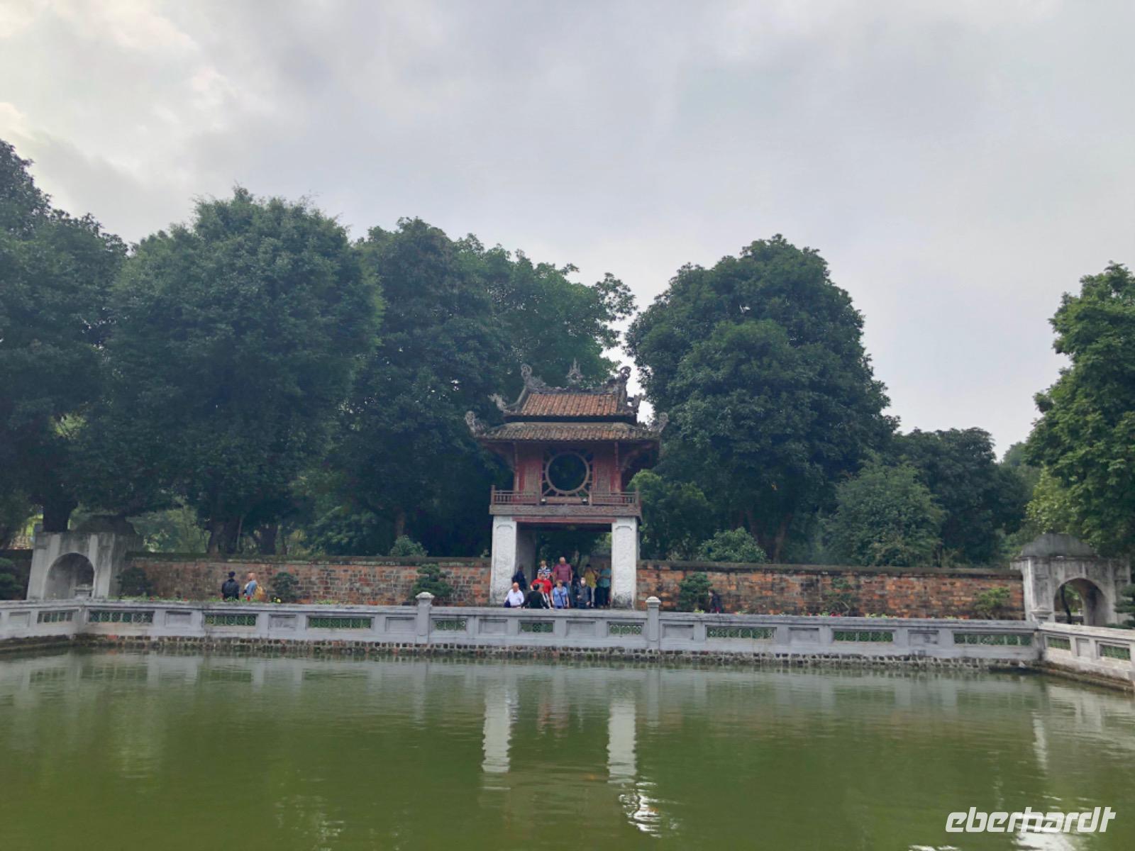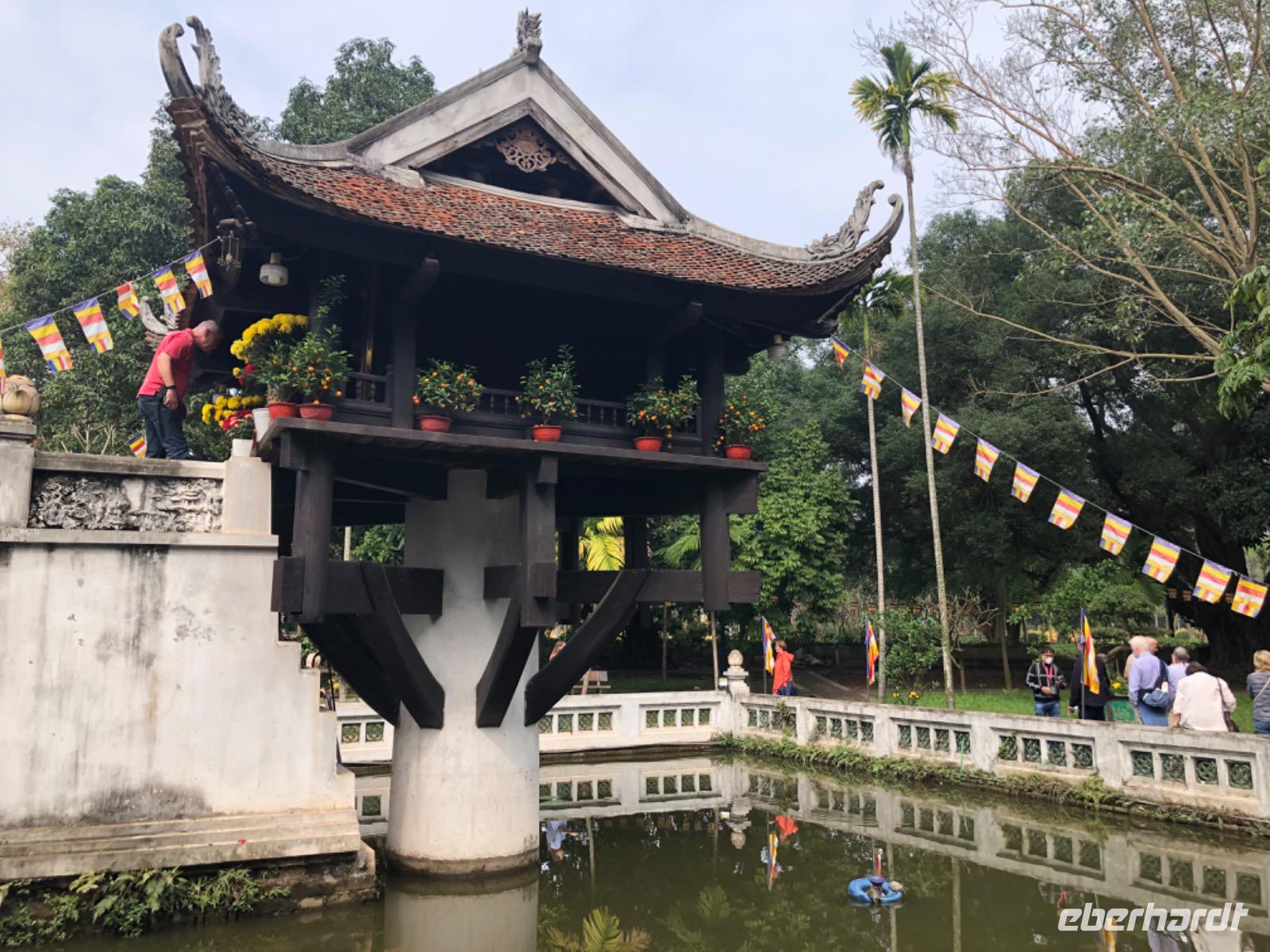 Bevor wir zum Literaturtempel fahren, besuchen wir die Ein-Säulen-Pagode, die ebenso wie der Schildkrötenturm im Hoan-Kiem-See als Wahrzeichen der Stadt gilt. Fast sieht sie aus wie das Hexenhaus im russischen Märchenfilm Abenteuer im Zauberwald, das auf einem Hühnerbein steht. Allerdings ist das „Hühnerbein" der Pagode einmal eine Säule aus Holz gewesen, die vor etlichen Jahren durch eine Betonsäule ersetzt wurde. Dadurch ist der ursprüngliche Charme dahin, nichtsdestotrotz pilgern Touristen aus aller Welt, so wie wir, dorthin - schauen, staunen, fotografieren und kaufen gegebenenfalls Souvenire.