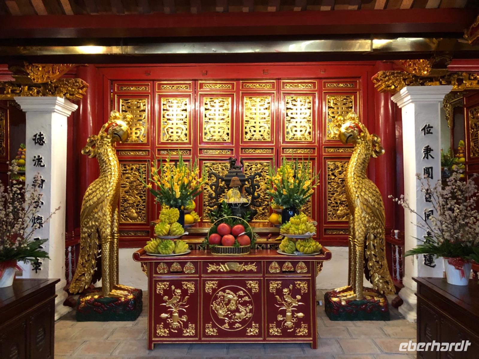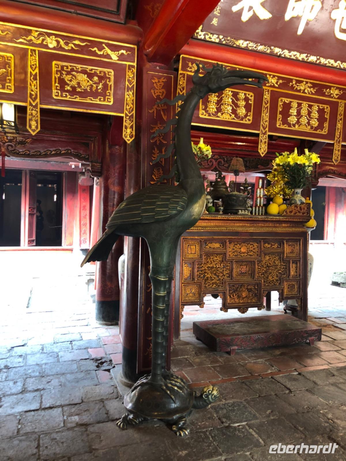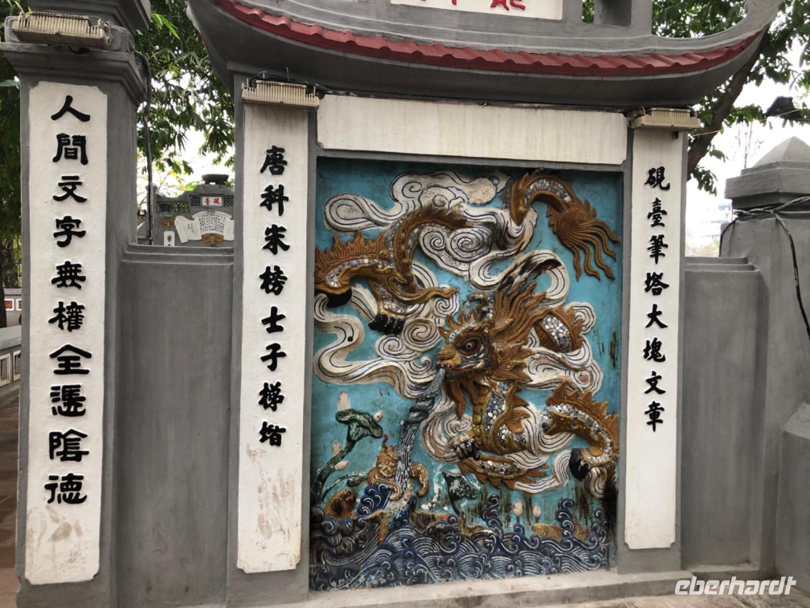 Bevor wir zum Literaturtempel fahren, besuchen wir die Ein-Säulen-Pagode, die ebenso wie der Schildkrötenturm im Hoan-Kiem-See als Wahrzeichen der Stadt gilt. Fast sieht sie aus wie das Hexenhaus im russischen Märchenfilm Abenteuer im Zauberwald, das auf einem Hühnerbein steht. Allerdings ist das „Hühnerbein" der Pagode einmal eine Säule aus Holz gewesen, die vor etlichen Jahren durch eine Betonsäule ersetzt wurde. Dadurch ist der ursprüngliche Charme dahin, nichtsdestotrotz pilgern Touristen aus aller Welt, so wie wir, dorthin - schauen, staunen, fotografieren und kaufen gegebenenfalls Souvenire.