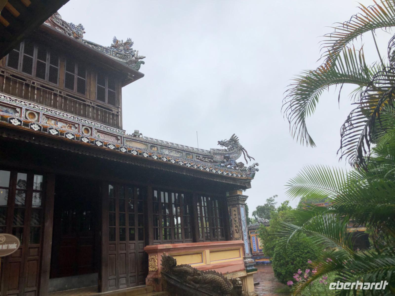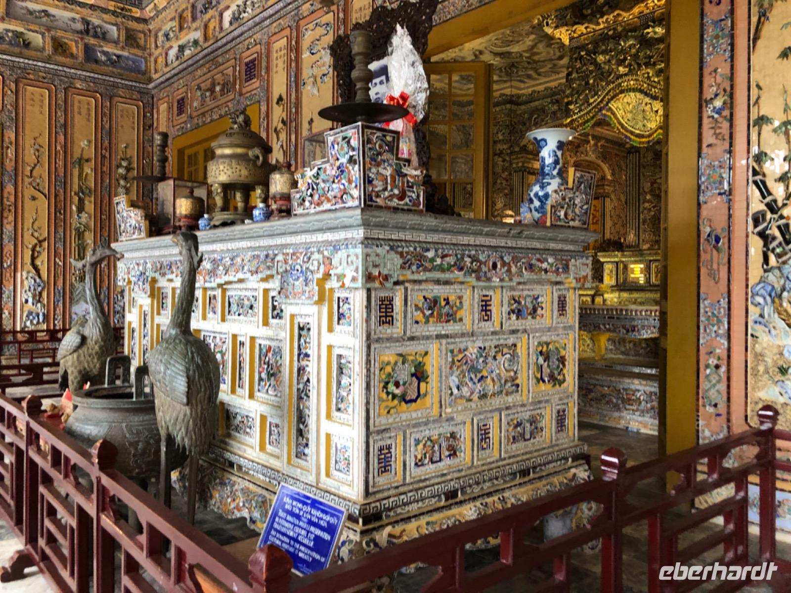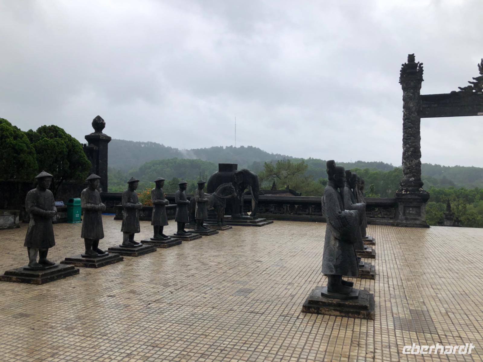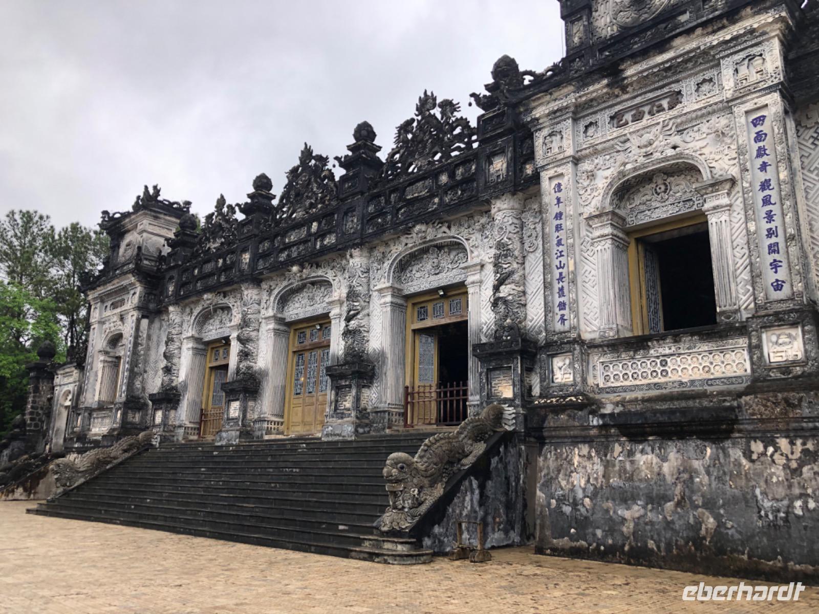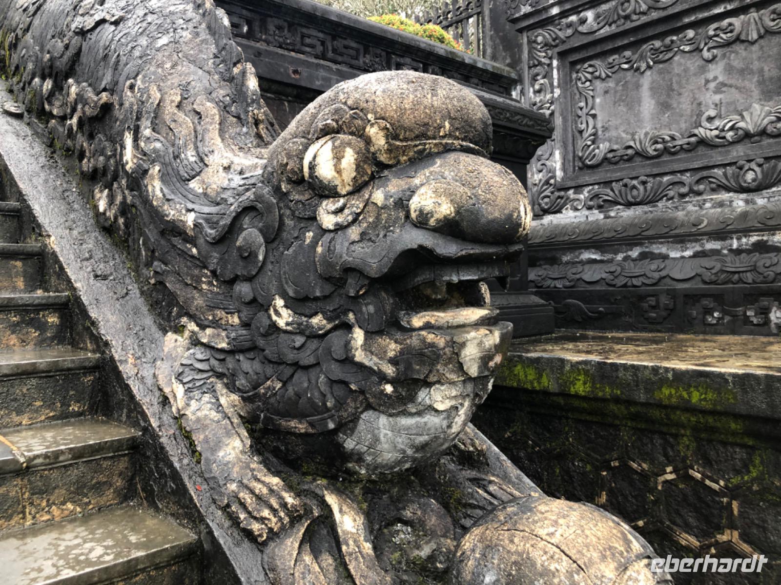 Auf uns wartet jetzt ein Drachenboot, mit dem wir über den Parfüm-Fluss fahren. Wir besuchen die beeindruckende Grabanlage von Khai Dinh. Im Ehrenhof stehen steinerne Soldaten, Pferde und Elefanten. In einem Pavillon befindet sich die größte Stele des Landes. Sie ist fast 20 Tonnen schwer und mit fast fünftausend Schriftzeichen bedeckt. Auf der Stele hat ein kinderloser Kaiser seine eigene Trauerrede hinterlassen. Nun steigen wir die breite steile Treppe hinauf, die an beiden Seiten von steinernen Drachen bewacht wird. Oben befindet sich die beeindruckende majestätische Grabanlage von Kaiser Khai Dinh. Sie besteht aus drei ineinander übergehende Räume, deren Wände mit bunten Glas- und Keramikscherben geschmückt sind. Es wirkt wie ein überdimensional geratenes Schmuckkästchen.