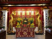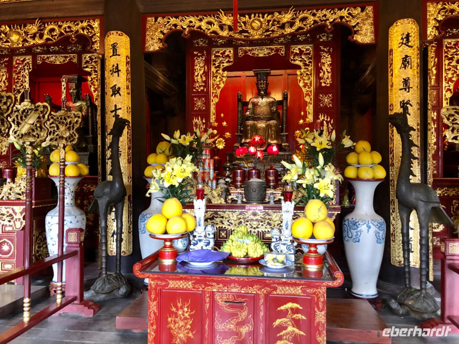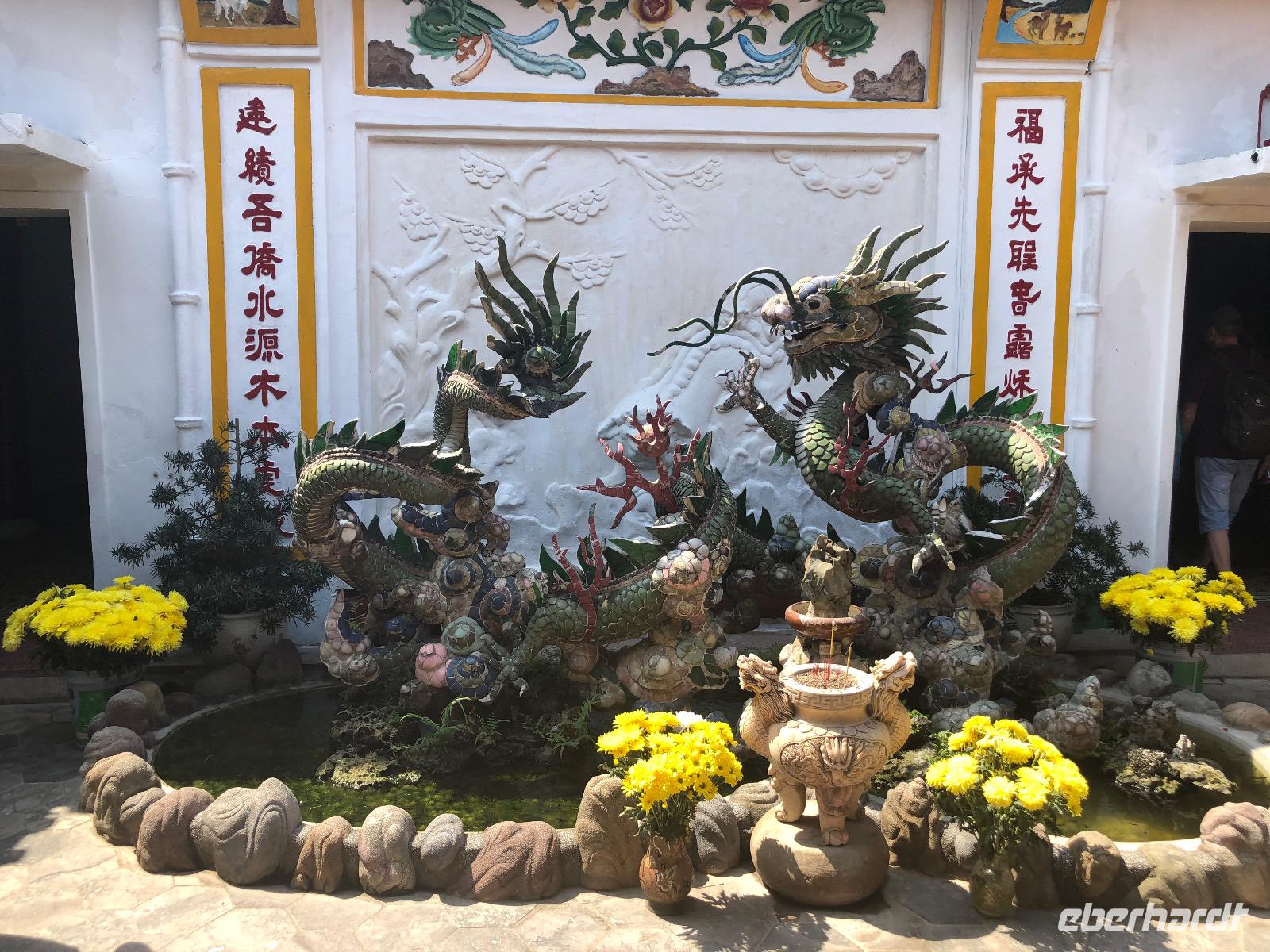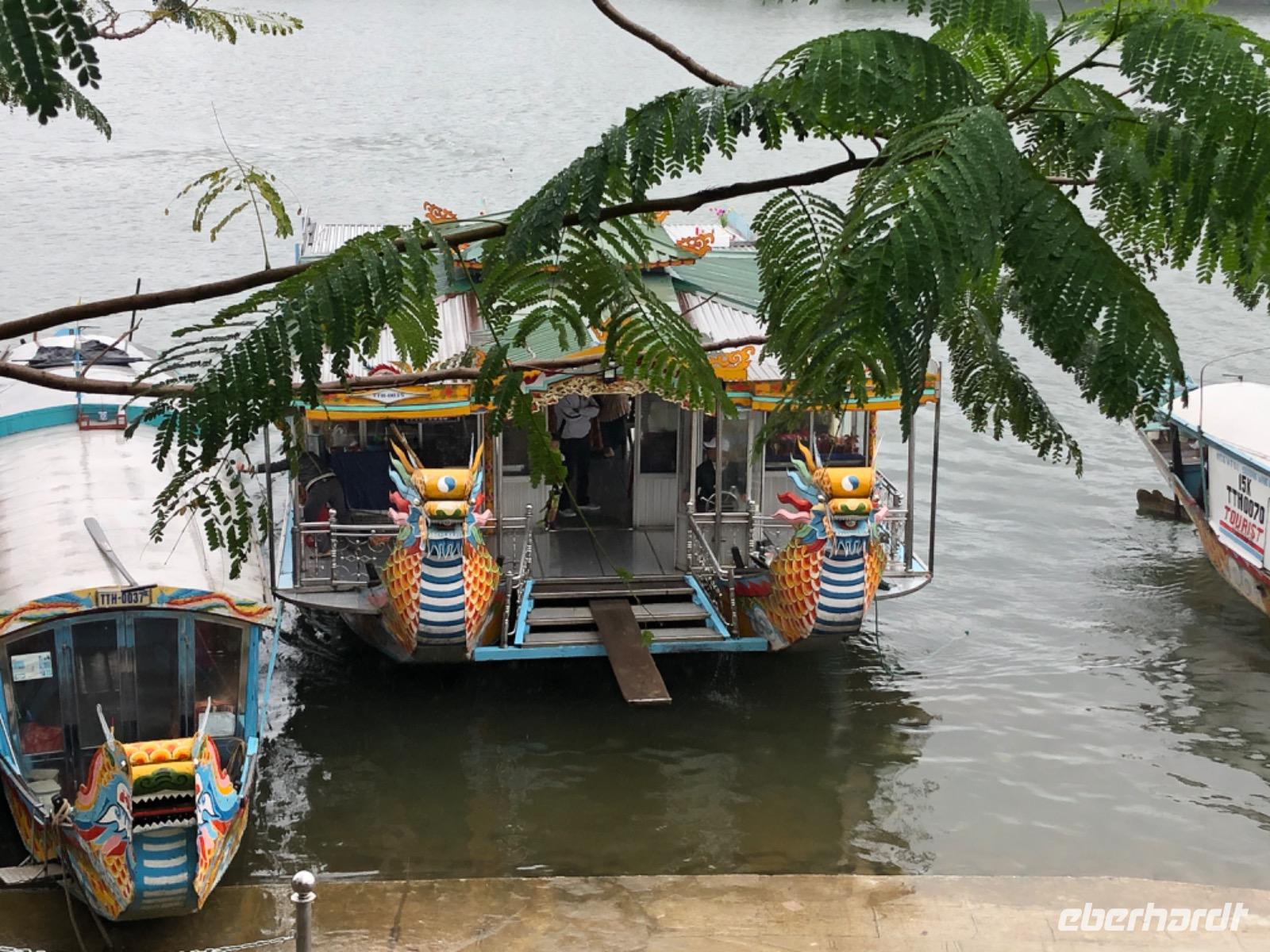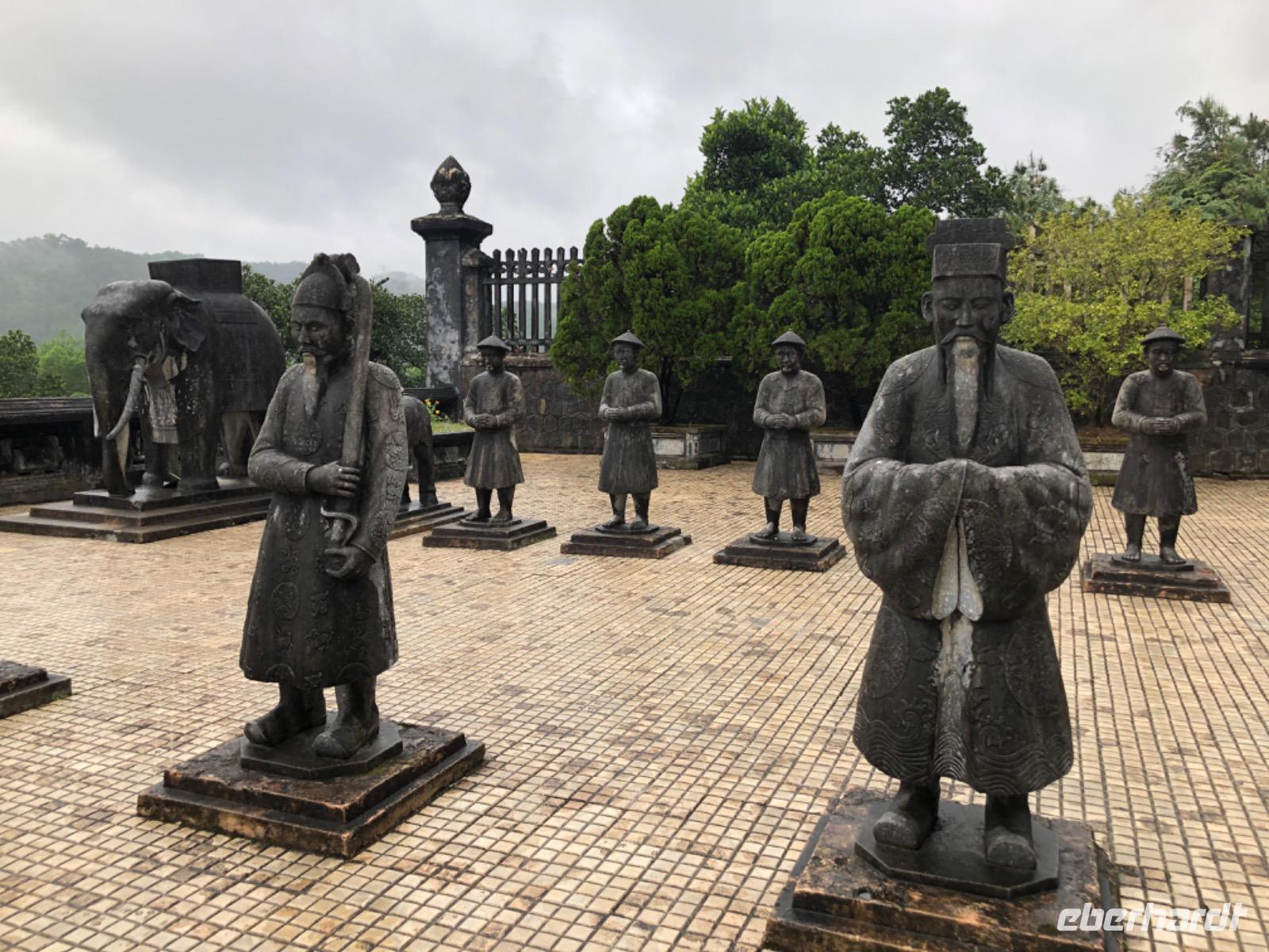 Auf uns wartet jetzt ein Drachenboot, mit dem wir über den Parfüm-Fluss fahren. Wir besuchen die beeindruckende Grabanlage von Khai Dinh. Im Ehrenhof stehen steinerne Soldaten, Pferde und Elefanten. In einem Pavillon befindet sich die größte Stele des Landes. Sie ist fast 20 Tonnen schwer und mit fast fünftausend Schriftzeichen bedeckt. Auf der Stele hat ein kinderloser Kaiser seine eigene Trauerrede hinterlassen. Nun steigen wir die breite steile Treppe hinauf, die an beiden Seiten von steinernen Drachen bewacht wird. Oben befindet sich die beeindruckende majestätische Grabanlage von Kaiser Khai Dinh. Sie besteht aus drei ineinander übergehende Räume, deren Wände mit bunten Glas- und Keramikscherben geschmückt sind. Es wirkt wie ein überdimensional geratenes Schmuckkästchen.