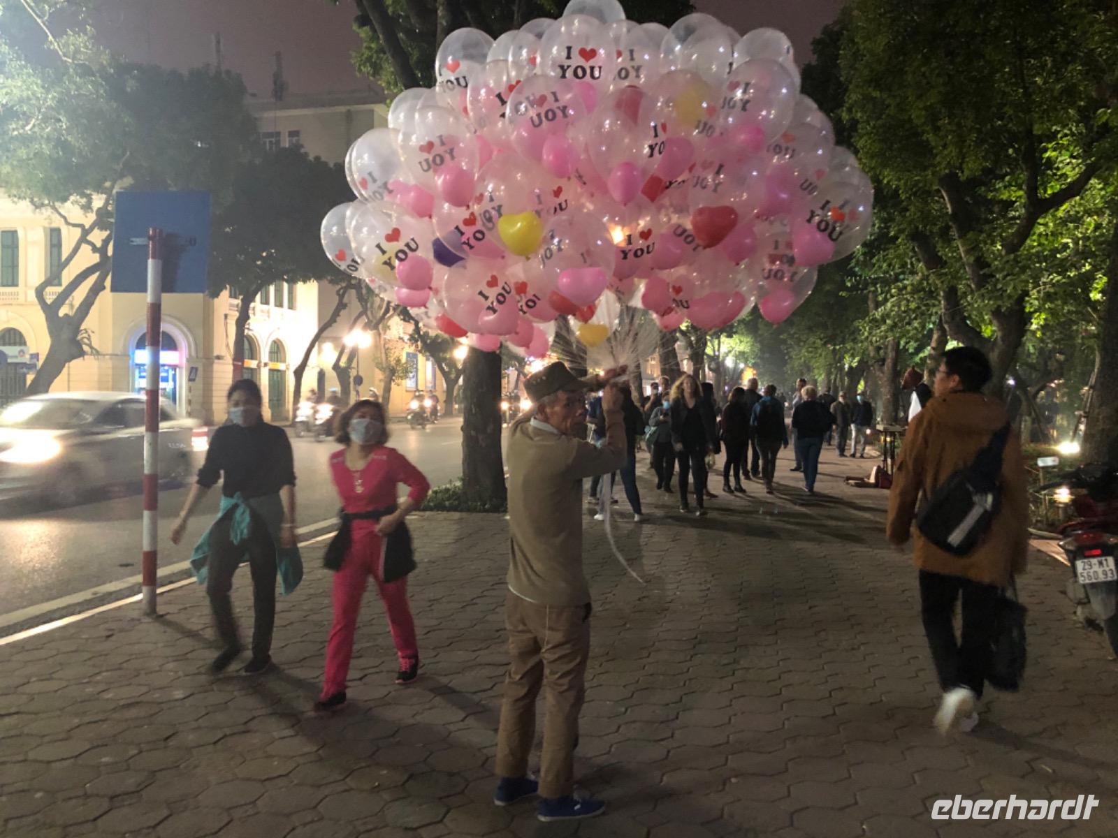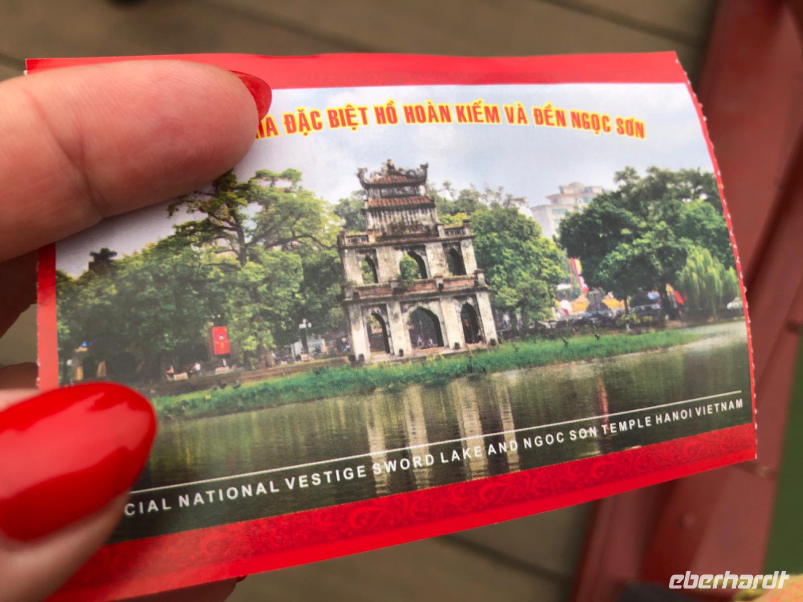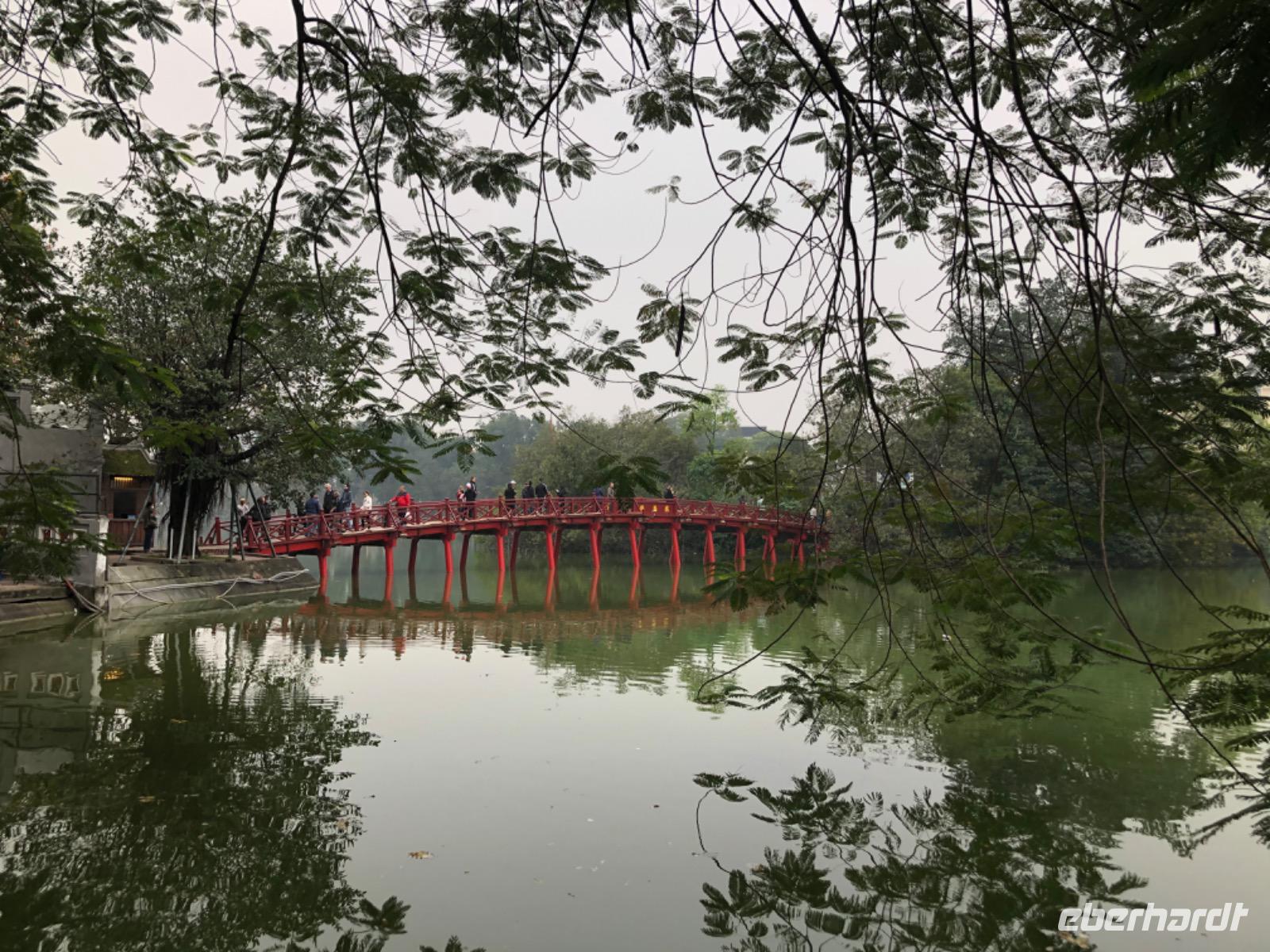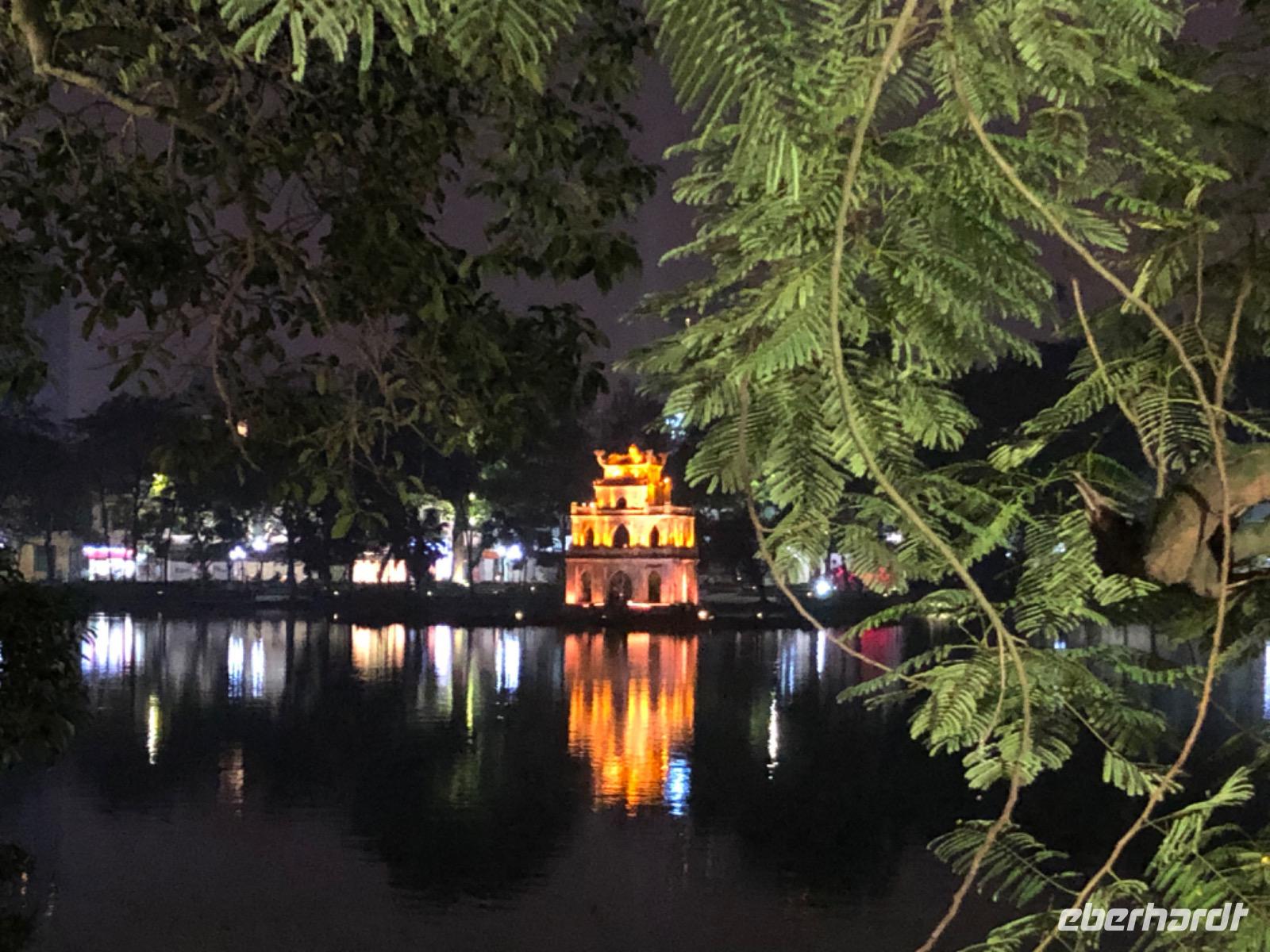 Bis 16 Uhr gönnt uns Diep eine Pause, dann treffen wir uns in der Lobby. Wir spazieren zum Hoan-Kiem-See, schreiten über die The Huc Brücke und besuchen den Jadeberg Tempel. Der Hoan-Kiem-See und sein Ufer sind bei jungen und alten Hanoi Bewohnern sehr beliebt. Zum Einen können sie den See innerhalb von einer Stunde umrunden, zum Anderen dient er als beliebter Treffpunkt für Tai Chi Übende, Schachspieler und abends auch für gemeinschaftliches Tanzen. In der Mitte des Sees befindet sich eine Insel mit einem Pavillon, der Schildkrötenturm genannt wird. Der Name entspringt einer Legende, nach der ein vietnamesischer Nationalheld beim Fischen ein Schwert gefunden haben soll, mit dem er die Feinde des Landes erfolgreich schlagen konnte. Als er das Schwert zurück bringen wollte, flog es geradewegs in das Maul einer goldenen Schildkröte. In einem Ausstellungsraum können wir sogar zwei Exemplare von etwa hundert Jahre alten Schildkröten betrachten, die (angeblich) in dem See gefunden wurden. Glaub's oder glaub es nicht, Nessi lässt grüßen. Anschließend stiefeln wir noch ein bisschen durch die Altstadt und lassen das Gewusel und Gewimmel auf uns wirken. Die Geschäfte quellen über mit einem Angebot an Waren, wie man es sich kaum vorstellen kann. Am Abend unternehmen wir eine abenteuerliche Rikschafahrt. Hier heißt es, Augen zu und durch bzw. vertraue dem Fahrer, der in aller Seelenruhe entgegen der Fahrtrichtung mitten im dichtesten Verkehr mit uns über die Straßen gondelt. Aber, nichts passiert, alle kommen gesund und munter am Restaurant an, wo Diep bereits auf uns wartet. Wir verabschieden uns von unseren Fahrern, die sich überraschend auffällig über unser Trinkgeld freuen.