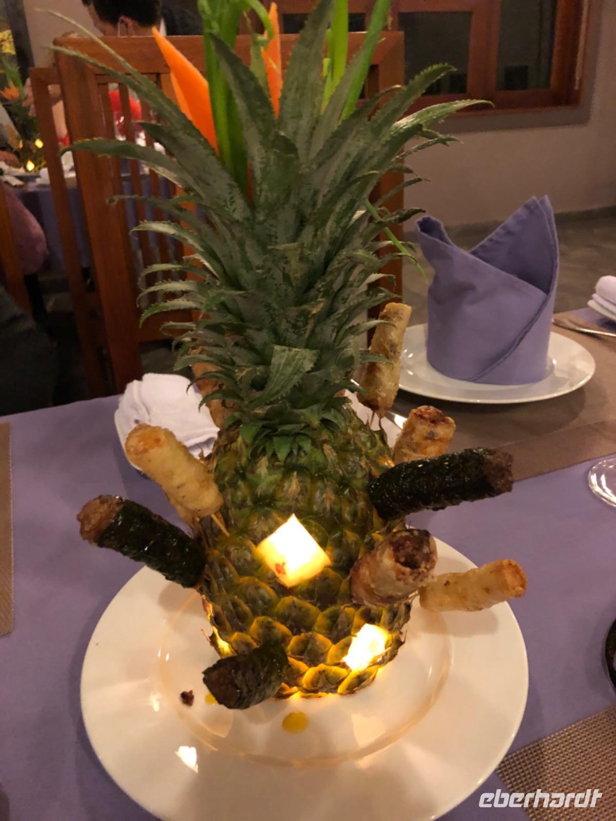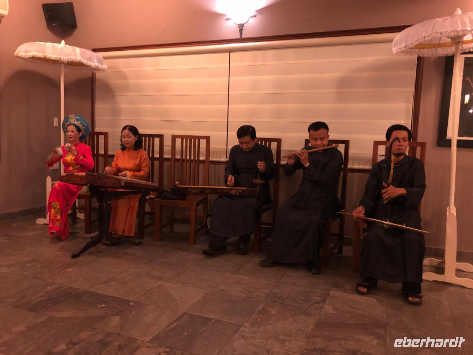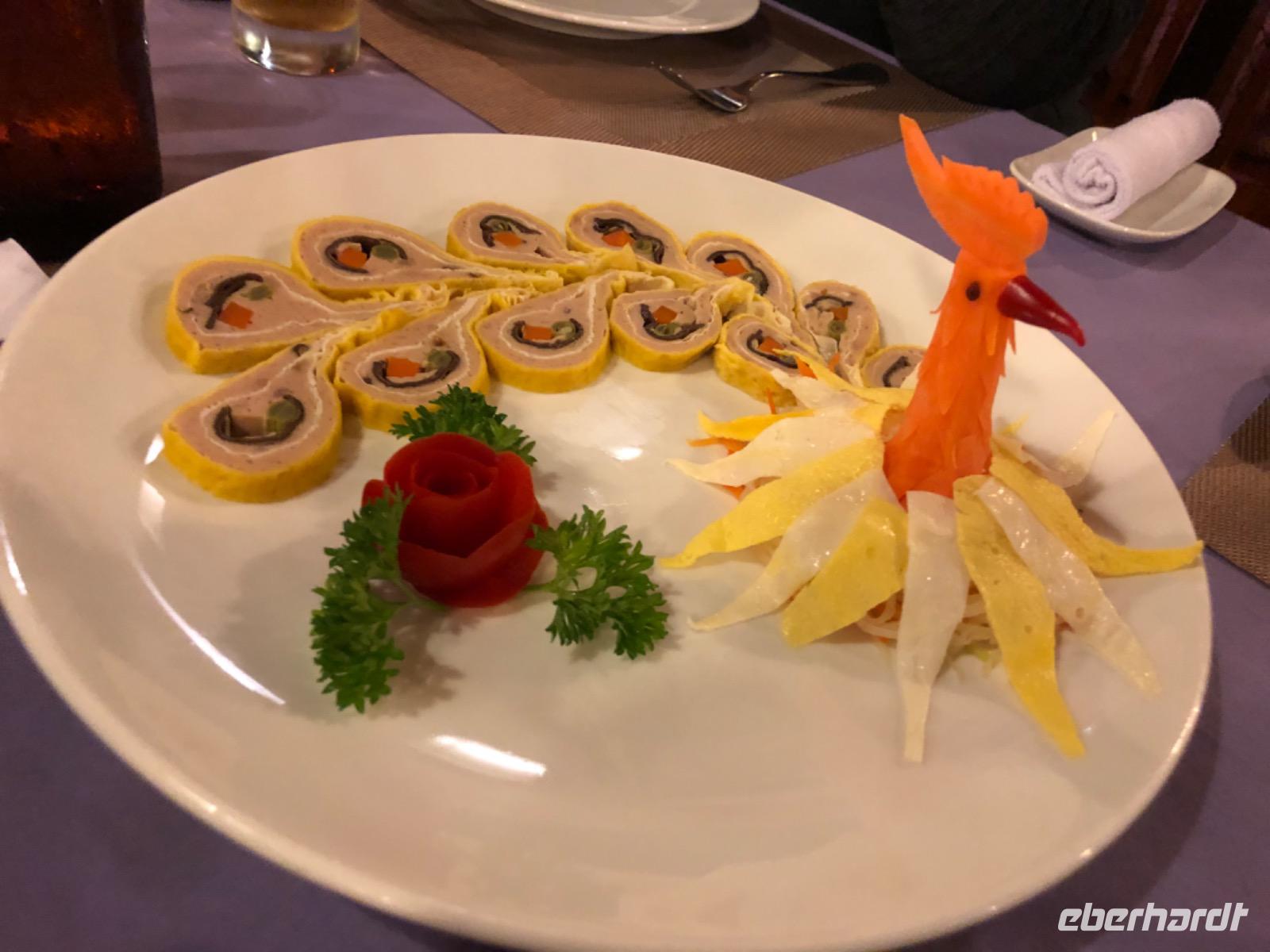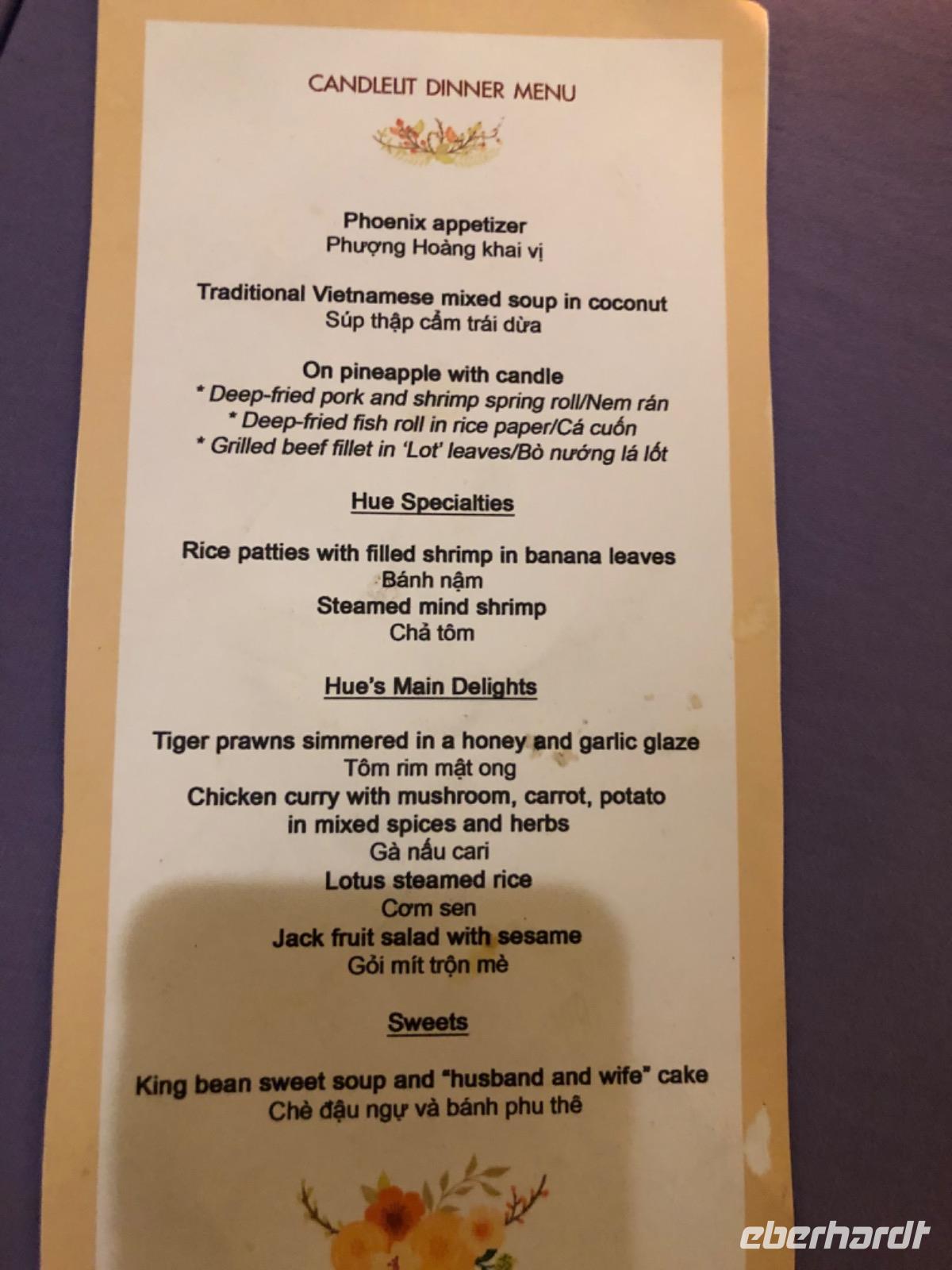 Am ersten Abend essen wir in einem kleinen familiengeführten Straßenrestaurant - gegenüber vom Hotel, am nächsten Abend zaubern die Köche des Hotels kulinarische Gaumenfreuden ganz besonderer Art. Auf dem Programm steht ein kaiserliches Menü. Die vietnamesische Gemüsesuppe wird in einer Kokosnuss serviert, Fleisch- und Garnelenspieße stecken in einer ausgehöhlten Ananas, die von Innen mit einer Kerze beleuchtet wird. Bereits zubereitetes Fischfilet wird, verpackt in Palmenblättern, ergänzt mit einer Kreation aus Reis und Shrimps. Unbekannte Kräuter und Gewürze führen zu einer Geschmacksexplosion oder auch dazu, auf das Eine oder andere zu verzichten, da es dem europäischen Auge und Magen zu exotisch bzw. fremd erscheint.