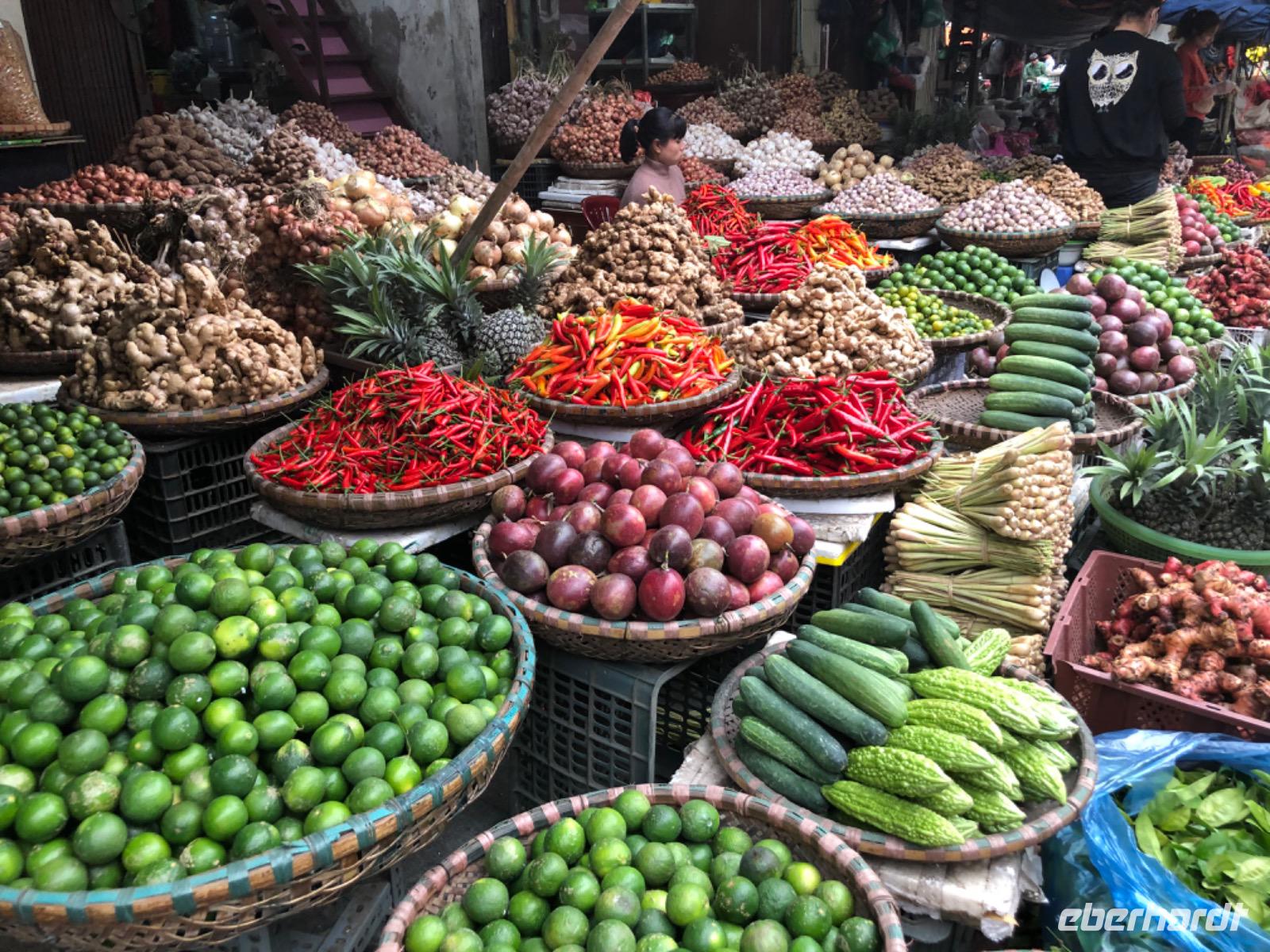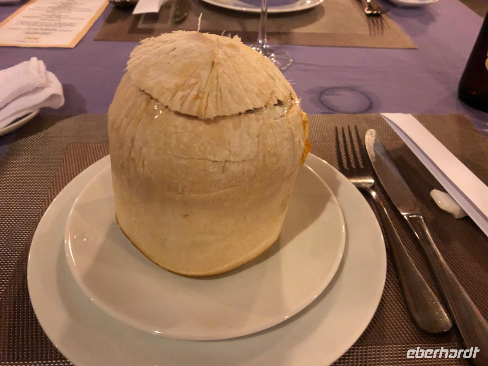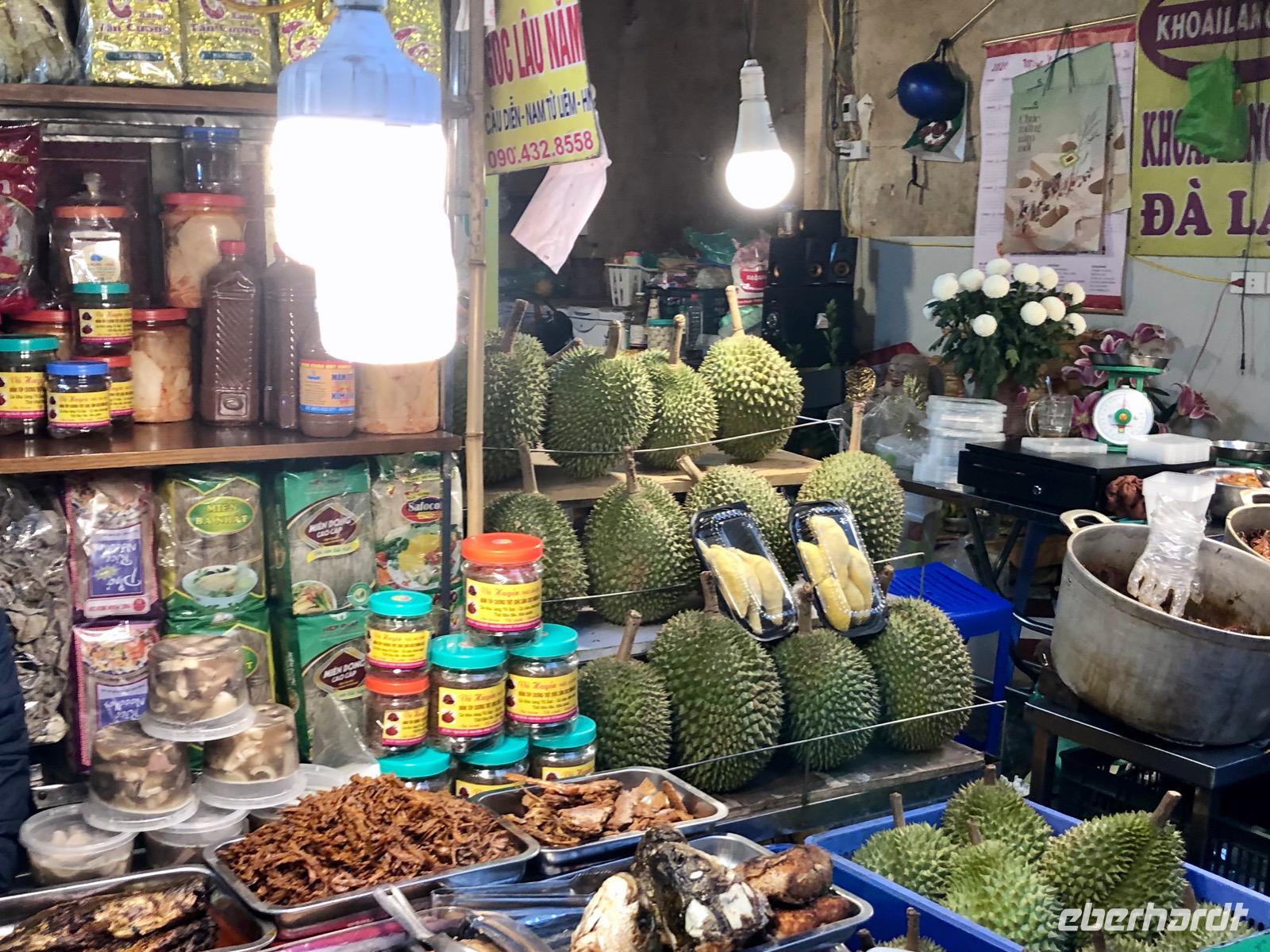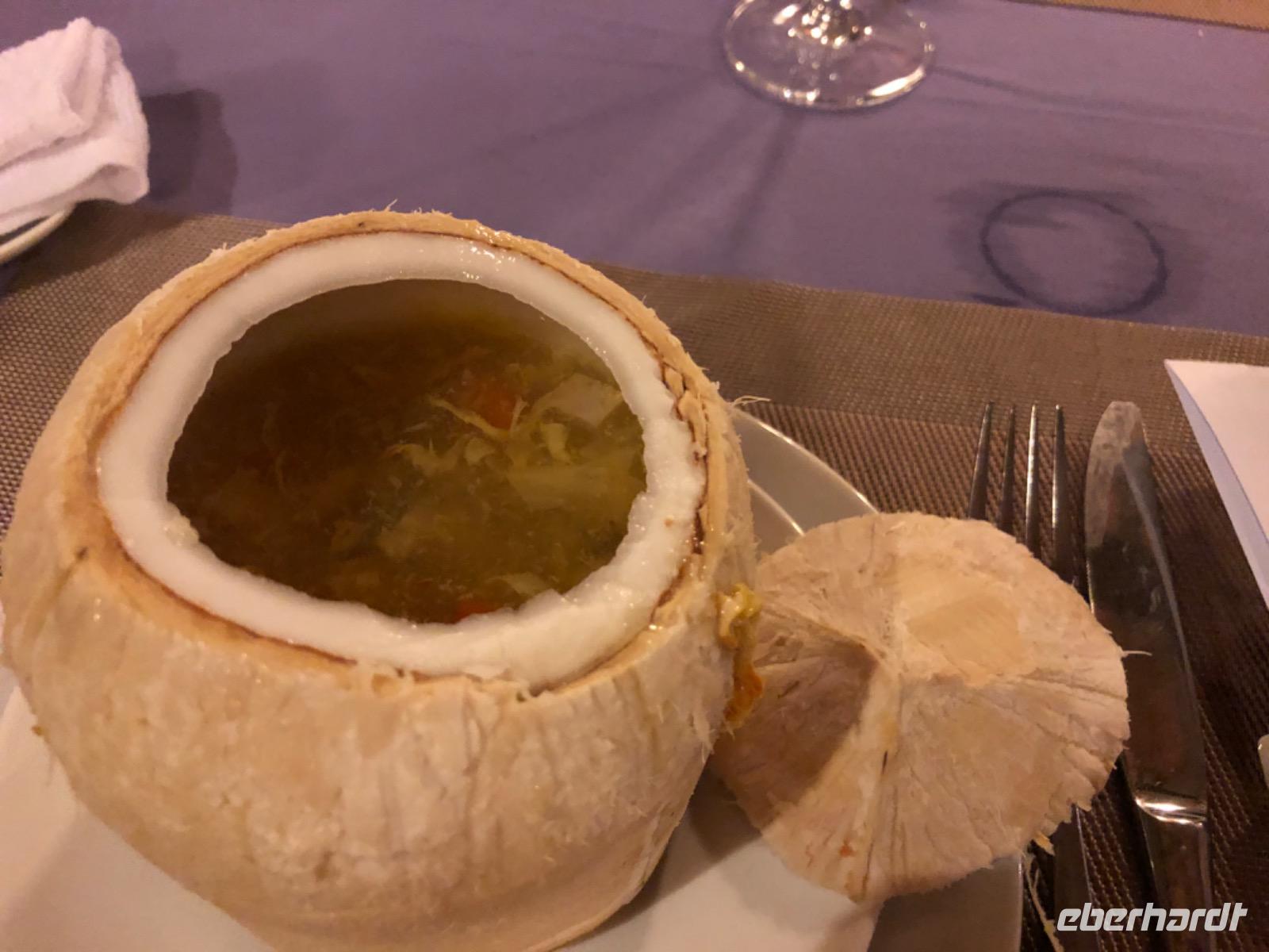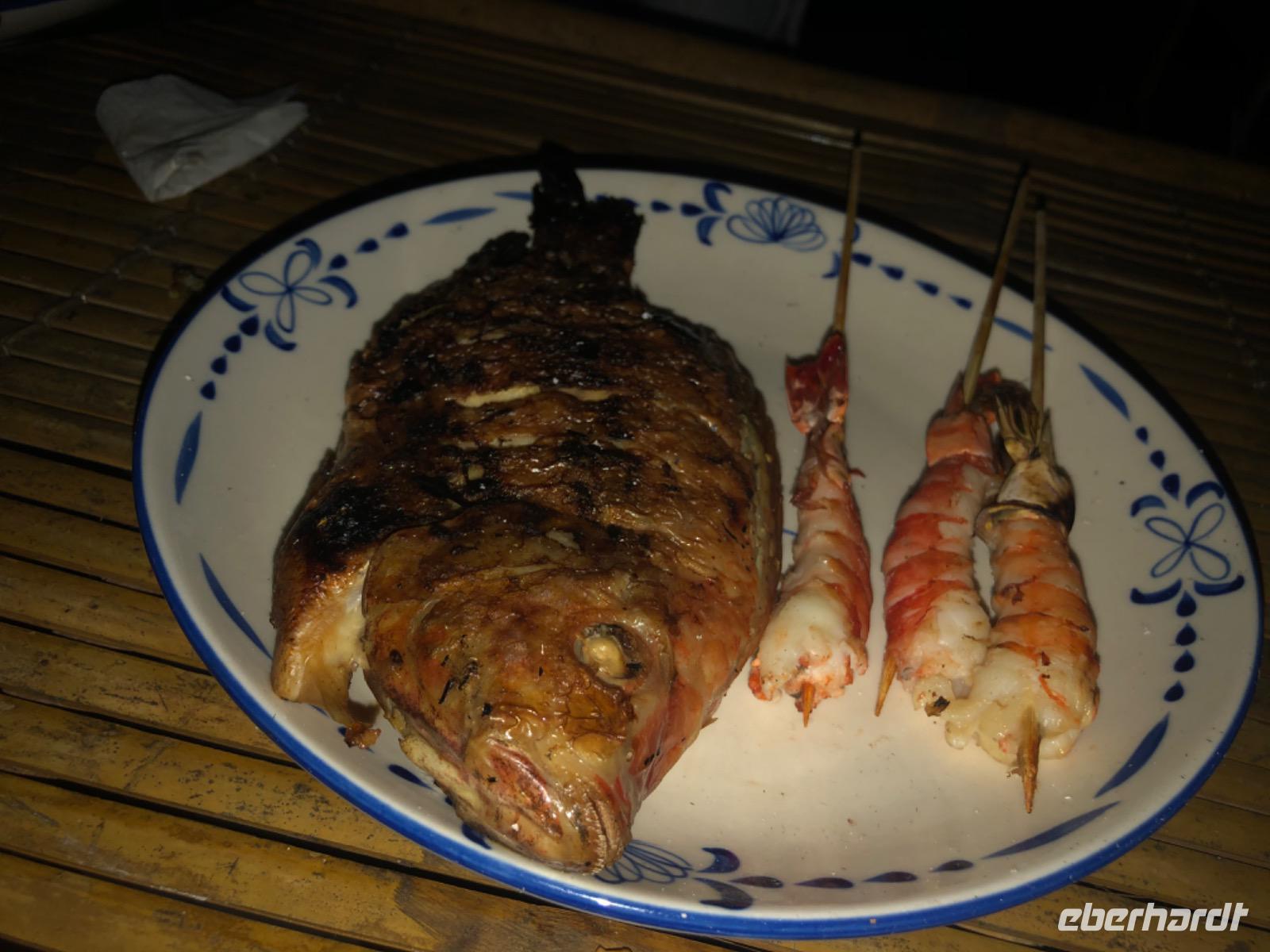 Am ersten Abend essen wir in einem kleinen familiengeführten Straßenrestaurant - gegenüber vom Hotel, am nächsten Abend zaubern die Köche des Hotels kulinarische Gaumenfreuden ganz besonderer Art. Auf dem Programm steht ein kaiserliches Menü. Die vietnamesische Gemüsesuppe wird in einer Kokosnuss serviert, Fleisch- und Garnelenspieße stecken in einer ausgehöhlten Ananas, die von Innen mit einer Kerze beleuchtet wird. Bereits zubereitetes Fischfilet wird, verpackt in Palmenblättern, ergänzt mit einer Kreation aus Reis und Shrimps. Unbekannte Kräuter und Gewürze führen zu einer Geschmacksexplosion oder auch dazu, auf das Eine oder andere zu verzichten, da es dem europäischen Auge und Magen zu exotisch bzw. fremd erscheint.