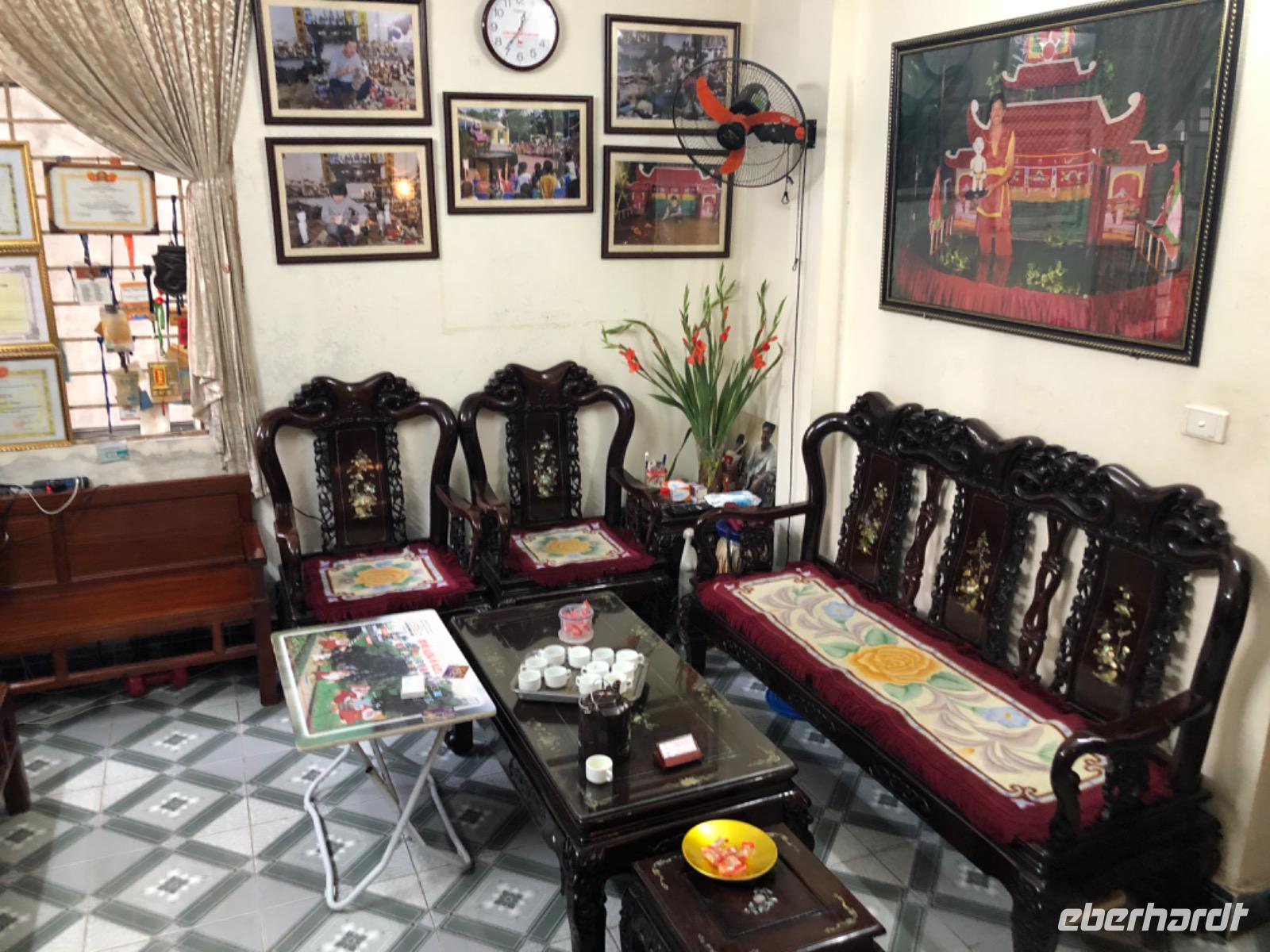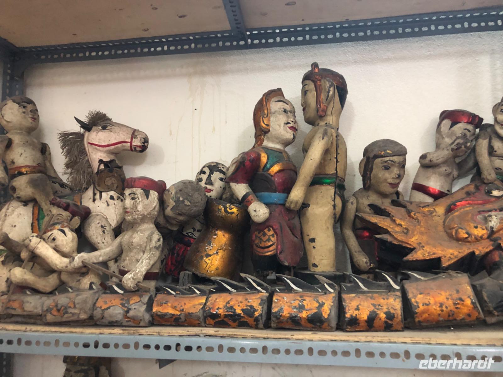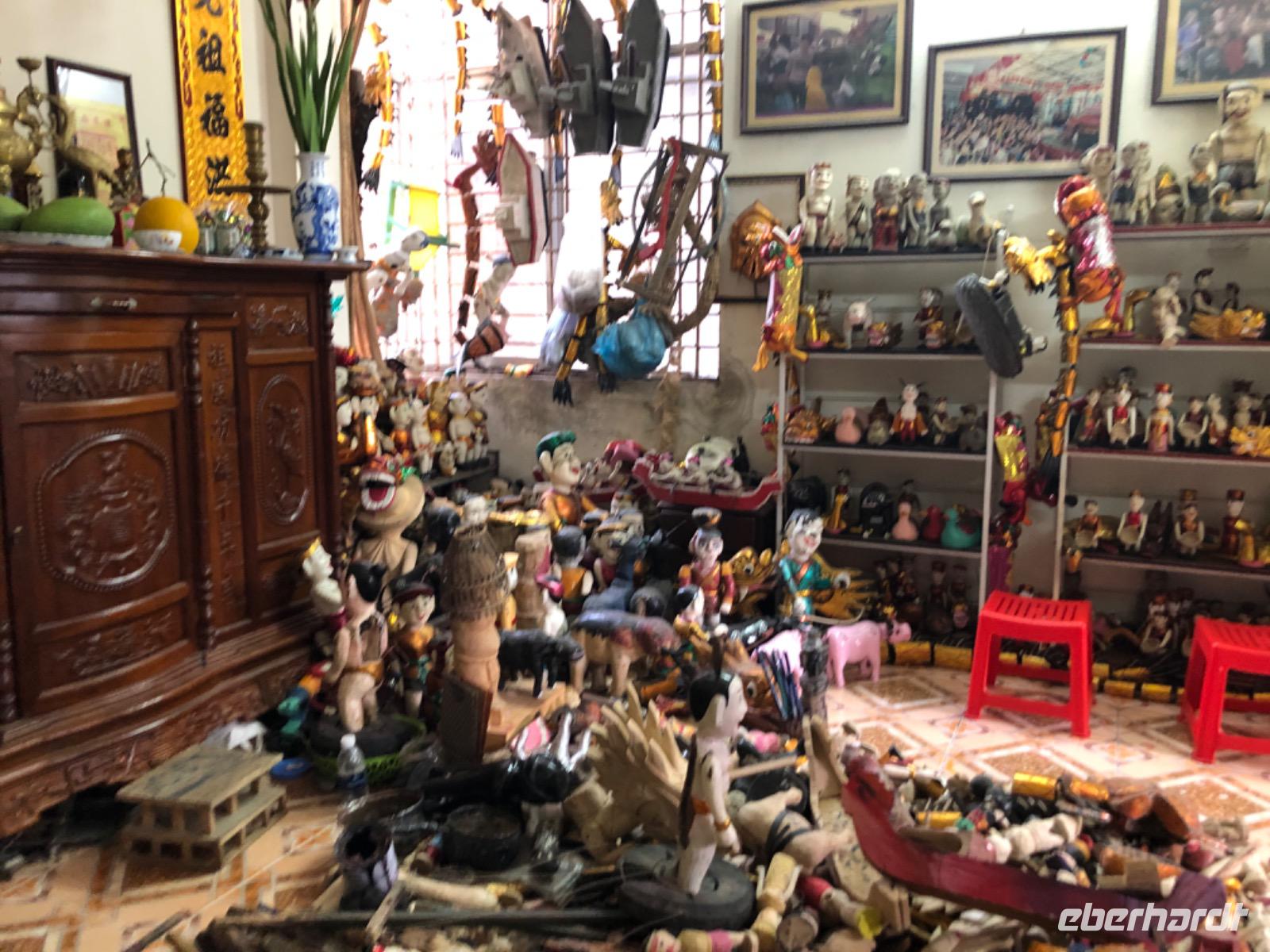 Heute erleben wir etwas ganz Besonderes. In unserem Programm der Eberhardt TRAVEL Petit-Reise ist der Besuch des Wasserpuppentheaters vorgesehen. Außerdem wollen wir einen Blick hinter die Kulissen werfen und das kann niemand, außer uns. Den Plan vor Ort umzusetzen, stellt sich jedoch als kompliziert heraus, da das offizielle Wasserpuppentheater, das alle Touristen in Hanoi besuchen, zwischen den drei Vorstellungen am Tag nur zehn Minuten Pause hat und nach der letzten Vorstellung in unserem Zeitplan wiederum bereits das Abendessen vorgesehen ist. Unsere Diep hat jedoch einen Alternativvorschlag in Petto. Sie kennt eine Familie, die in achter Generation ein Wasserpuppentheater betreibt. Durch enge Gassen gelangen wir zumindest in die Nähe des Wohnhauses der Puppenspielerfamilie. Dann müssen wir abgeholt werden. Nicht einmal die Einheimischen finden sich in dem Gewirr der Hinterhofgassen zurecht. Im Wohnhaus der Familie werden wir freundlich mit Tee und Knabberzeug empfangen. Der Herr des Hauses begrüßt uns und stellt uns die Entwicklung seiner Familie vor. Dann steigen wir die schmale Treppe bis in den fünften Stock hinauf. Hier ist tatsächlich ein kleines Wasserpuppentheater aufgebaut. In mehreren Ministücken erleben wir, wie die hölzernen Wasserpuppen tanzen oder miteinander in den Wettbewerb treten. Anschließend hebt sich der Vorhang und wir dürfen selbst Hand anlegen. Die Puppen sind ziemlich schwer und es ist gar nicht so einfach, sie zum Leben zu erwecken. Puppenspieler waren heute die Frau des Hauses und ein Neffe. Tatsächlich beteiligt ist jedoch die ganze Familie. Im anschließenden Gespräch erzählt uns der Puppenschnitzer, dass die junge Generation nicht mehr so interessiert ist, die Tradition fortzusetzen. Jede Puppe ist handgeschnitzt und mehrfach mit Farben und Lacken überzogen. Und, so wie die Puppen während der Vorstellung behandelt wurden, also gegeneinander stießen, dass es krachte, benötigen die bestimmt oft eine Reparatur, wenn nicht sogar Restauration. Wir verabschieden uns von der Familie und freuen uns, dass wir, entgegen dem Mainsteam der Touristen, einen Einblick in das Leben einer Puppenspielerfamilie nehmen durften.