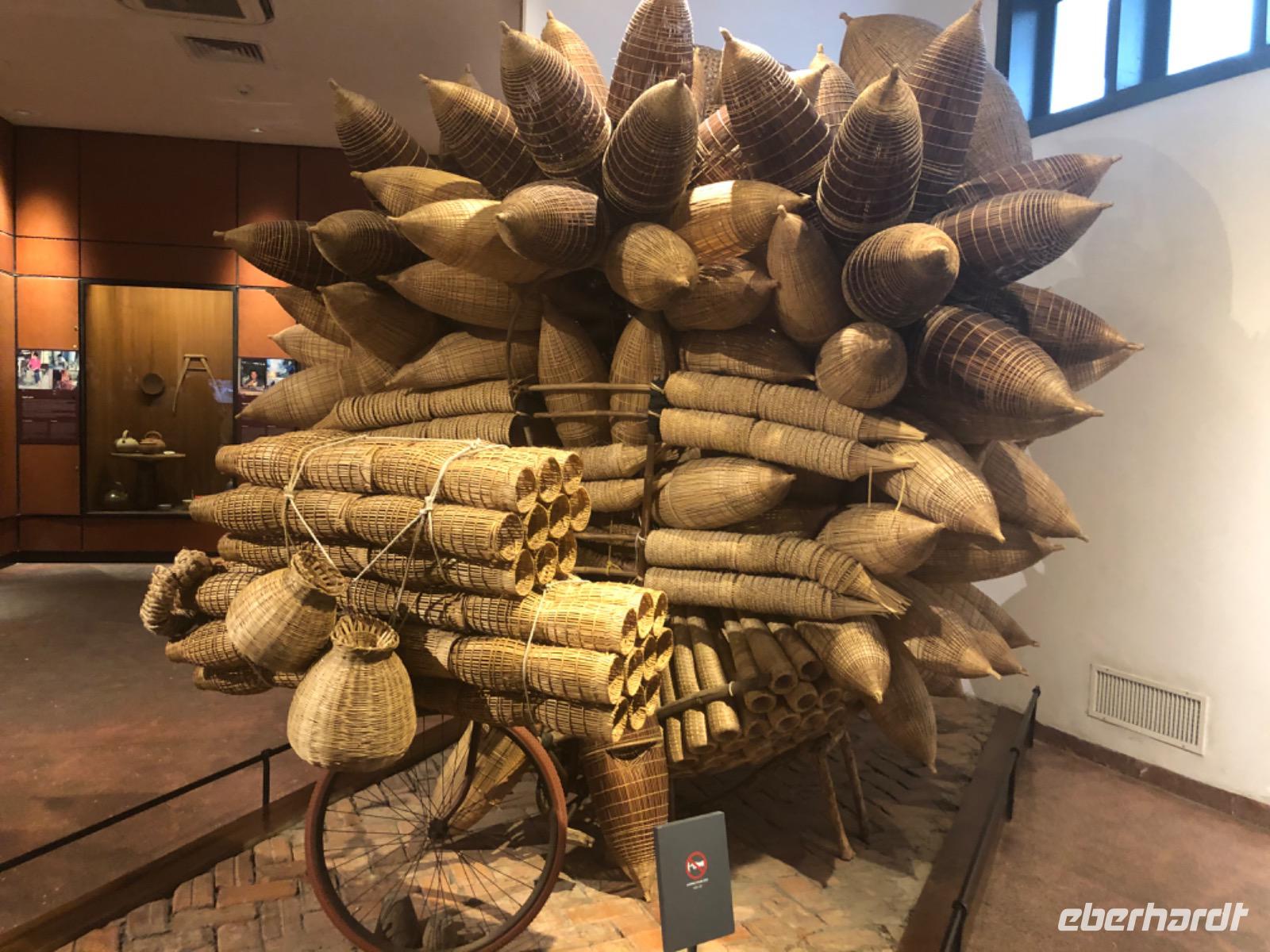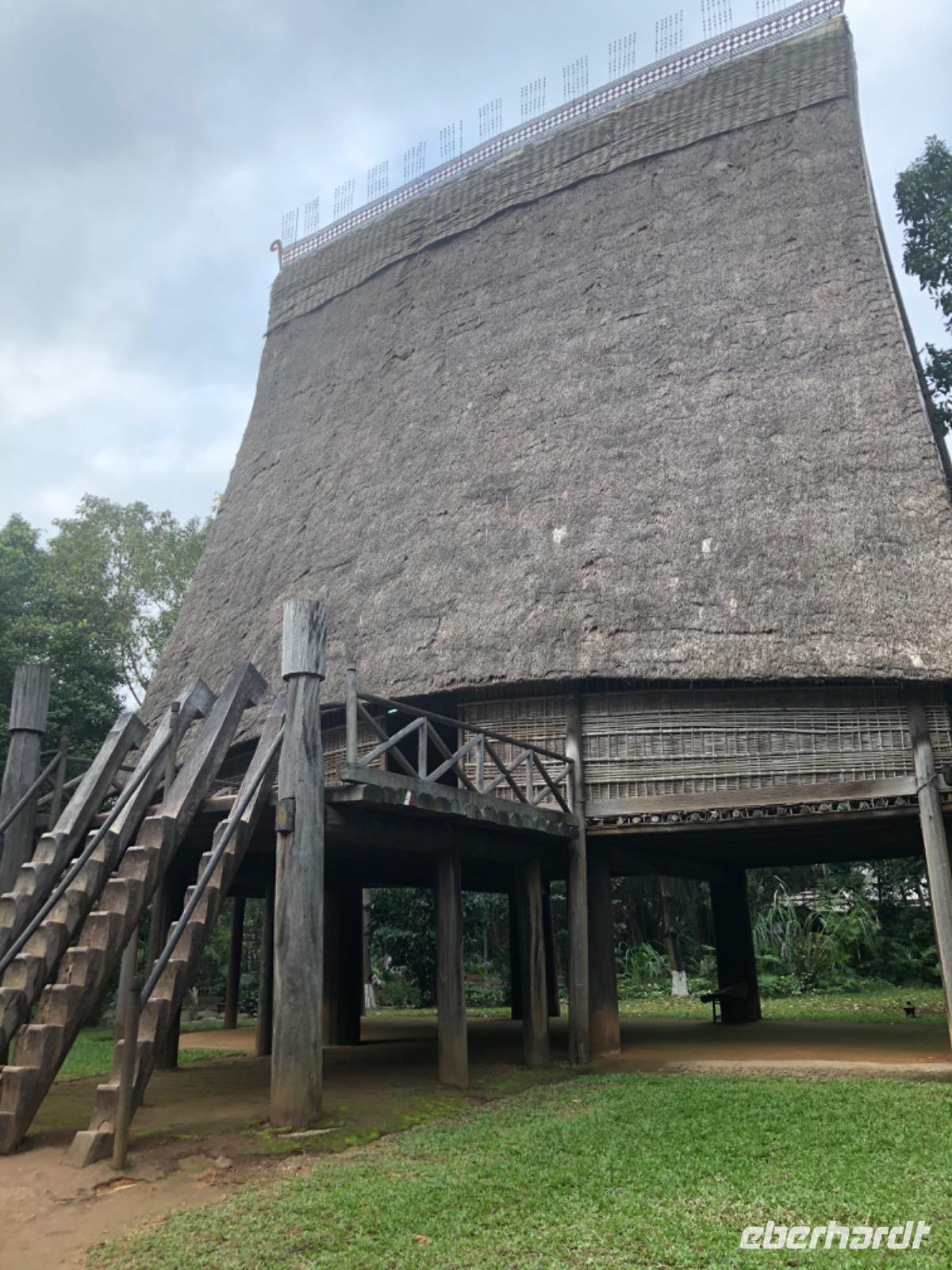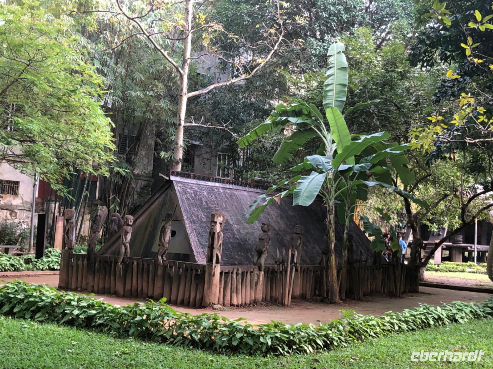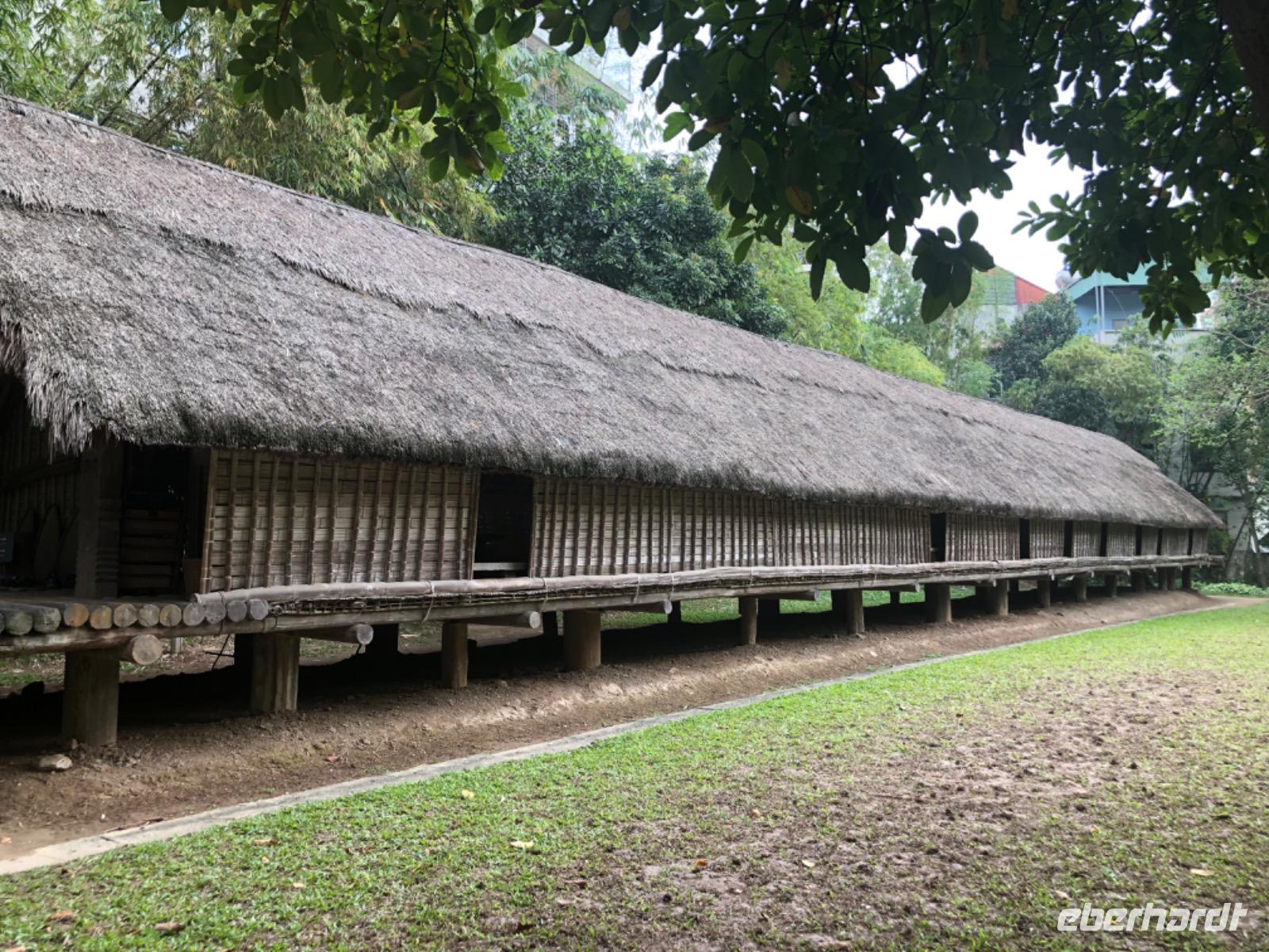 Im Ethnologischen Museum, das wir als nächstes besuchen, kehren wir zunächst in das am Eingang befindliche Café ein, um einen Kleinigkeit zum Mittagessen zu verzehren. Hier lernen wir die Tücken der Verständigung kennen, denn trotz bebilderter Menükarte bekommt nicht jeder das, was er bestellt hat. Dennoch ist das Essen schmackhaft und die Portionen größer als erwartet. Im Museum zeigt uns Diep eine Landkarte, auf der die vielen Sprachen der in Vietnam lebenden Ethnien gekennzeichnet sind. Es gibt 54 Völkergruppen und alle haben unterschiedliche Herkunft, Kultur, Sprache und Religion. Diep erzählt, dass es verschiedene Einflüsse in der Geschichte des Landes gegeben hat, die auch zu der Entwicklung der unterschiedlichen Sprachen führte. So gibt es im Norden vor allem chinesisch und im Westen laotisch geprägte Dialekte und in den Bergregionen diverse eigene Sprachen.