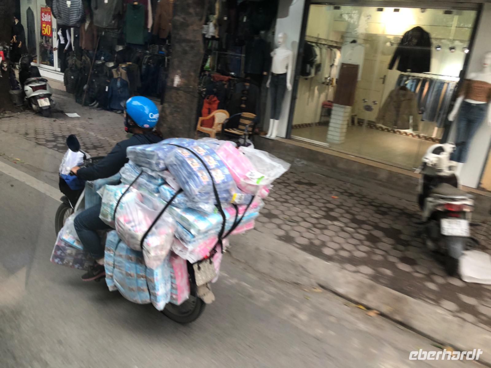 Noch einmal knapp eineinhalb Stunden und wir landen in Hanoi. Erstaunlicherweise sind alle Koffer angekommen und am Ausgang wartet Diep auf uns, unsere vietnamesiche Reiseleiterin, die uns in den nächsten Tagen in Nordvietnam betreuen wird. Unser Fahrer versucht mit großem Engagement und mit roher Gewalt, unser Gepäck in den Minikofferraum zu quetschen. Trotzdem passen nicht alle Koffer rein. Macht nichts, vorne ist auch noch Platz.