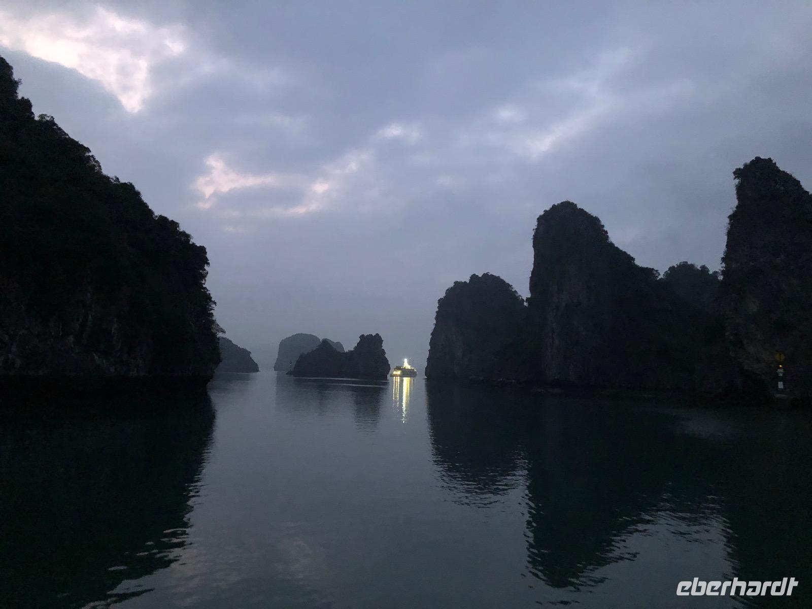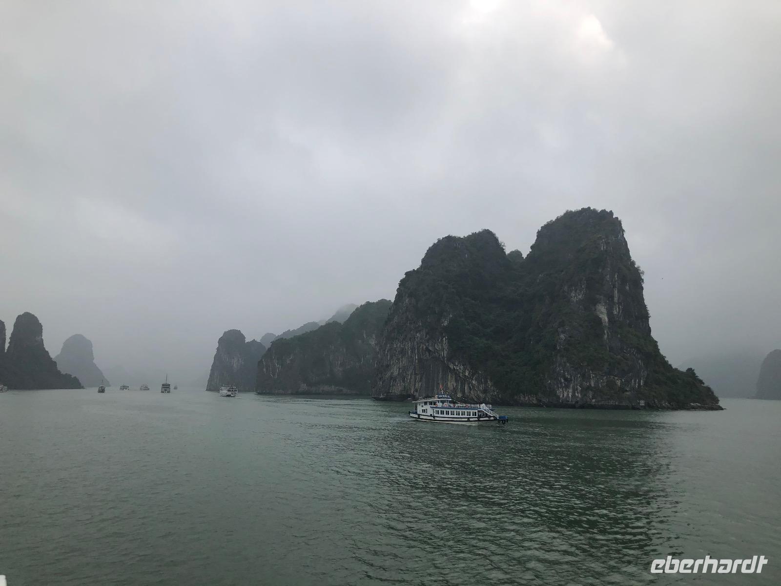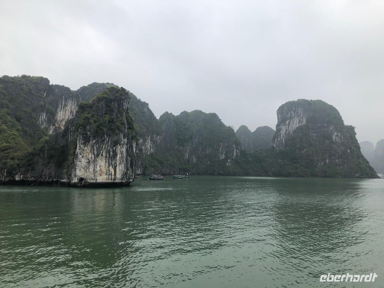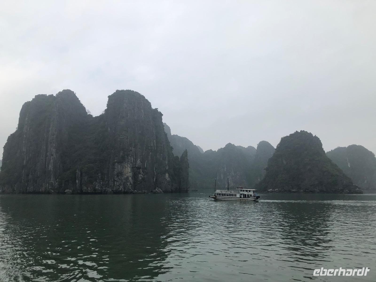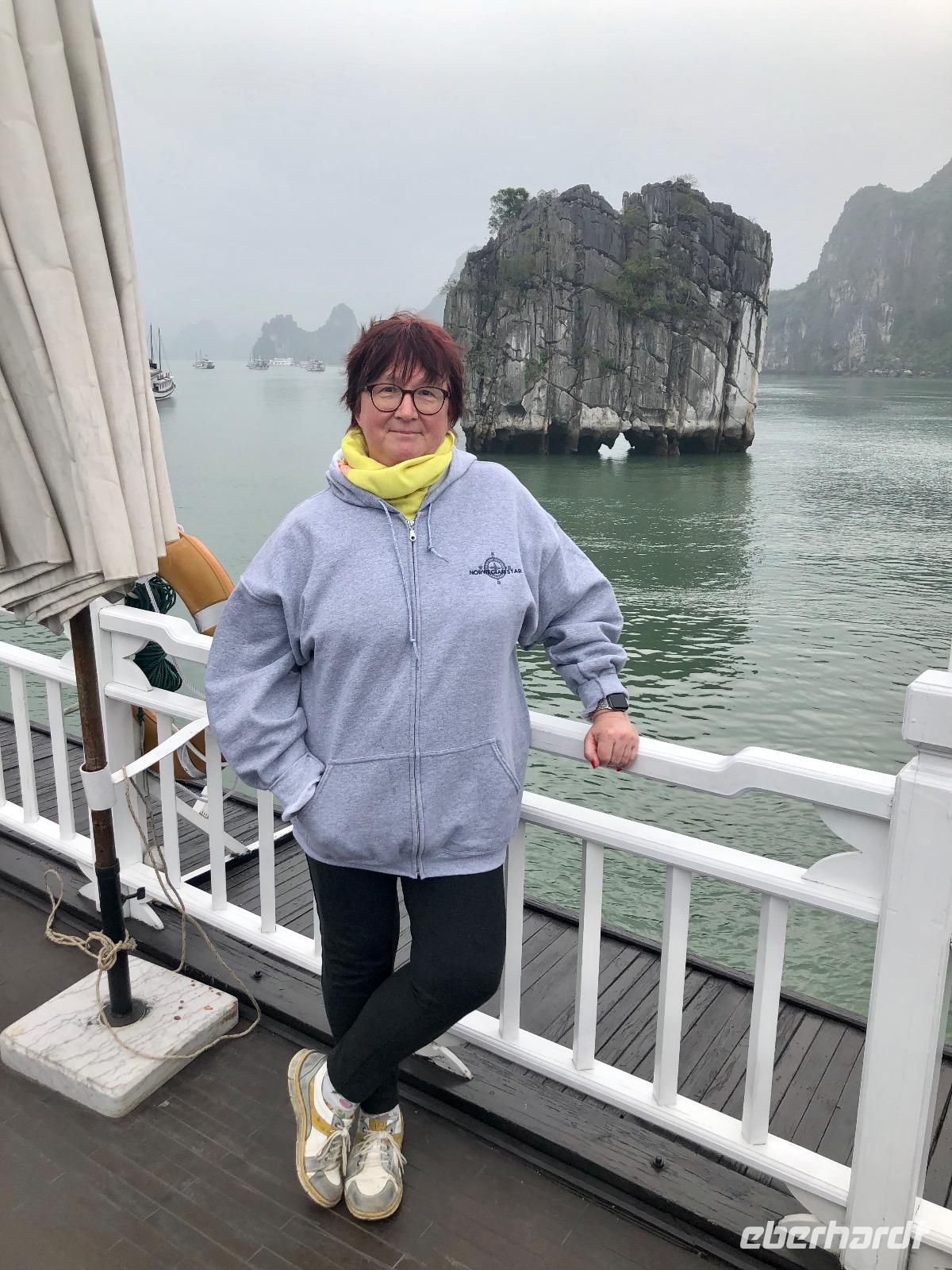 Nun begrüßt uns der Cruise-Manager und begleitet uns auf die Dschunke. Diese hat unsere Eberhardt TRAVEL Petit Gruppe ganz für sich allein. Kaum haben wir unsere Kabinen bezogen, fährt die Dschunke auch schon los. Wir treffen uns an Deck und lassen die traumhafte Kulisse der Halong-Bucht an uns vorbei gleiten. Ha Long bedeutet so viel wie herab steigender Drache und in allen Sagen, die die Entstehung der Bucht beschreiben, spielen Drachen die Hauptrolle. Jetzt wissen wir auch, warum. Die runden Felskuppelchen, die aus dem Wasser ragen, sehen tatsächlich aus, wie der Rücken eines untergegangenen Drachens. Dazu kommen die Nebelschwaden, die über der Bucht liegen und ein mystisches Ambiente zaubern. Ach, ist das schön. Einmal tief durchatmen und glücklich sein.