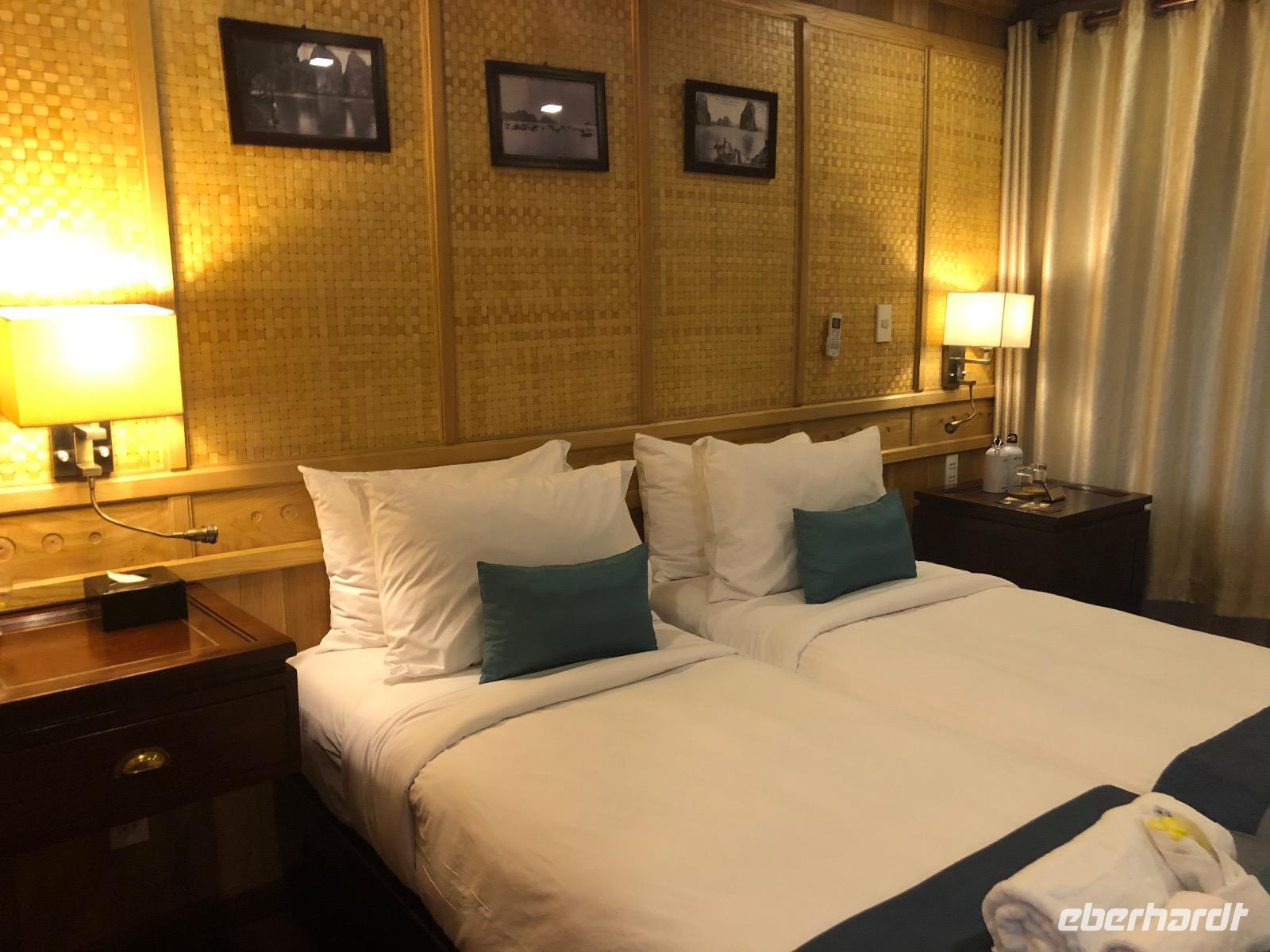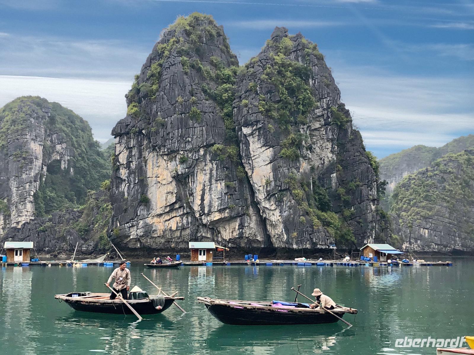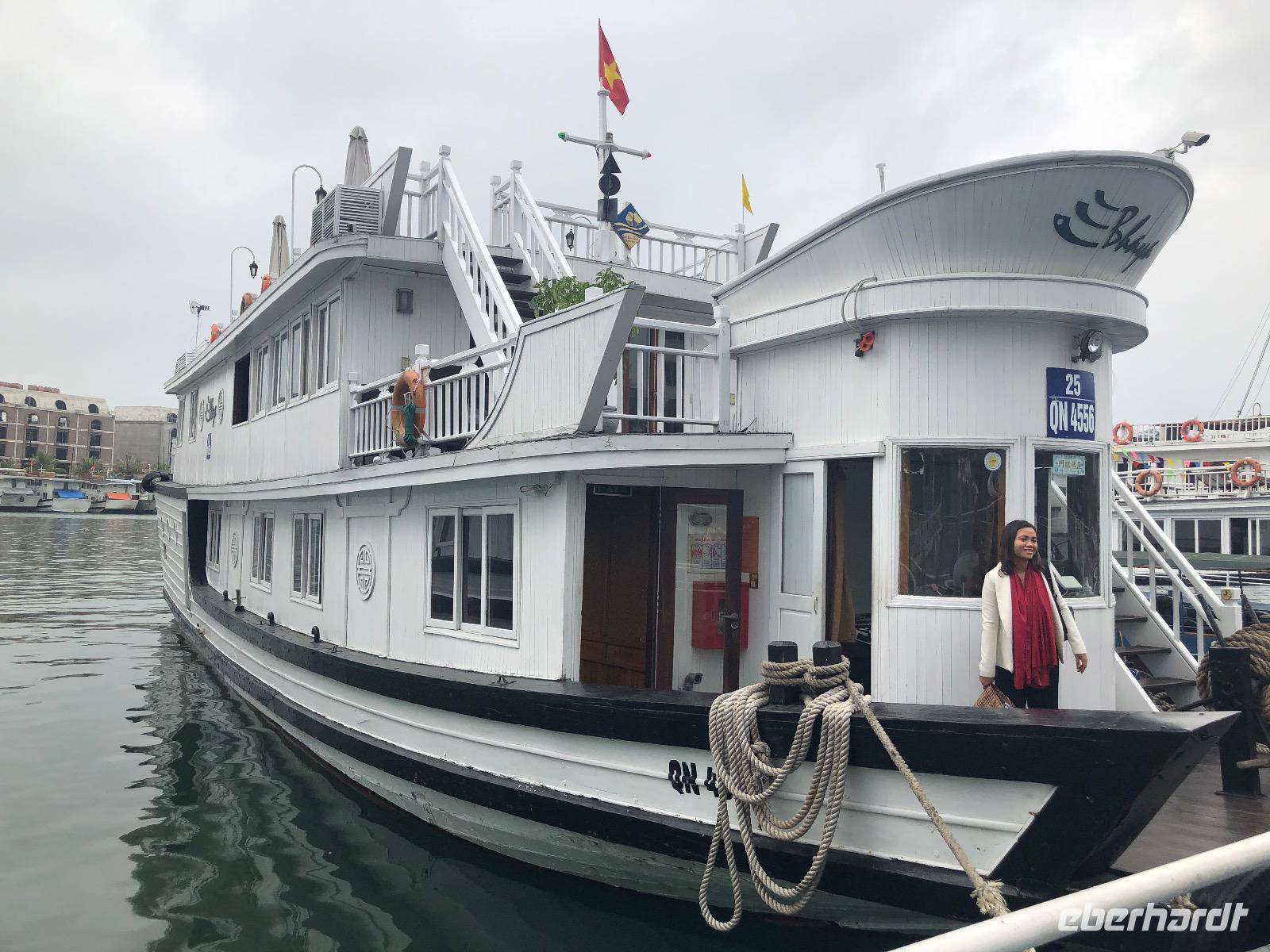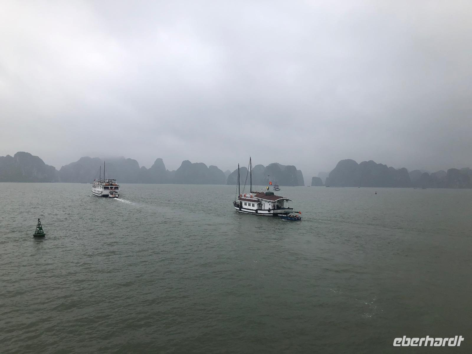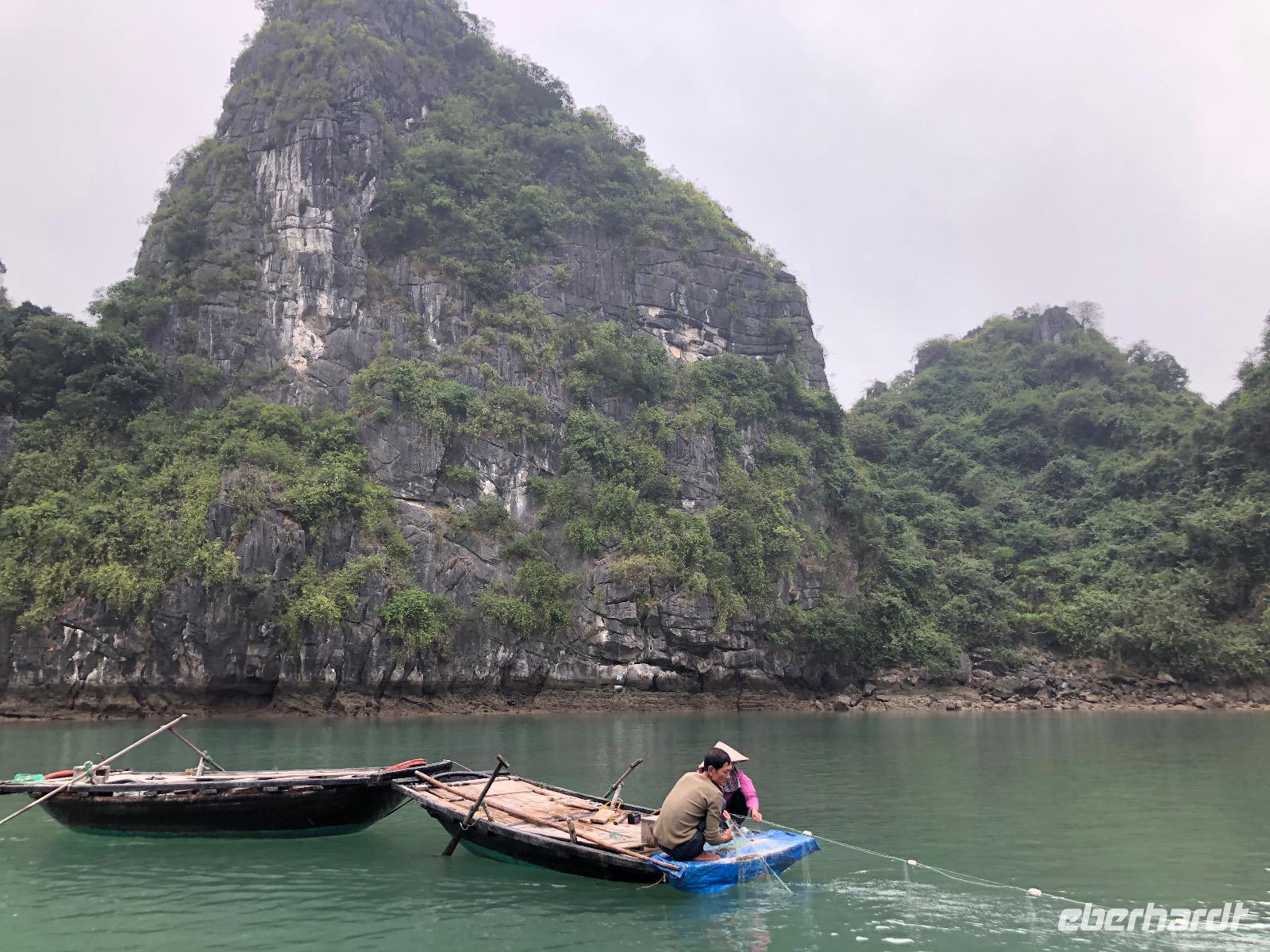 Nun begrüßt uns der Cruise-Manager und begleitet uns auf die Dschunke. Diese hat unsere Eberhardt TRAVEL Petit Gruppe ganz für sich allein. Kaum haben wir unsere Kabinen bezogen, fährt die Dschunke auch schon los. Wir treffen uns an Deck und lassen die traumhafte Kulisse der Halong-Bucht an uns vorbei gleiten. Ha Long bedeutet so viel wie herab steigender Drache und in allen Sagen, die die Entstehung der Bucht beschreiben, spielen Drachen die Hauptrolle. Jetzt wissen wir auch, warum. Die runden Felskuppelchen, die aus dem Wasser ragen, sehen tatsächlich aus, wie der Rücken eines untergegangenen Drachens. Dazu kommen die Nebelschwaden, die über der Bucht liegen und ein mystisches Ambiente zaubern. Ach, ist das schön. Einmal tief durchatmen und glücklich sein.