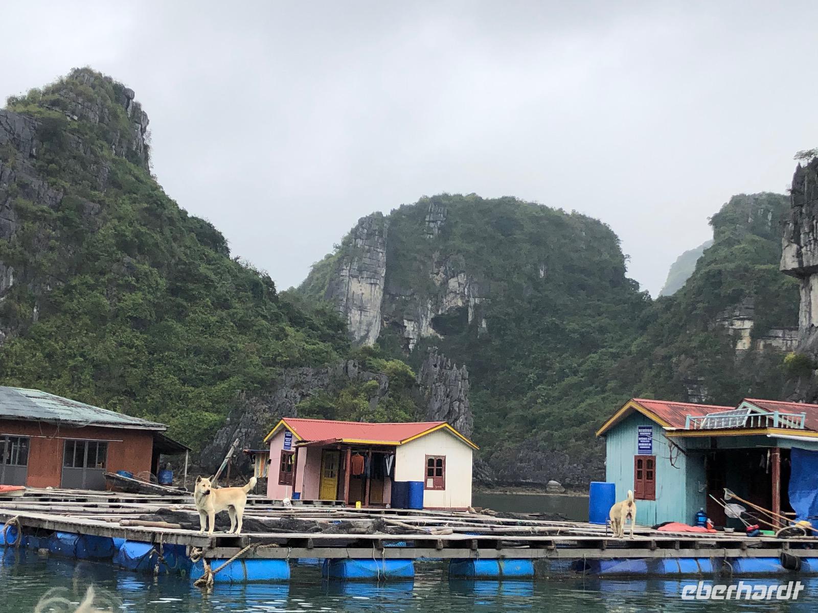 Nun werden wir zum Mittagessen gebeten. Es ist appetitlich angerichtet und vorrangig gibt es Meeresfrüchte. Nach einer ausgedehnten Mittagspause besuchen wir ein Schwimmendes Dorf. Davon gab es früher viele. Sie wurden von großen Unternehmen eingerichtet und die Bewohner lebten von Fischfang und der Zucht von Austern und anderem Meeresgetier. Es gab eine Schule für die Kinder und ein Gemeindehaus. Heute sind fast alle schwimmenden Dörfer verlassen, die Bewohner sind ans Land zurück gekehrt.