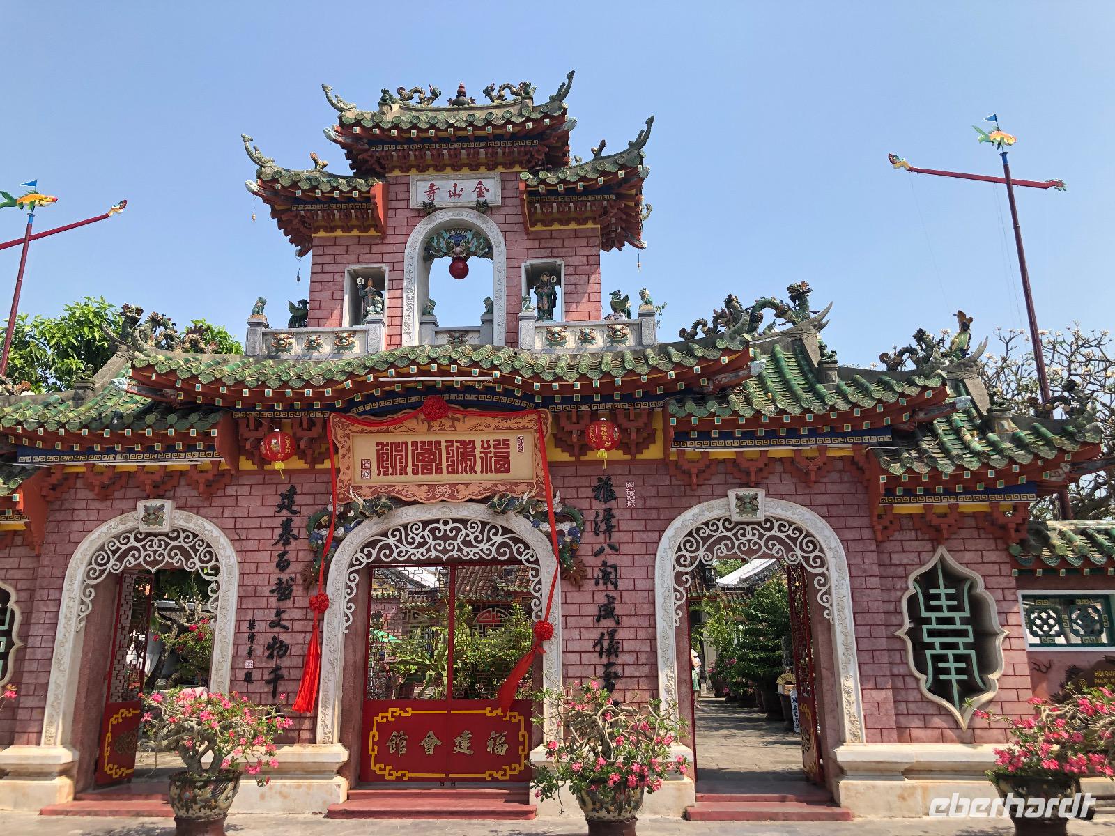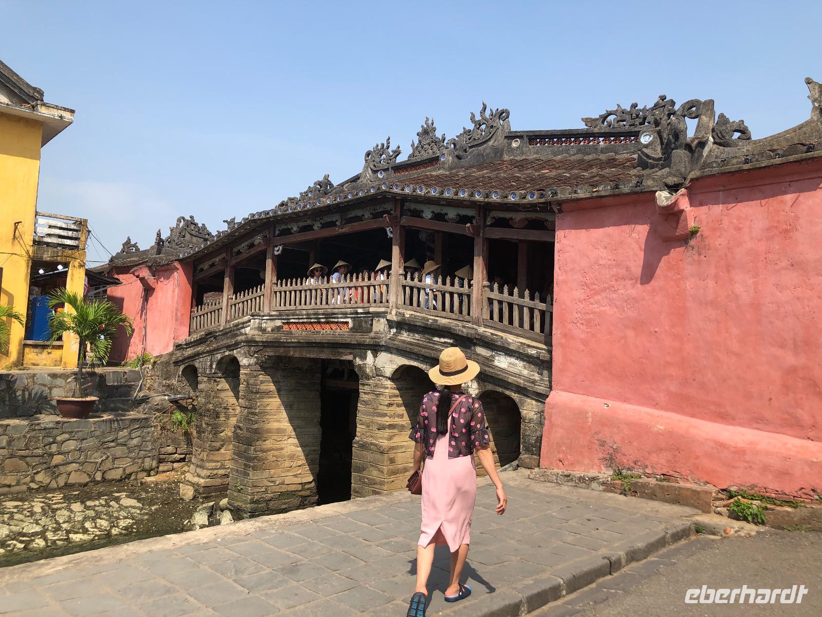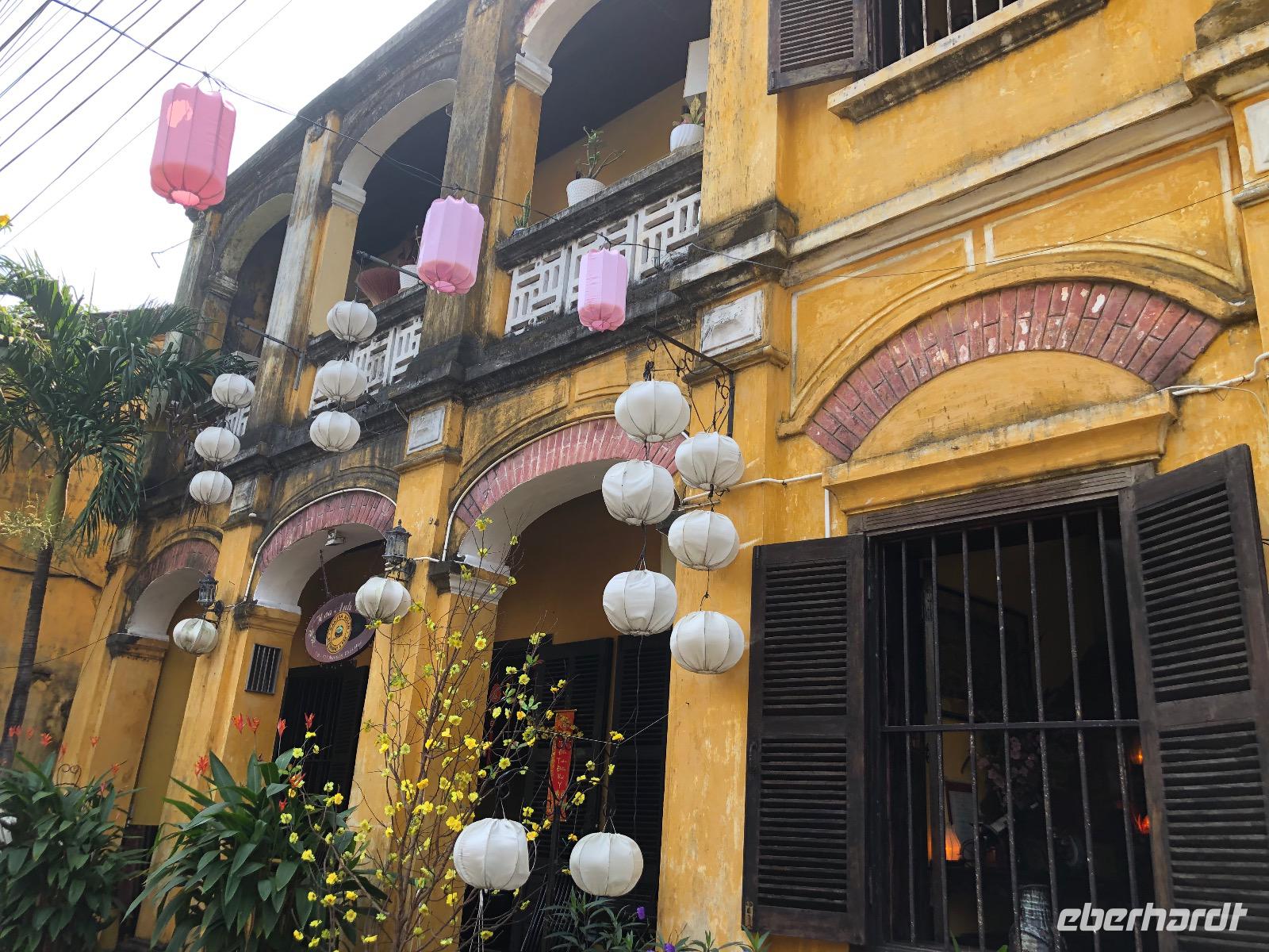 Wir können ausschlafen. Erst um Viertel vor Zehn (oder auch Dreiviertel Zehn :-)) treffen wir uns zu unserem Tagesausflug. Ein Bus bringt uns nach Hoi An, wo wir mit unserem örtlichen Reiseleiter Cuon die Stadt erkunden. Hoi An blieb als einzige Stadt im Vietnamkrieg unzerstört und zählt heute zum UNESCO Welterbe. Wir bummeln durch die Altstadt, die wir über die japanische Brücke erreichen. Heute wird sie von den Vietnamesen Tempelbrücke genannt, japanische Brücke will hier keiner mehr hören. Die Häuser der Altstadt sind mit bunten Lampions geschmückt. Wir besuchen ein Wohnhaus, das über 200 Jahre alt ist und seit acht Generationen der selben Familie gehört. Hier sehen wir auch die typischen holzgeschnitzten Augen, die die Bewohner vor bösen Geistern schützen sollen. Später schlendern wir durch den Zentralen Markt, wo sich das tägliche Leben der Einwohner abspielt.