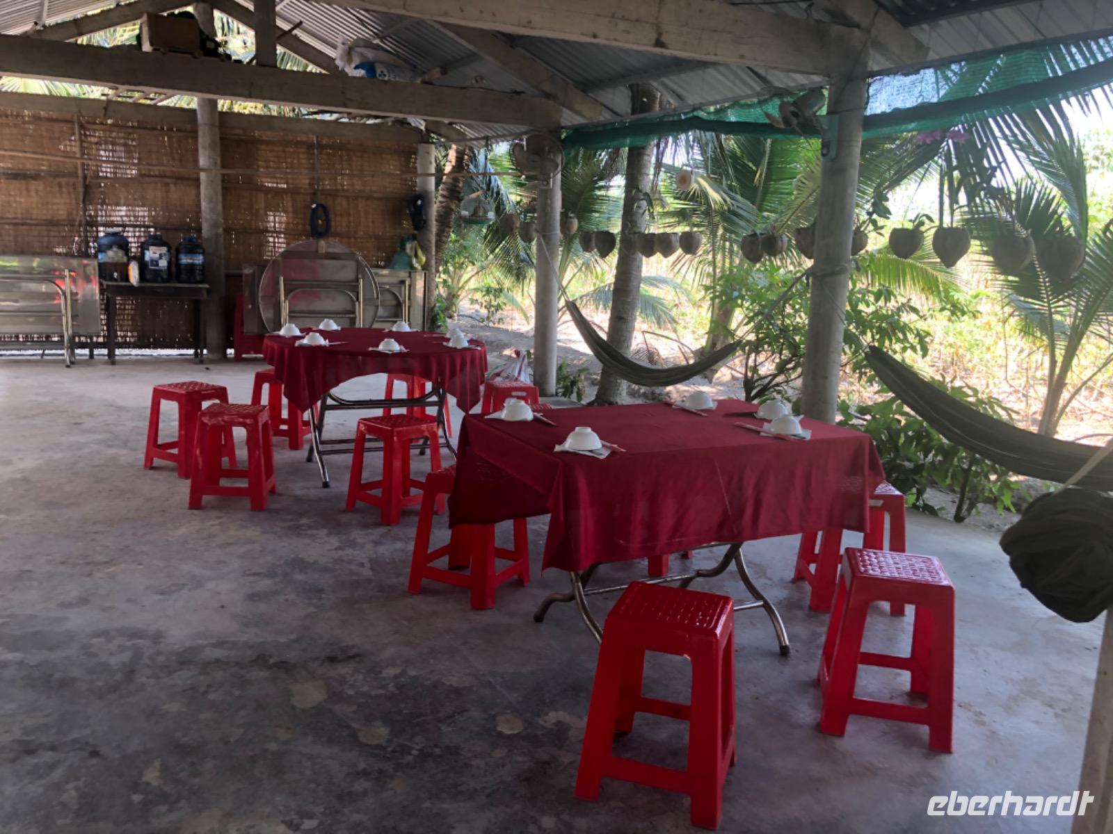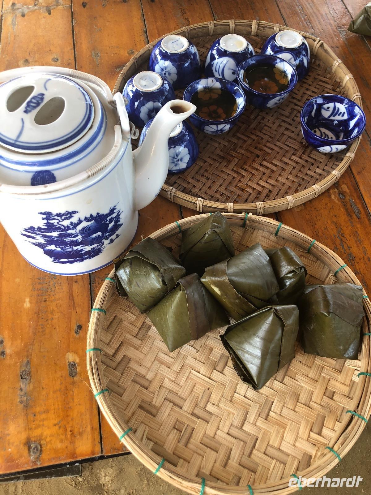 Es ist nicht mehr weit bis zum Hafen, aber immer noch Zeit bis zum Einchecken. Wir werden in einem Café platziert und Diep spendiert für jeden einen Reisschnaps.