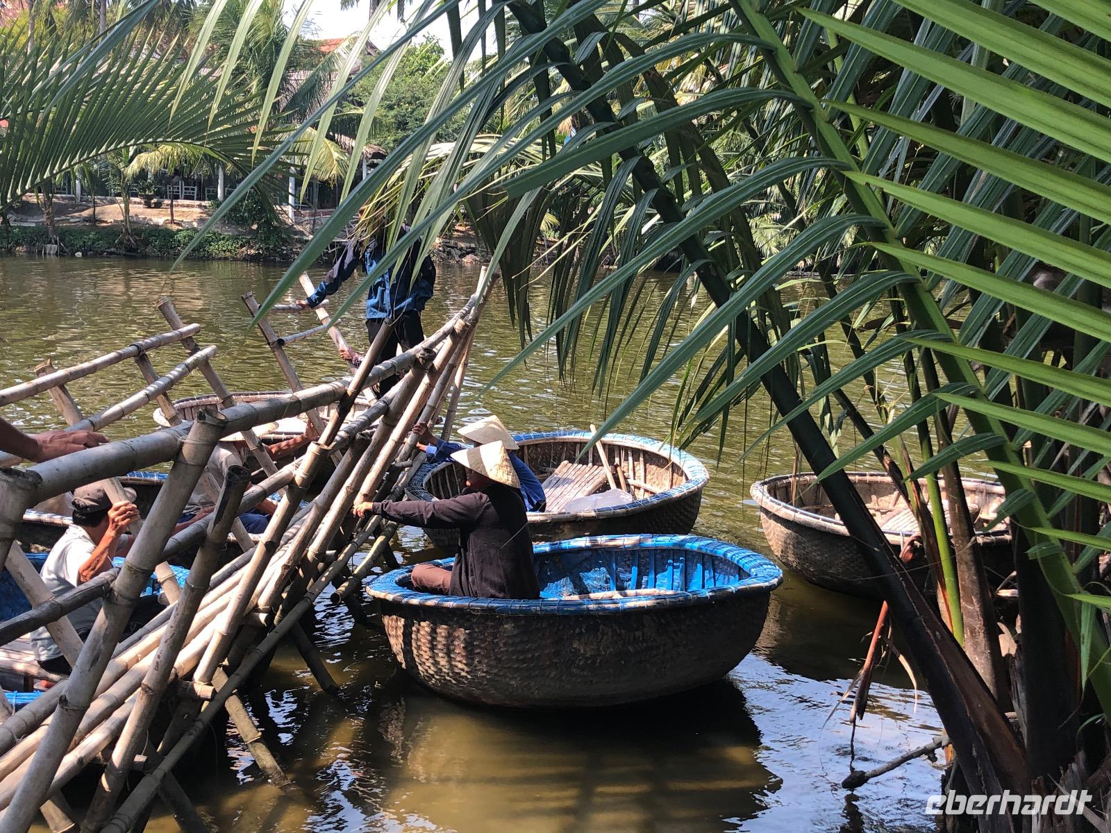 Anschließend werden wir mit Fahrrädern ausgestattet. Wir fahren in ein vietnamesisches Dorf. Hier empfängt uns ein Bauer mit Tee und Reiskuchen. Er berichtet uns, wie in seinem Dorf Gemüse angebaut wird. Alles Bio natürlich. Mit Kegelhüten und Bauernjacken ausgestattet, dürfen wir auch ein Beet bearbeiten, mit der Hacke den Boden auflockern und anschließend Pflanzen stecken. Nun geht es für uns zum Fluss, wo uns traditionelle Rundboote erwarten. Wir klettern über die kleine Bambusbrücke, die gerechterweise auch Affenhängebrücke genannt wird. Dorfbewohner fahren uns bis zum Restaurant. Je nach Bedarf können wir beim Rudern mithelfen. Zum Mittagessen erwartet uns ein mehrgängiges Menü mit typisch vietnamesischen Speisen. Die Zubereitung der regionalen Frühlingsrolle wird uns zunächst demonstriert, dann sollen wir selbst an den Herd. Aber so richtig hat keiner mehr Muße und so lassen wir uns eben bedienen. Nach dem üppigen Mahl werden wir mit Elektroautos klimafreundlich zum Hotel zurück gebracht. Der Nachmittag steht zur freien Verfügung. Erst am Abend treffen wir uns wieder, um noch einmal in die Altstadt zu fahren. Wir nutzen den kostenlosen Hotelshuttle, der uns direkt am Eingang der Fußgängerzone absetzt. Durch einmal falsch Abbiegen geraten wir zunächst etwas abseits, finden aber schnell zurück und auch ein gemütliches Restaurant. Bei gutem Essen und netten Gesprächen findet der Abend seinen Ausklang.