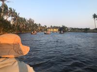 Am Abend werden wir von einer jungen Reiseleiterin abgeholt und fahren mit Elektroautos zum Coco-Fluss. Noch einmal genießen wir die Fahrt in den Rundbooten, diesmal in der Abenddämmerung. Bald erreichen wir unser Ziel - ein Floß, das mitten auf dem Fluss befestigt ist. Auf dem Floß erwartet uns bereits der eingedeckte Tisch. Bald wird es dunkel und die Kerzen werden angezündet. Jedoch ist es sehr windig und so verlöschen diese regelmäßig. Dennoch ist es gemütlich und Koch und Kellnerin geben sich alle Mühe uns nach Strich und Faden zu verwöhnen. Kredenzt wird ein äußerst schmackhaftes Acht-Gänge Menü. Nachdem wir uns rundum satt gegessen haben, fahren wir mit den Elektroautos zurück zum Hotel und lassen den Abend in der Hotelbar ausklingen.