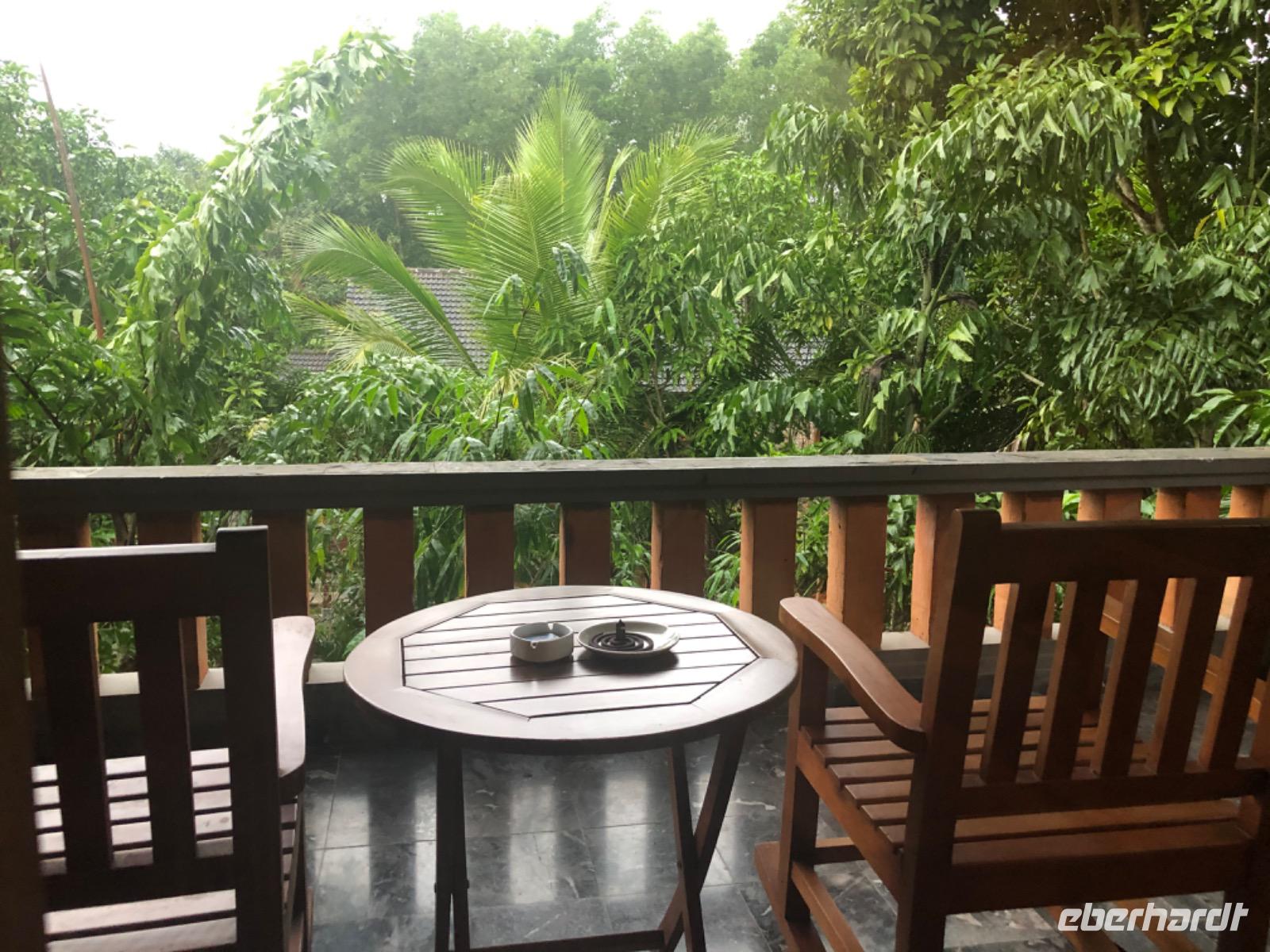 Seit wir in Hue sind regnet es. Der Wolkenpass hat seinem Namen alle Ehre gemacht und sich nach fantastischen Aussichten in Wolken und Nebel gehüllt. Ebenso kommt er seinem Ruf als Wetterscheide nach und trennt uns von Sonnenschein und wolkenlosen Himmel. Das Hotel Pilgrmage Village, in dem wir für zwei Nächte untergebracht sind, fügt sich harmonisch in die Landschaft ein, ein tropischer Garten umgibt die luxuriösen Bungalows. Am Eingang zum Frühstücksrestaurant steht ein freundlicher Vietnamese, der uns den Schirm abnimmt, damit wir beim Zusammenklappen nicht unsere Füße benässen. Das Frühstücksbüffet hat ein Angebot sowohl für einheimische als auch europäische Geschmäcker.