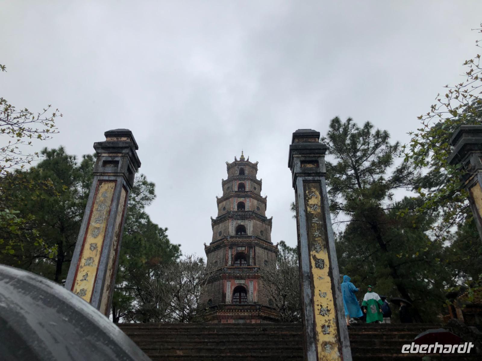 Wir besuchen die Tien Mu Pagode. Ihr siebenstöckiger Turm ist die höchste Pagode in Vietnam. Zur Anlage gehört auch ein buddhistisches Kloster. Hier werden arme und verwaiste Kinder aufgenommen und an ein strukturiertes Leben heran geführt. Später können sie selbst entscheiden, ob sie das Kloster verlassen oder bleiben wollen. Zu den berühmten Ausstellungsstücken des Klosters gehört auch ein altes Auto, mit dem sich ein Mönch 1963 nach Saigon fahren ließ und sich dort öffentlich verbrannte. Damit demonstrierte er gegen die Unterdrückung des Buddhismus durch die damalige Regierung. Seine Aktion hatte zur Folge, dass die USA ihre Marionette in der Regierung fallen ließ und eine neue Politik verfolgte.