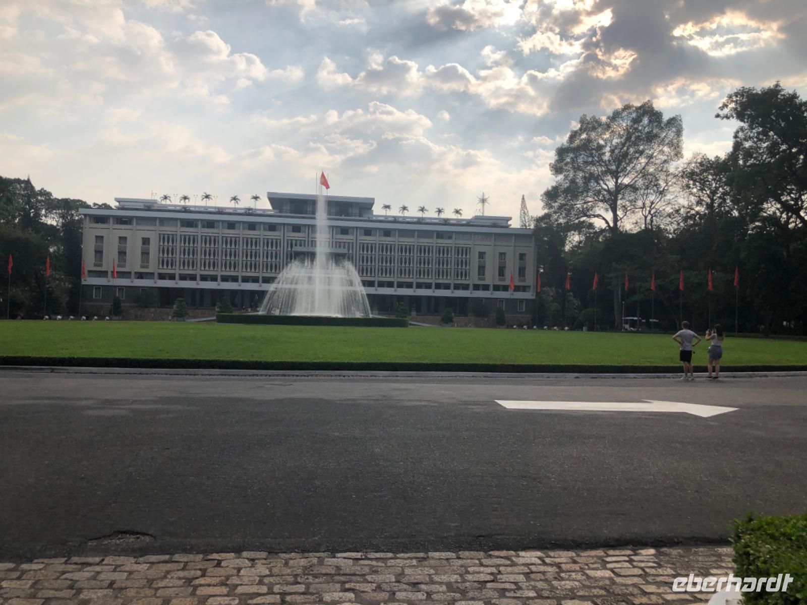 Wir fangen an mit einem Fotostopp am Wiedervereinigungspalast, ein dreistöckiges, eher modernes Gebäude, das bis 1975 als Präsidentenwohnsitz diente. Der Palast hat mehr als einhundert Zimmer, auf dem Dach befindet sich ein Hubschrauberlandeplatz.Das Gebäude wurde 1975 zum Zentrum der Kämpfe um Saigon. Am 30. April 1975 walzte ein nordvietnamesischer Panzer das Eisentor nieder und kommunistische Soldaten besetzten den Palast. Im folgenden Winter fanden hier die Verhandlungen über die Wiedervereinigung statt, woher auch der Name stammt.