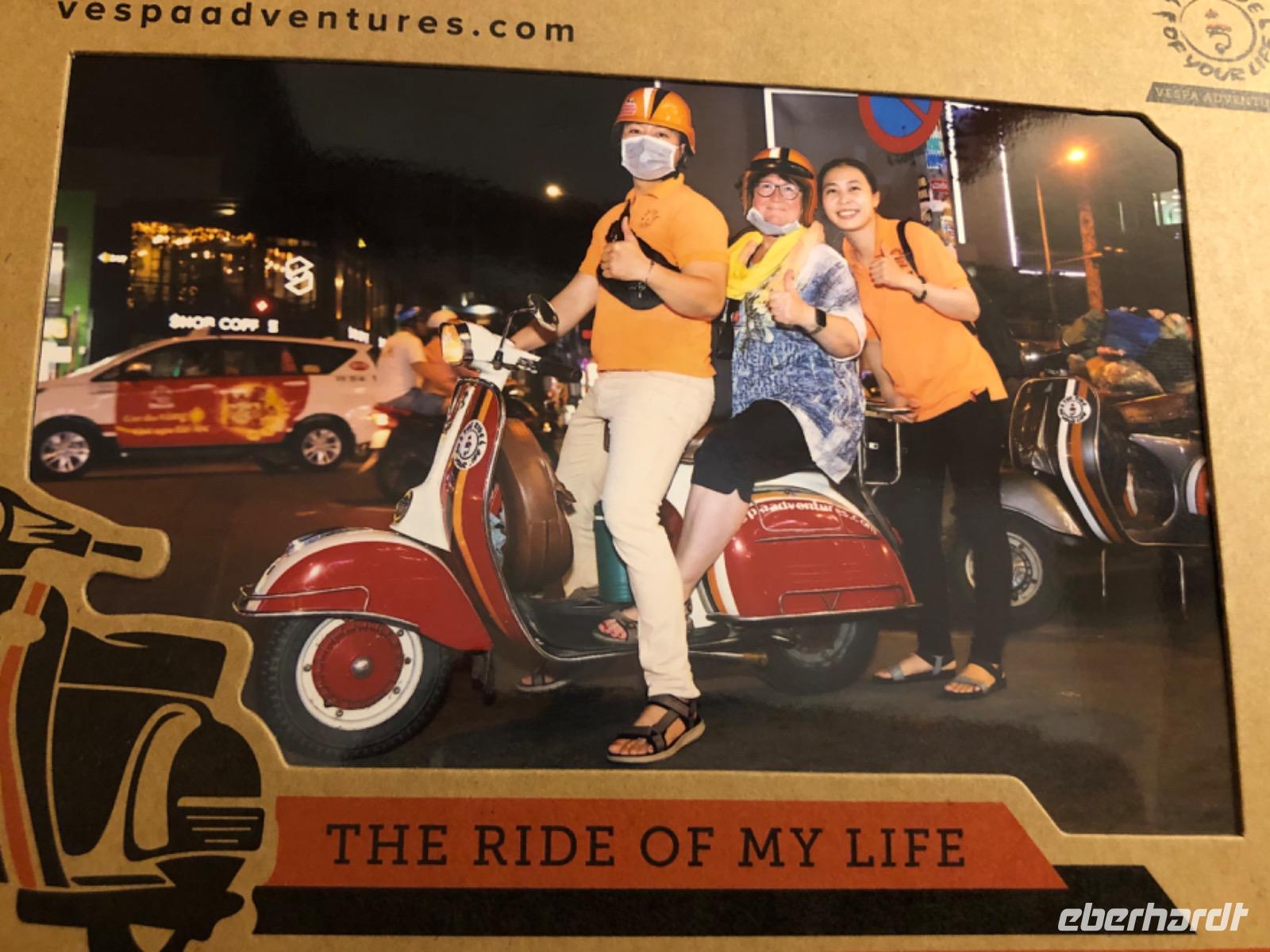 Wir kommen vorbei an der großen Baustelle für die erste U-Bahn in Vietnam und am Rathaus. Dann können wir uns in die klimaanlagengekühlten Zimmer unseres Hotels zurück ziehen. Am Abend treffen wir uns zu einem besonderen Ausflug wieder. Wir unternehmen eine Vespa Tour durch das abendliche Saigon. Kathy ist unsere Englisch sprechende Guide für die Tour. Jeder Gast bekommt seinen eigenen Fahrer zugewiesen, alle bekommen orangene Helme und einen Mundschutz. Dann geht es los. Unsere Fahrer mischen sich in den Lindwurm an Mopeds und Motorrädern, der sich Tag und Nacht durch Saigon windet. Wir kehren in ein lokales Restaurant ein, wo wir ein erstes Getränk (nach Wahl) bekommen und ein paar Schips naschen. Weiter geht es durch die nächtliche Stadt. In einem Seafood Restaurant gibt es Krabben, Muscheln und Froschschenkel sowie weitere Getränke. Eine typische Mahlzeit wird uns am nächsten Stopp serviert. In großen Pfannen werden hauchdünne Pancaces zubereitet, die anschließend in Unmengen von Blättern gewickelt und so verspeist werden. Das Ganze nennt sich Banh Xeo. Zwischen den Mahlzeiten fahren wir jeweils ca. fünfzehn Minuten mit den Vespas. Wir werden immer sicherer und immer weniger ängstlich. Im Hidden Café heißt es, still zu sein und nur der Musik zu lauschen, während wir zum Schluss in der Live Musik Bar von einer lauten Band beschallt werden und nun so in Schwung sind, dass wir uns kaum trennen möchten. Dennoch endet hier die Tour und unsere Vespa-Fahrer bringen uns zurück ins Hotel. Klar, dass wir uns mit einem großzügigen Trinkgeld bedanken.